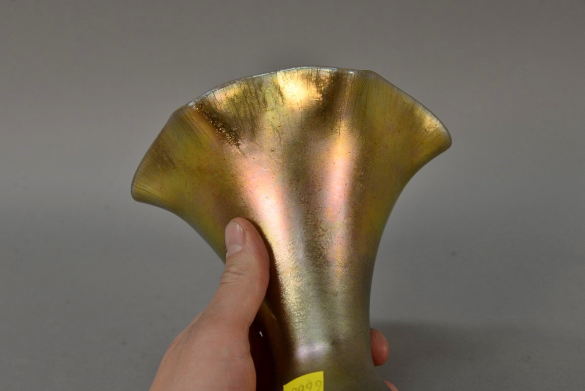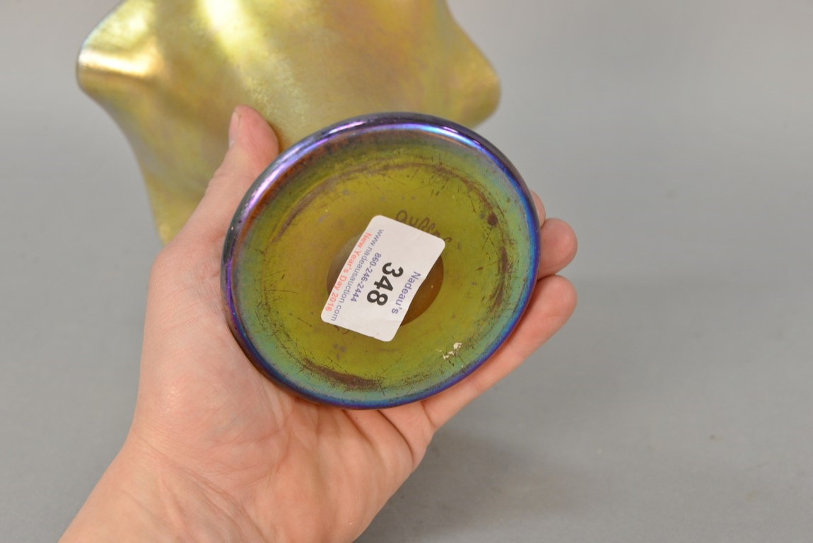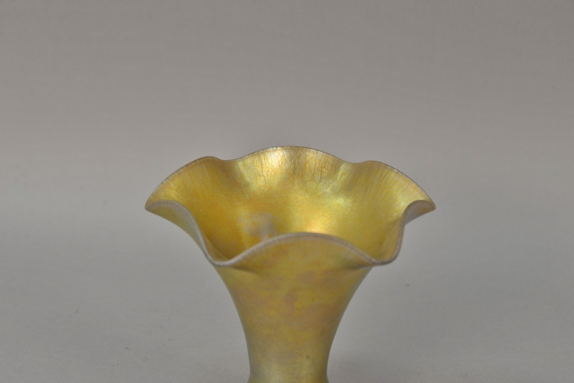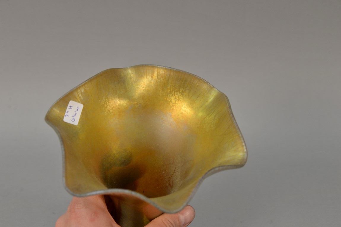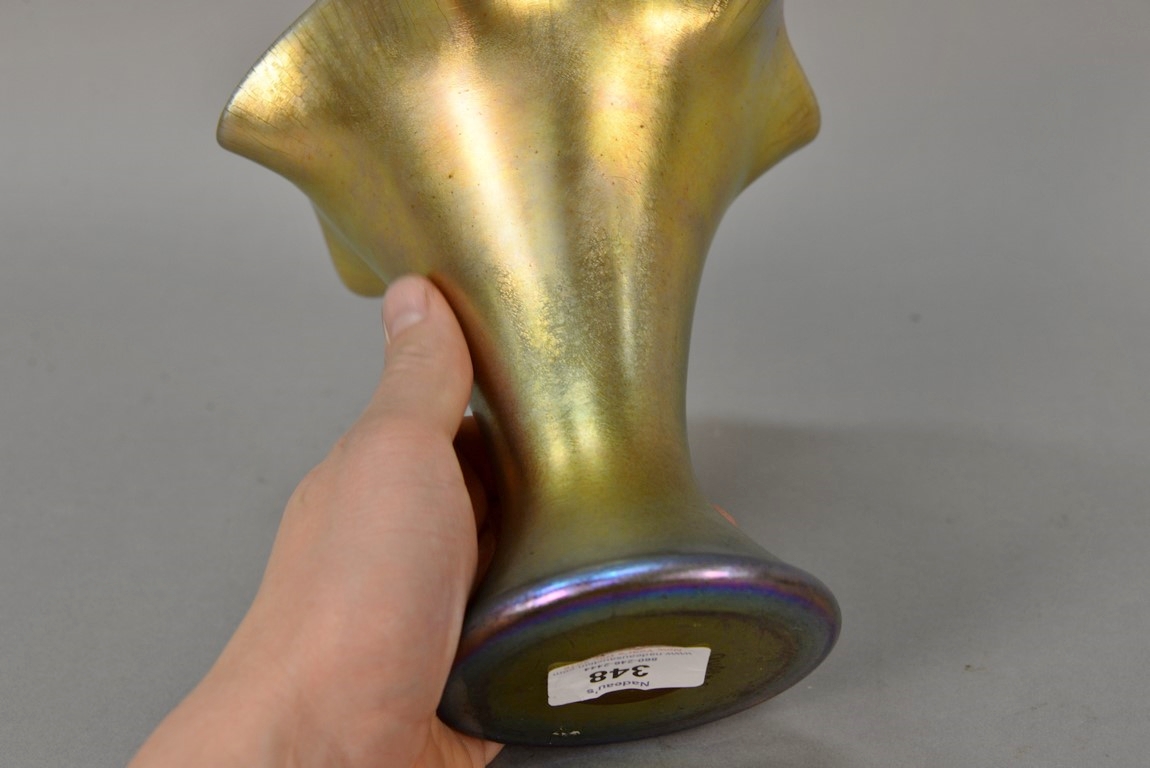 Lot 348: Steuben Aurene iridescent vase with ruffle top, signed and numbered on bottom. ht. 7 in. wd. 6 3/4 in.