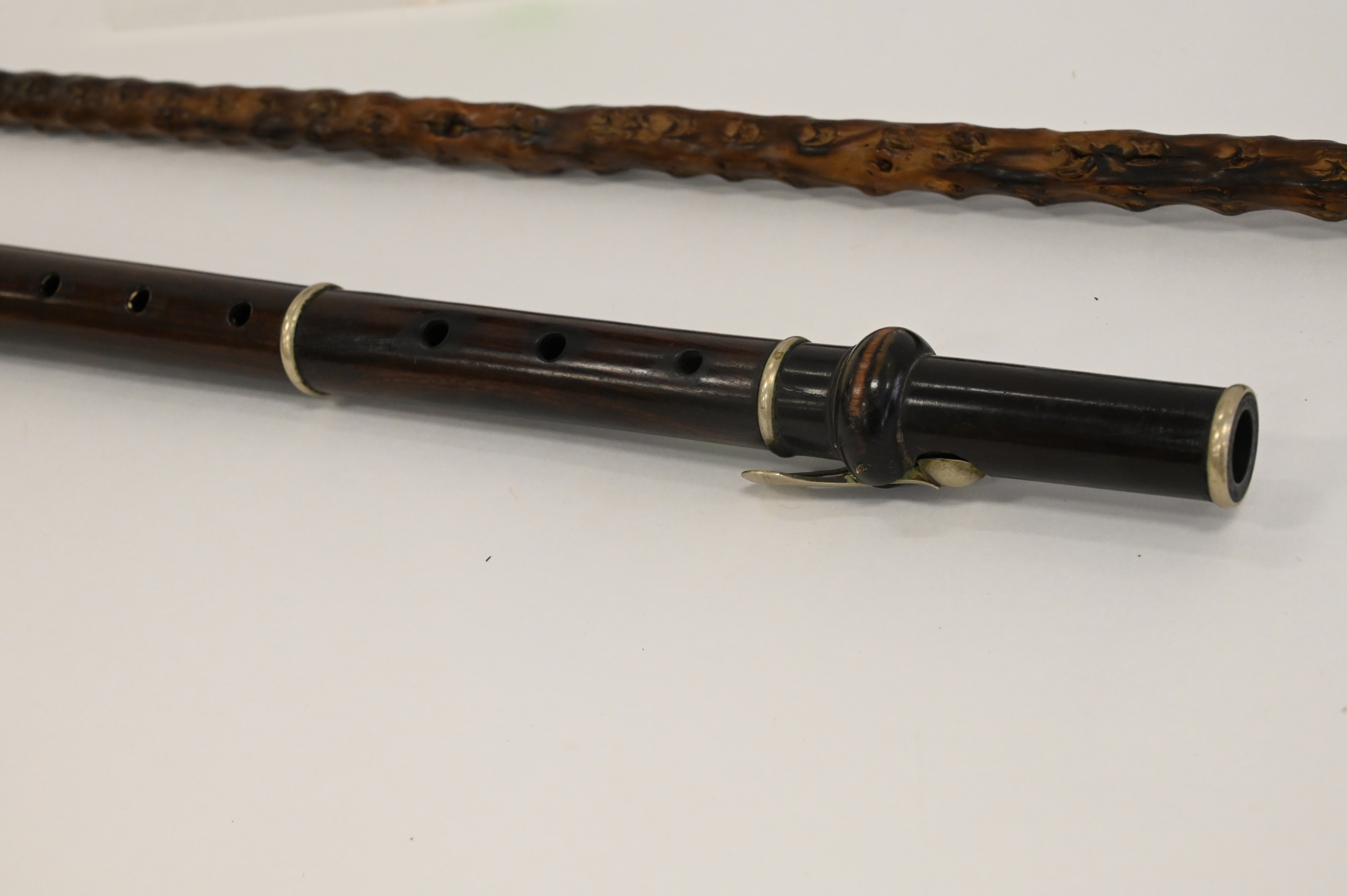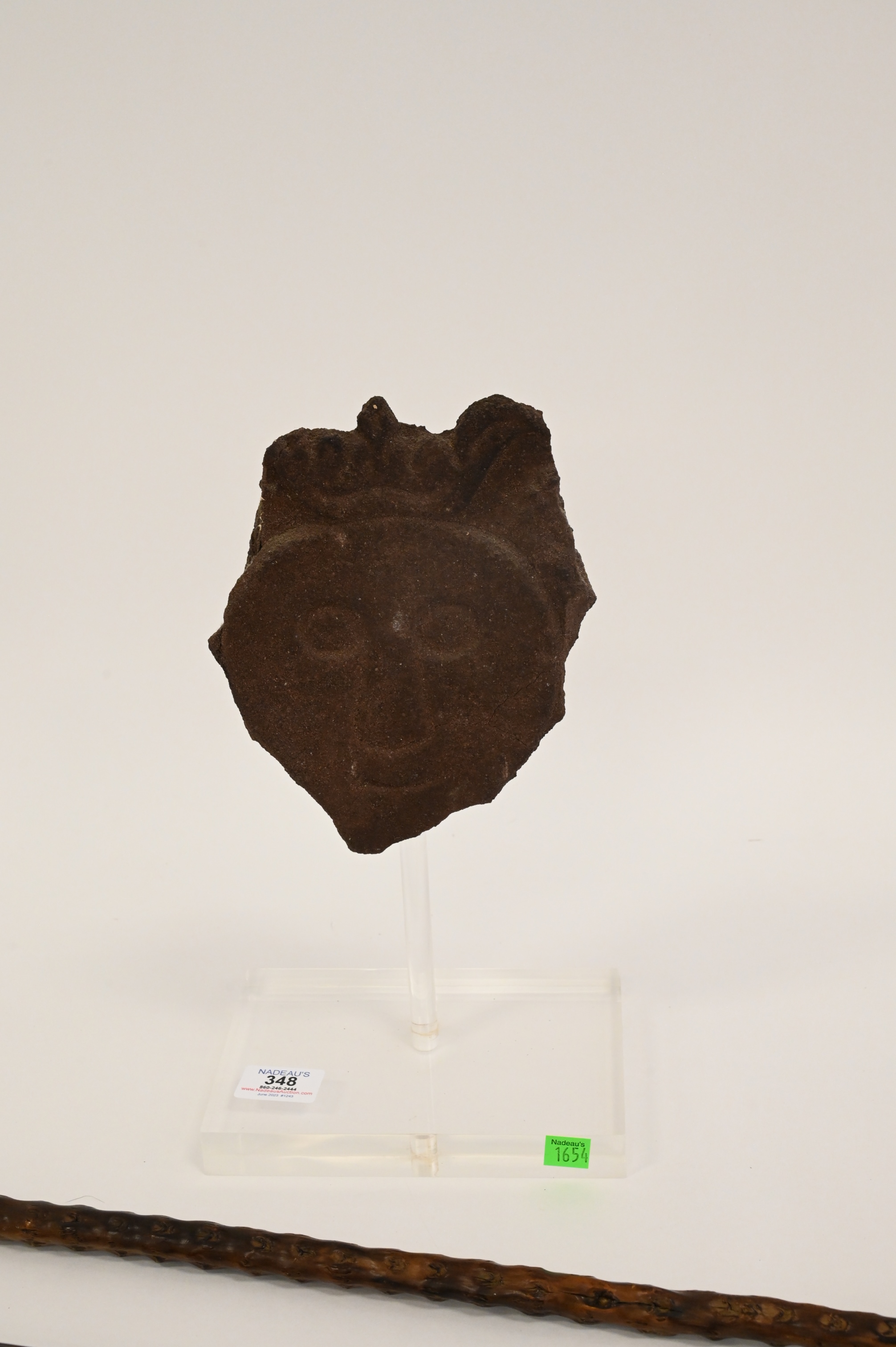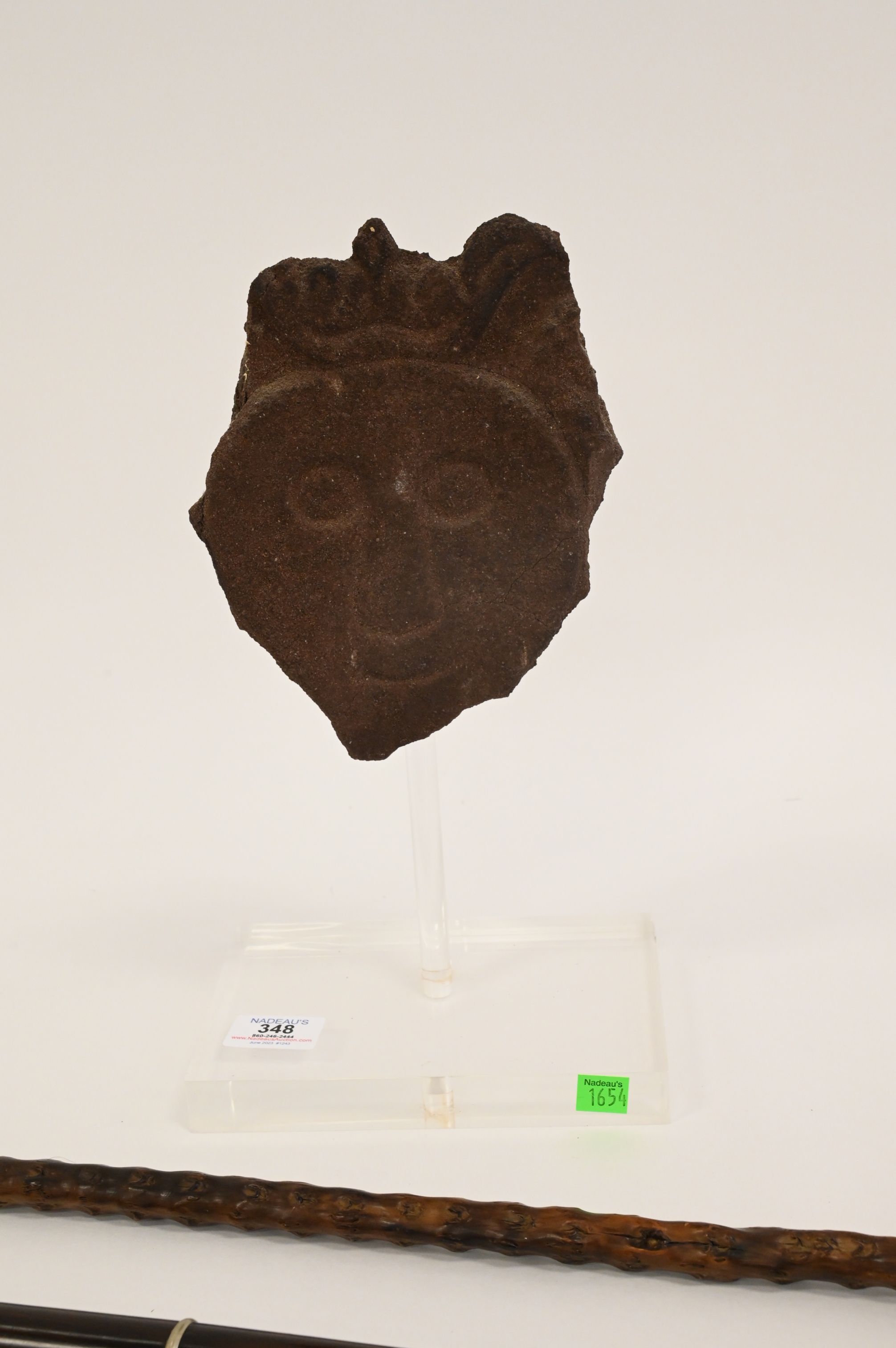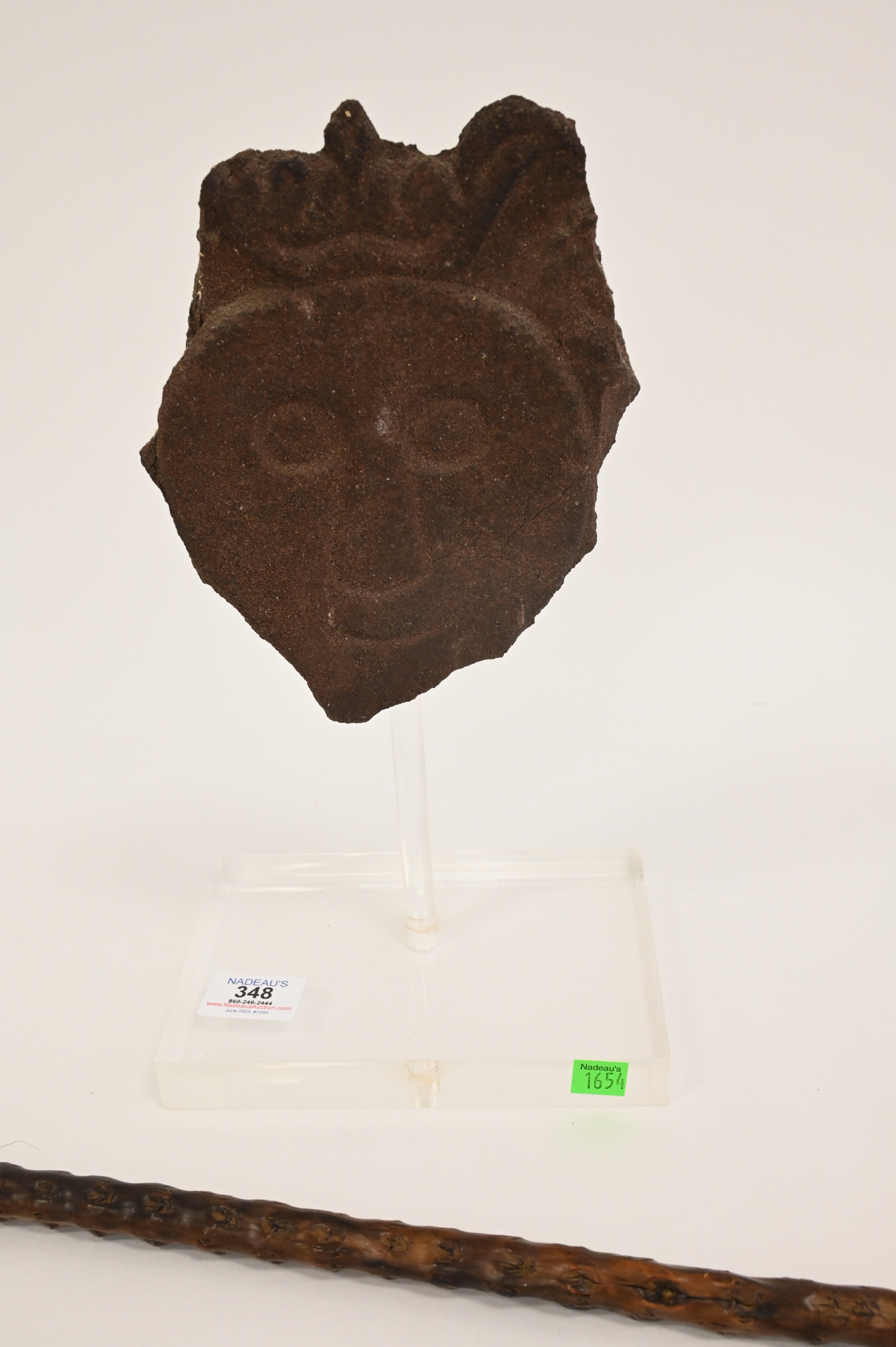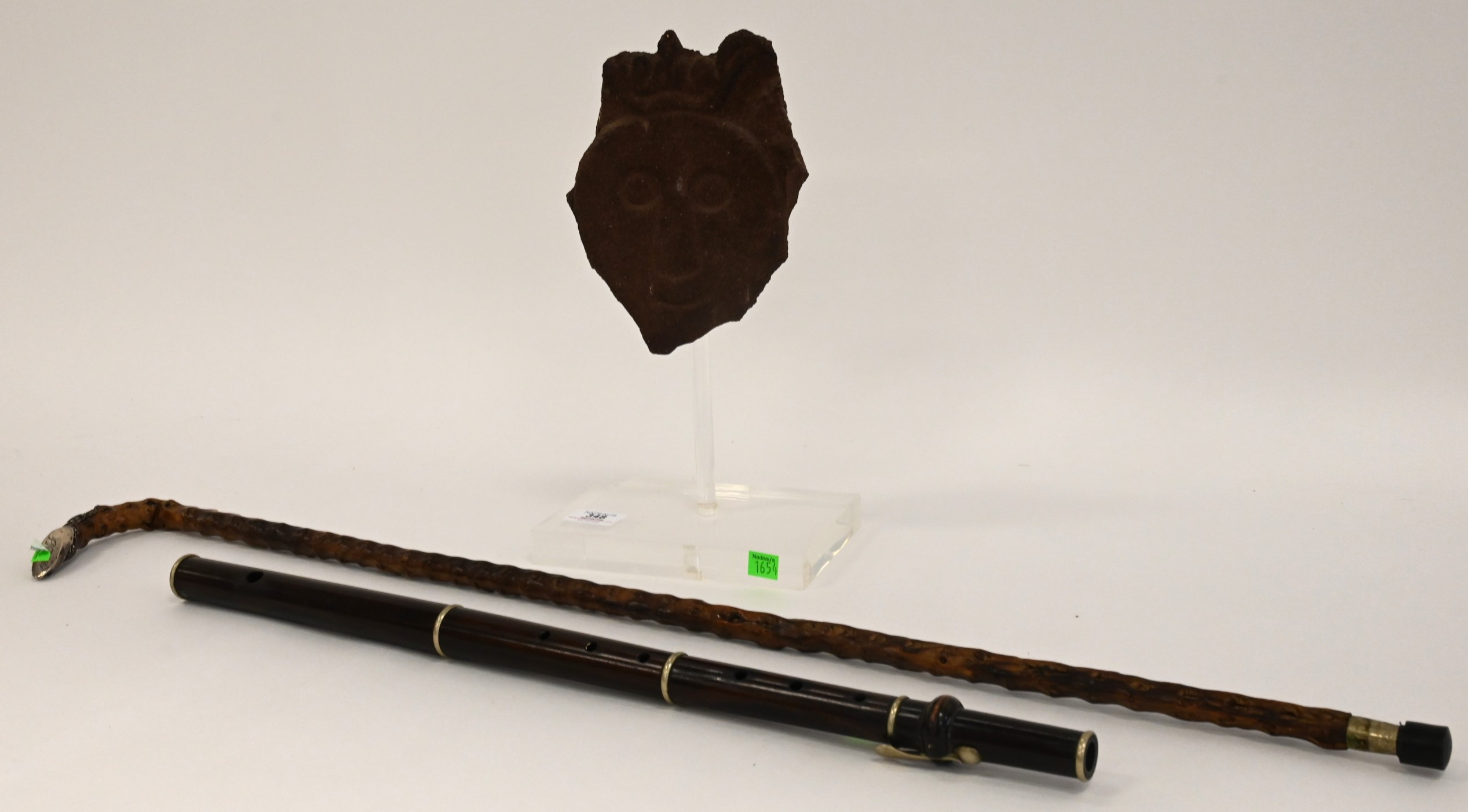 Three Piece Lot, to include Antique Wooden Cane, having monogrammed handle ( length 35 1/2 inches); and a flute (length 23 1/2 inches); along with an early American gravestone head (head only 8 1/2 inches x 6 1/2 inches), Total height 14 inches