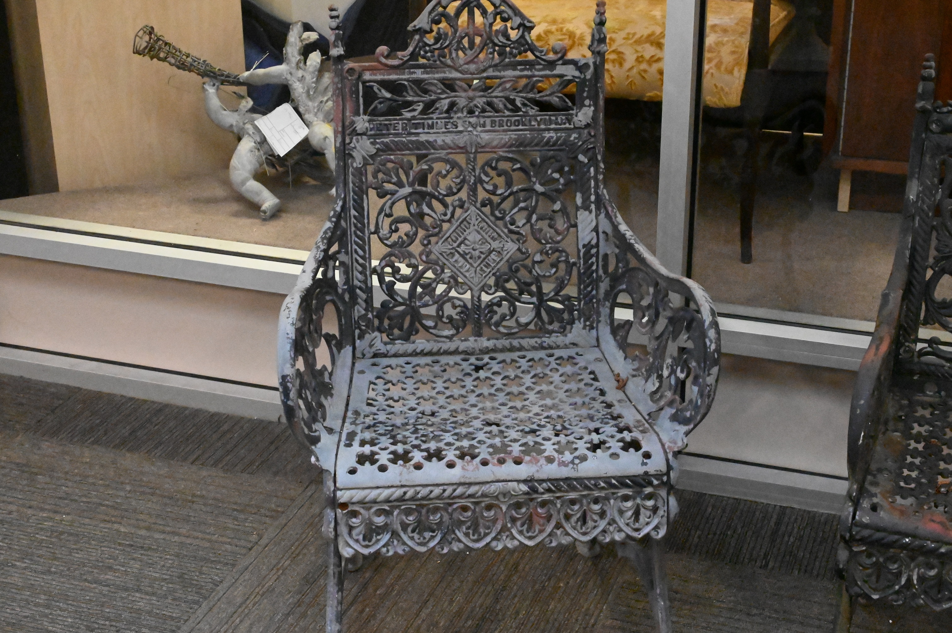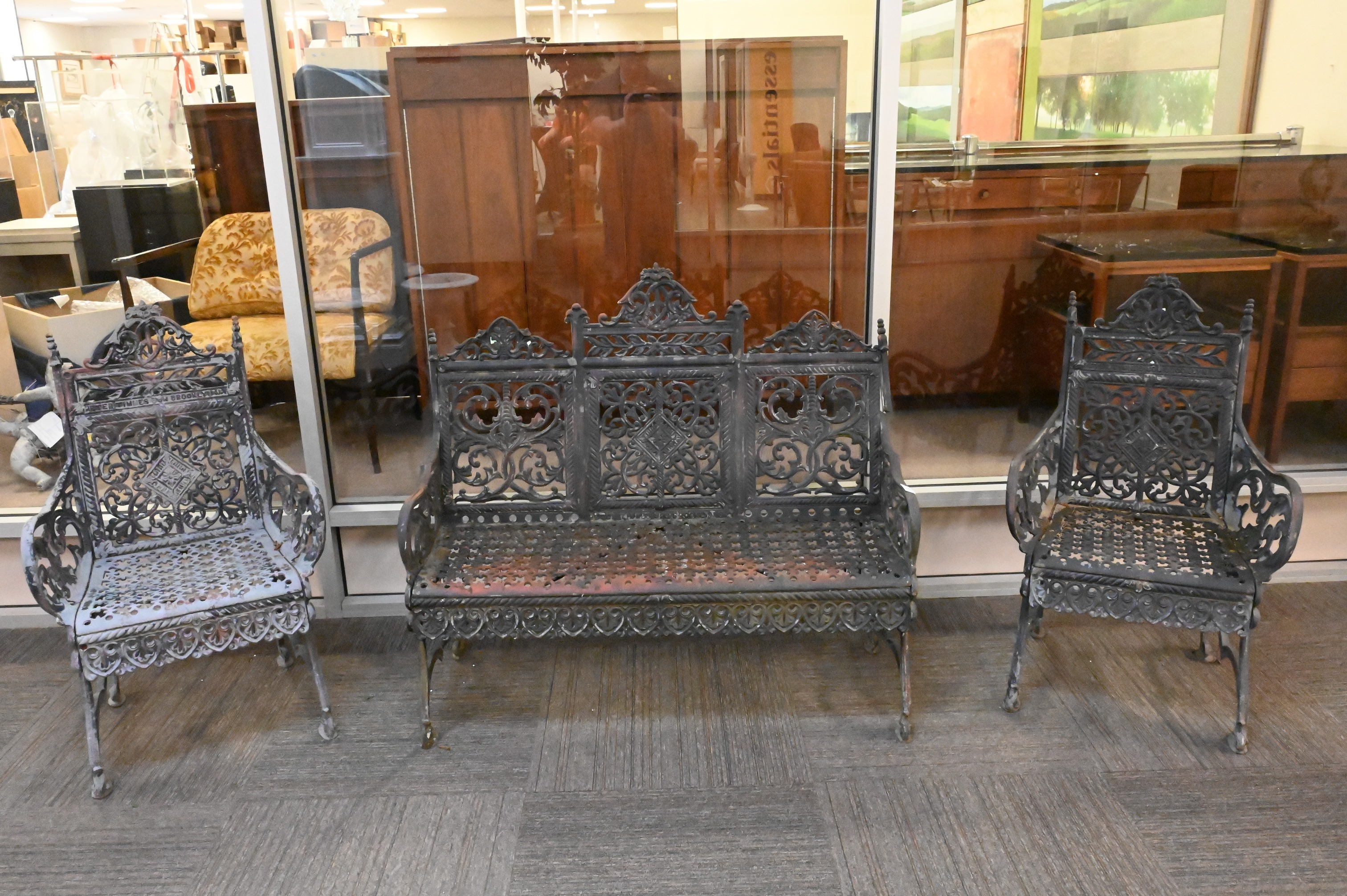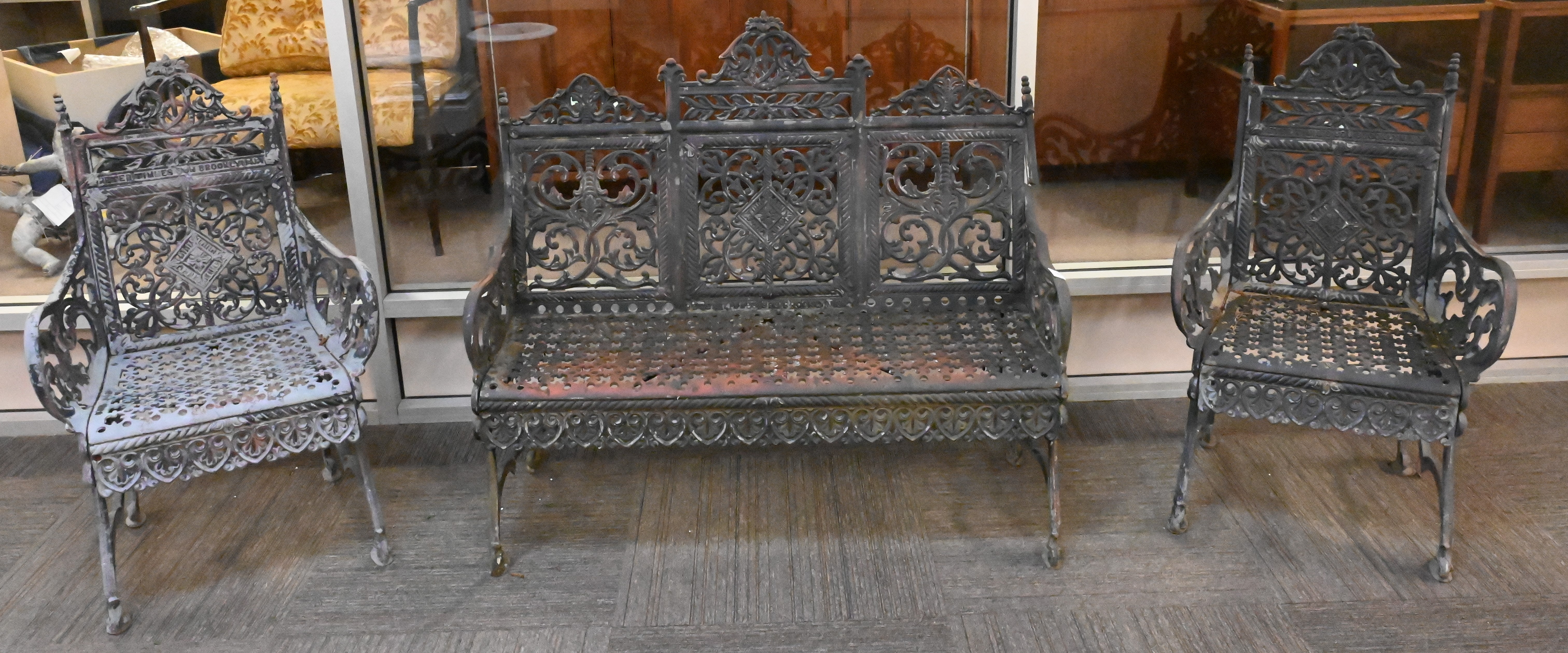 Three Piece Pete Times & Son NY Cast Iron Outdoor Set, to include settee, along with pair of Matory armchairs, settee width 44 inches, height 40 inches.