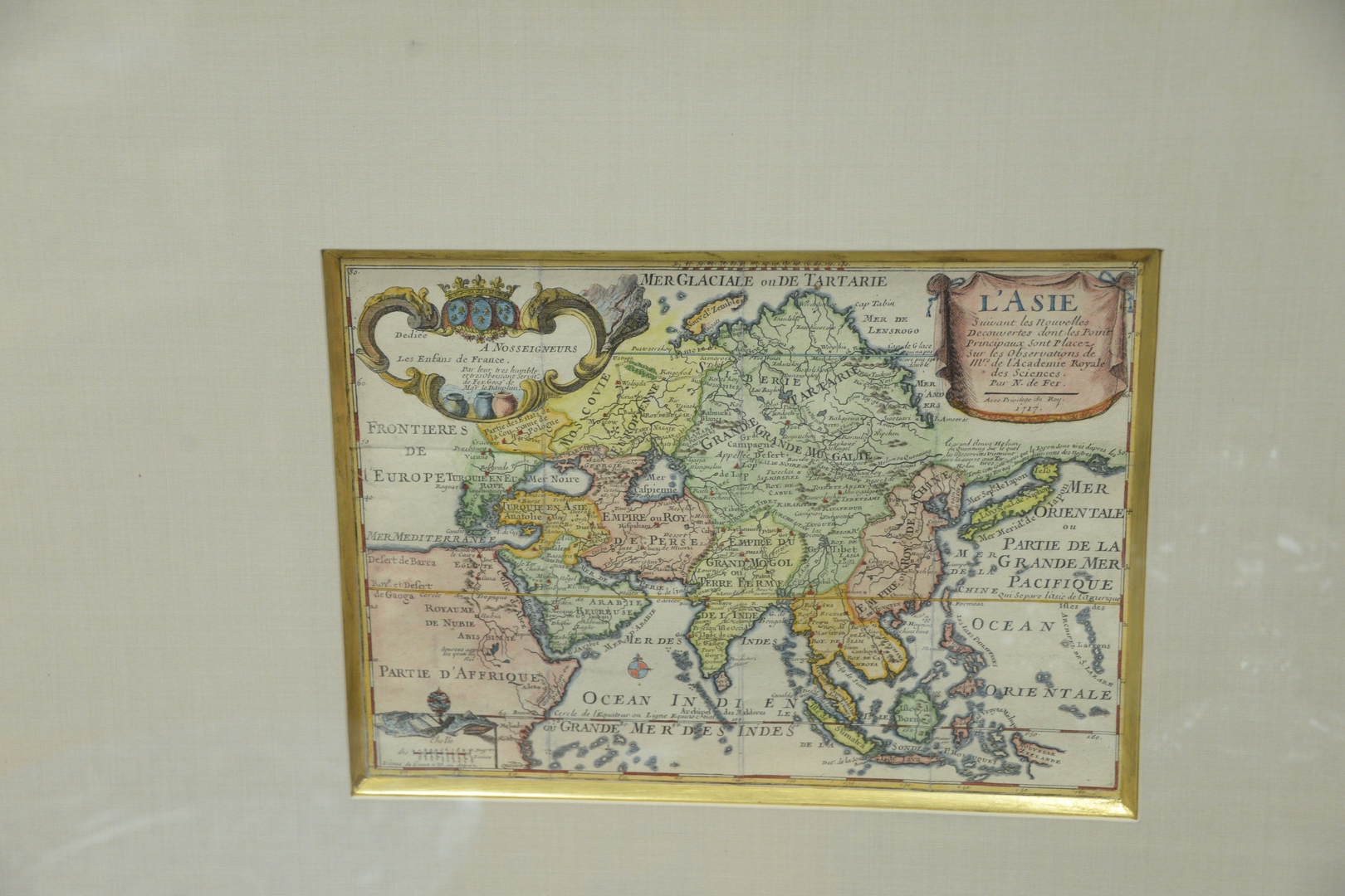 Two Framed Maps, after Nicolas de Fer, to include L’Asie, and L’Amerique Mer Mridionale et Septentrionale, each hand-colored engravings on paper, numbers 159 and 160, sight size: 9 x 12 1/2.