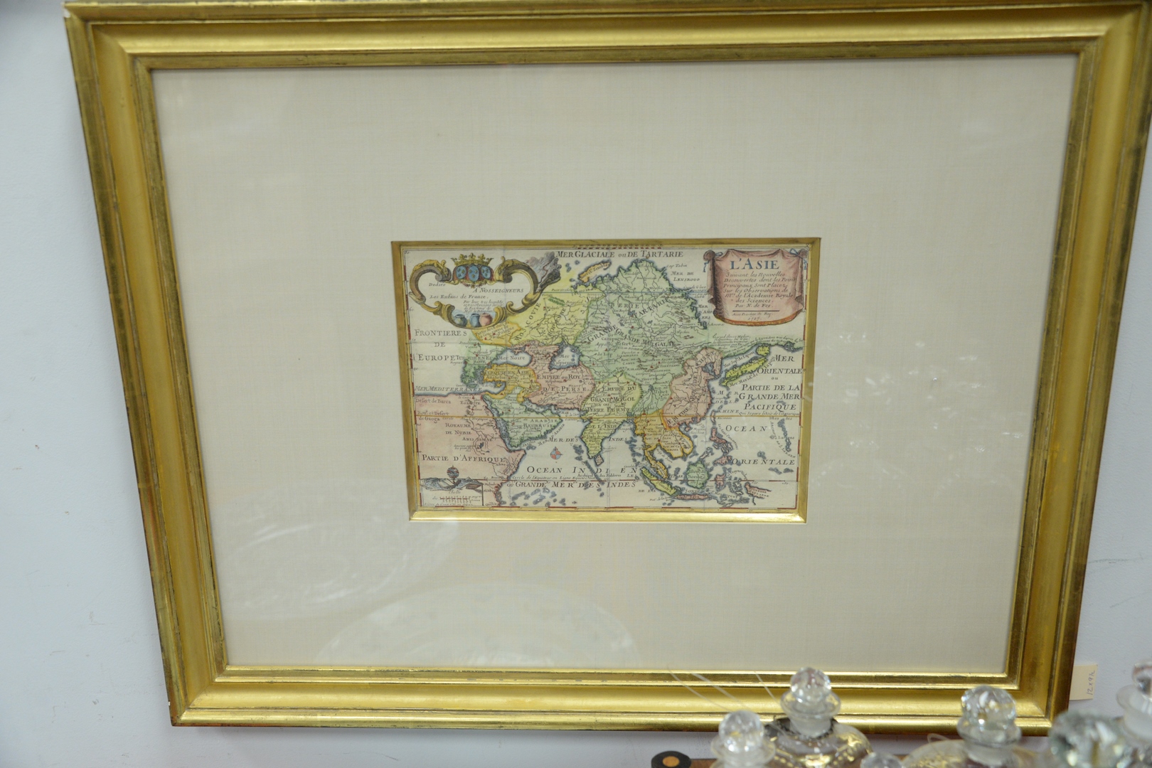 Lot 348: Two Framed Maps, after Nicolas de Fer, to include L’Asie, and L’Amerique Mer Mridionale et Septentrionale, each hand-colored engravings on paper, numbers 159 and 160, sight size: 9 x 12 1/2.