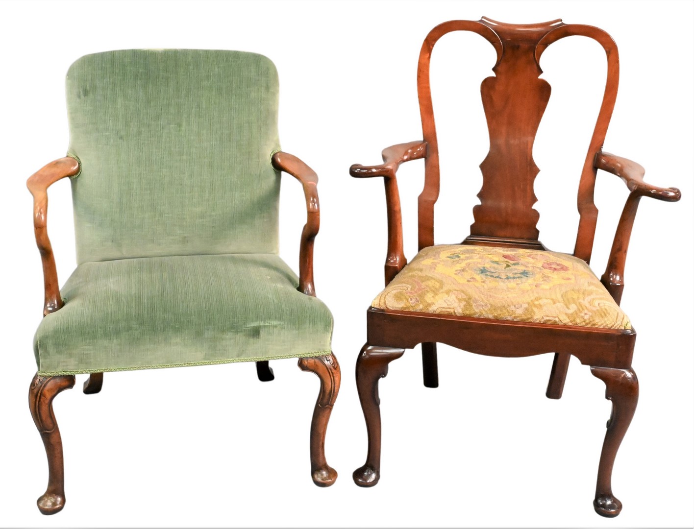 Two Queen Anne Style Mahogany Open Armchairs, to include one having needlepoint slip seat, 19th century; along with one having green upholstery; height 37 inches. .
