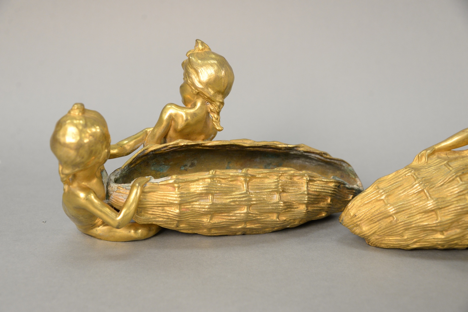 French gilt bronze figural flower baskets, both depicting two girls trying to move the oversized basket