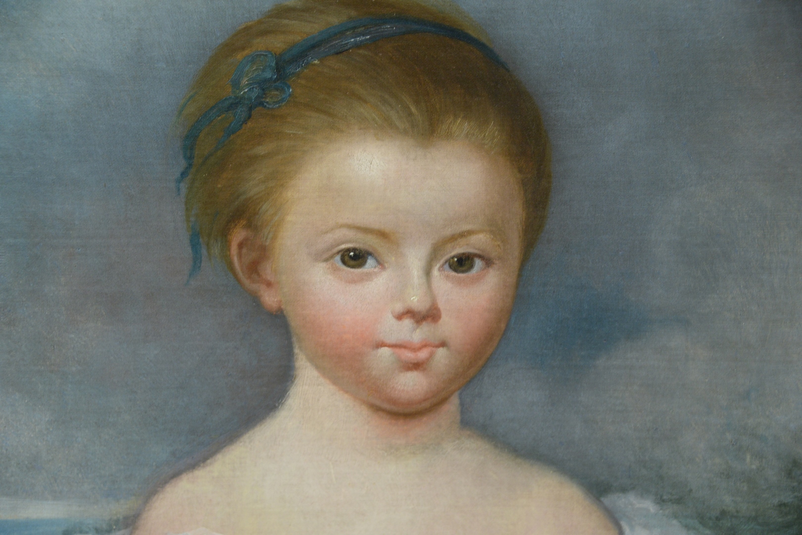 American School 19th Century, portrait of a little girl in a white dress with a blue hair ribbon and flowers in her hand, oil on relined canvas, unsigned, 21 1/4 x 25 1/4.