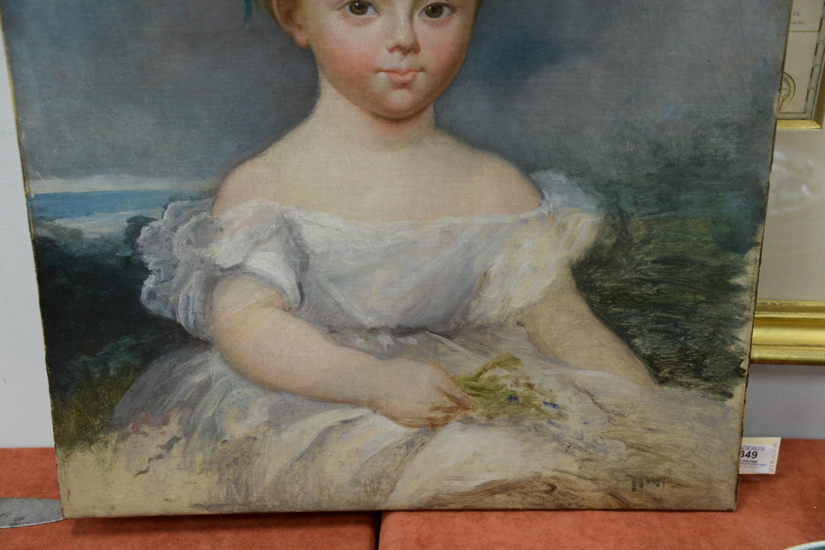 Lot 349: American School 19th Century, portrait of a little girl in a white dress with a blue hair ribbon and flowers in her hand, oil on relined canvas, unsigned, 21 1/4 x 25 1/4.