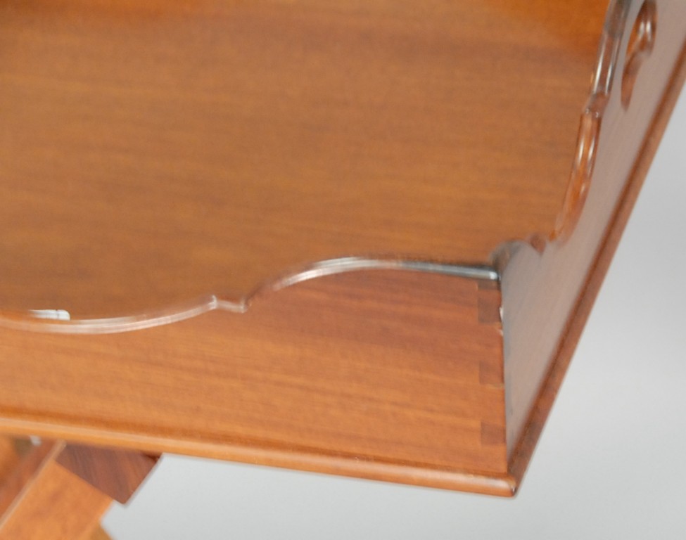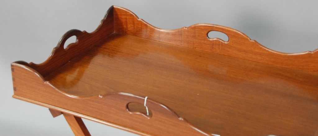 Custom mahogany tray with gallery, handles, and dove tailed corners on folding base. height 34in. width 31in.