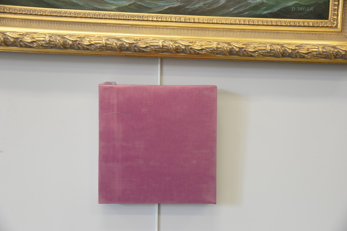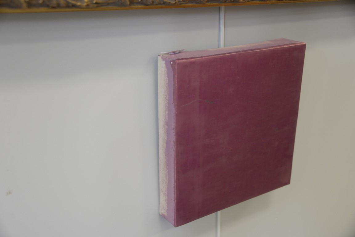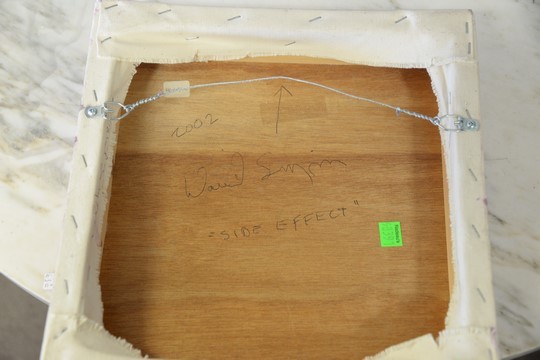 Lot 349: David Simpson 1928 oil on canvas Side Effect signed on back and side of canvas David Simpson 2002. 12 x 12