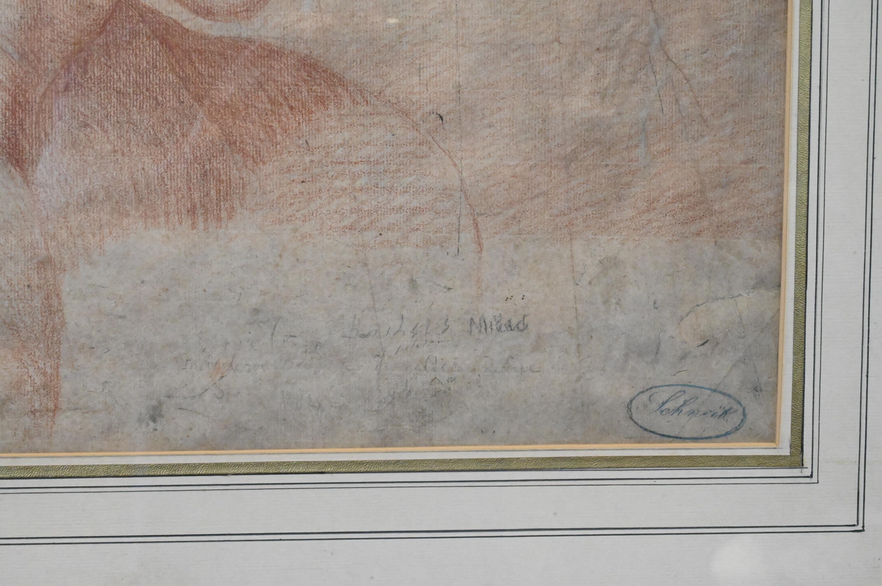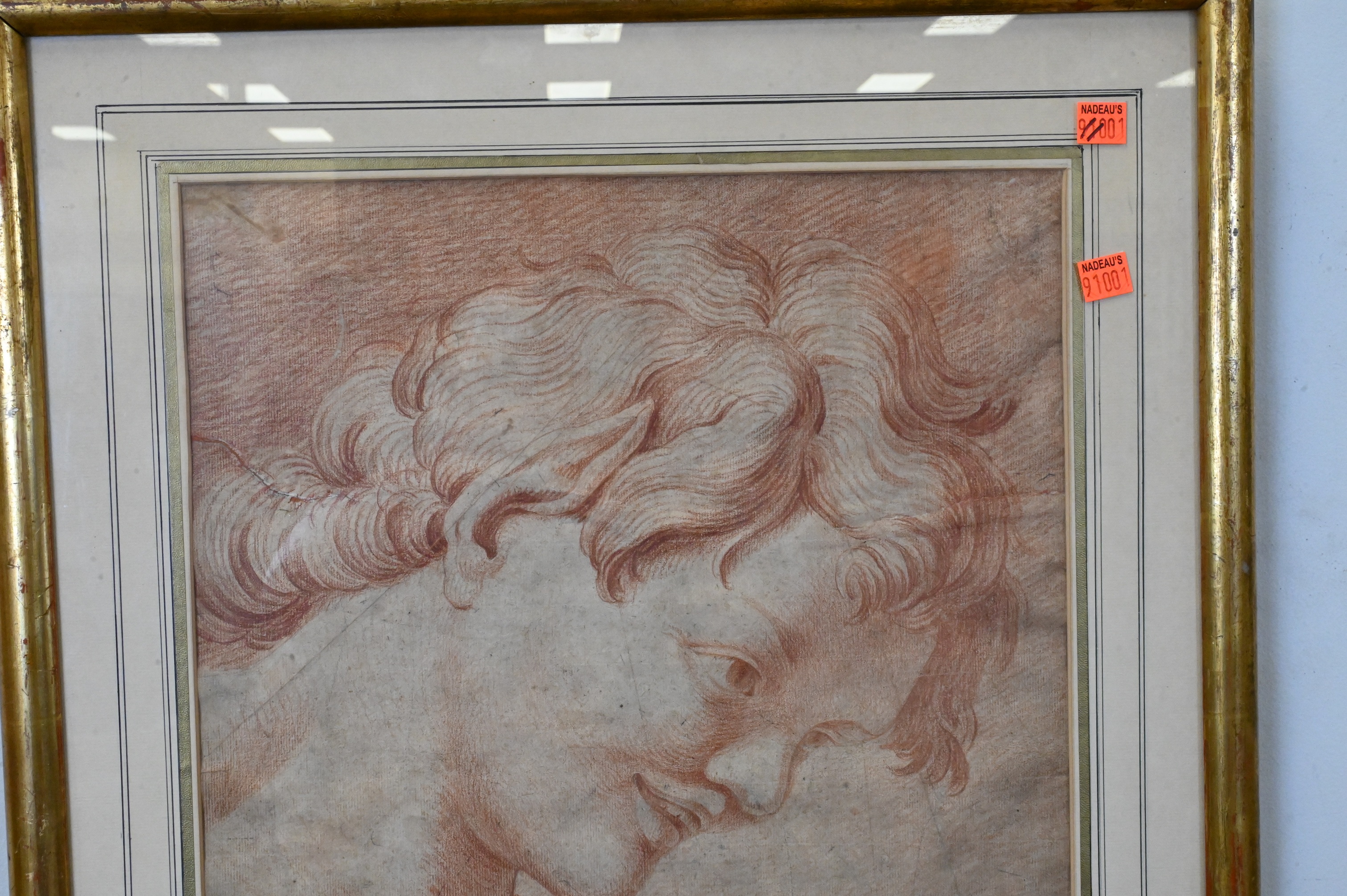 A sensitively modeled red-chalk study of a youthful head in profile, the figure inclining forward with a gentle, knowing smile. The artist renders the features with exceptionally fine parallel hatching and soft tonal transitions, characteristic of 17th-century Dutch draftsmanship. The luxuriant, curling hair is drawn with rhythmic, sculptural strokes, and the pointed ear subtly identifies the subject as a mythological figure—likely a young satyr, faun, or bacchante rather than a purely idealized youth. The treatment suggests a workshop or academic study after antique or allegorical models, where such hybrid classical types were frequently explored