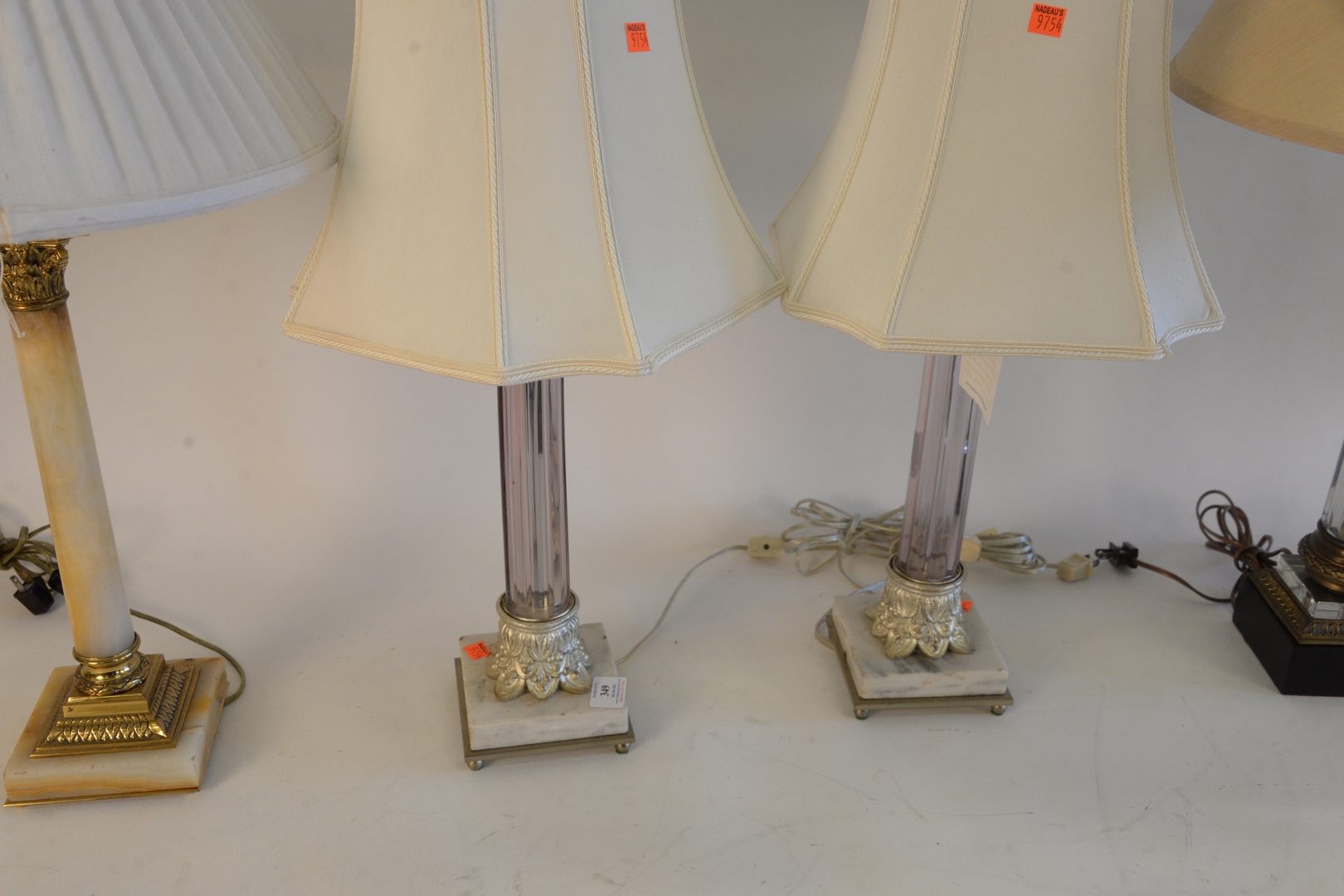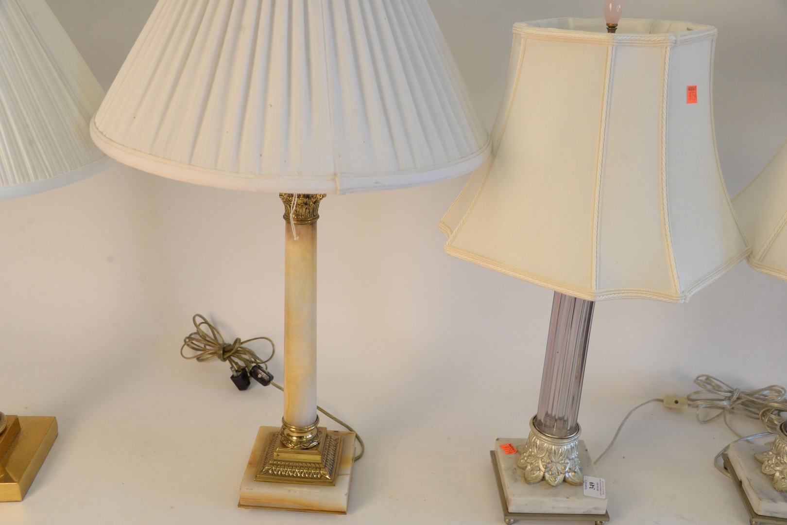 Five Piece Group of Decorative Table Lamps, to include three glass, cylindrical lamps, along with two marble, cylindrical lamps, tallest height 27 inches.