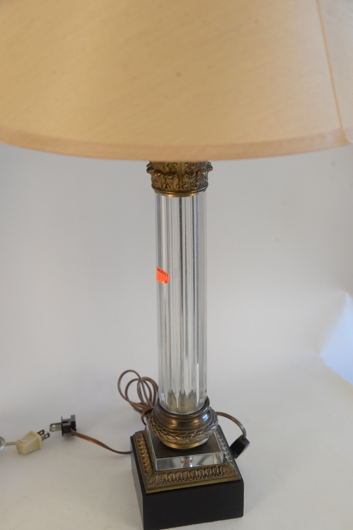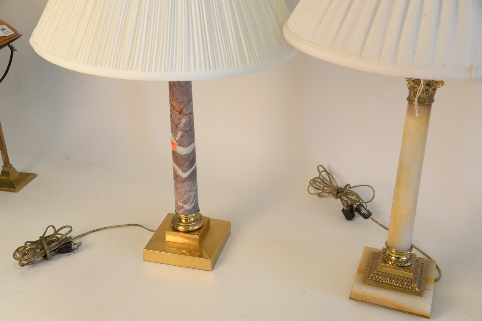 Lot 349: Five Piece Group of Decorative Table Lamps, to include three glass, cylindrical lamps, along with two marble, cylindrical lamps, tal…