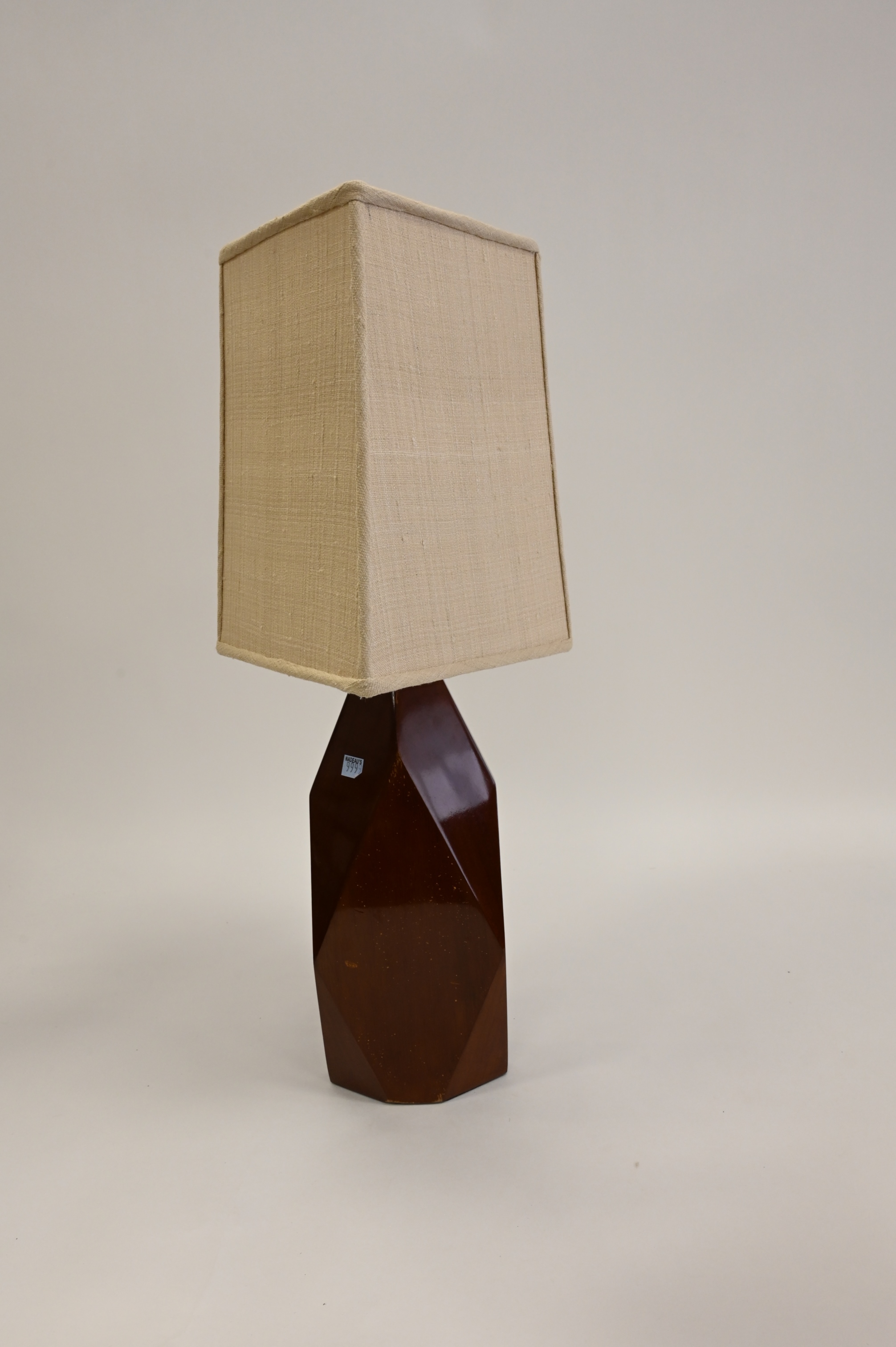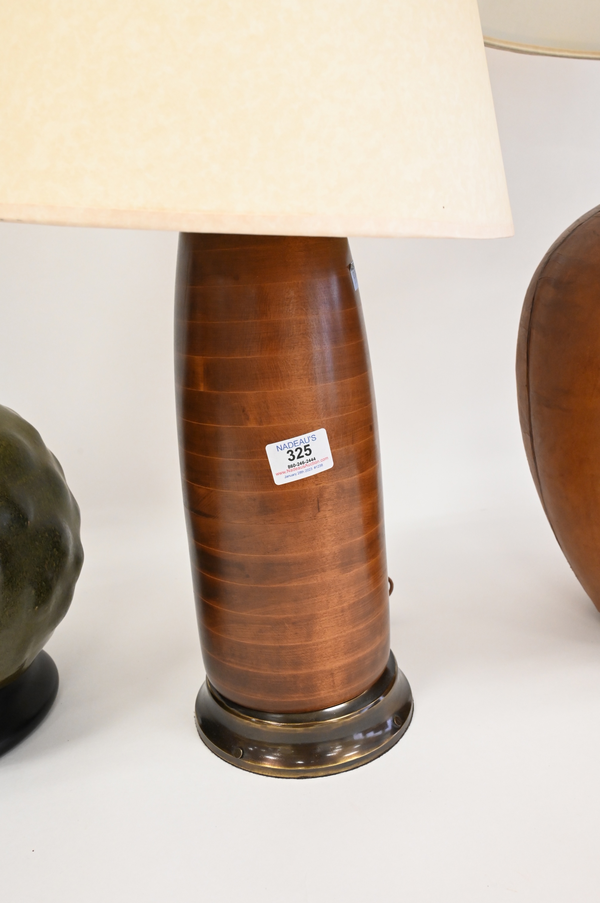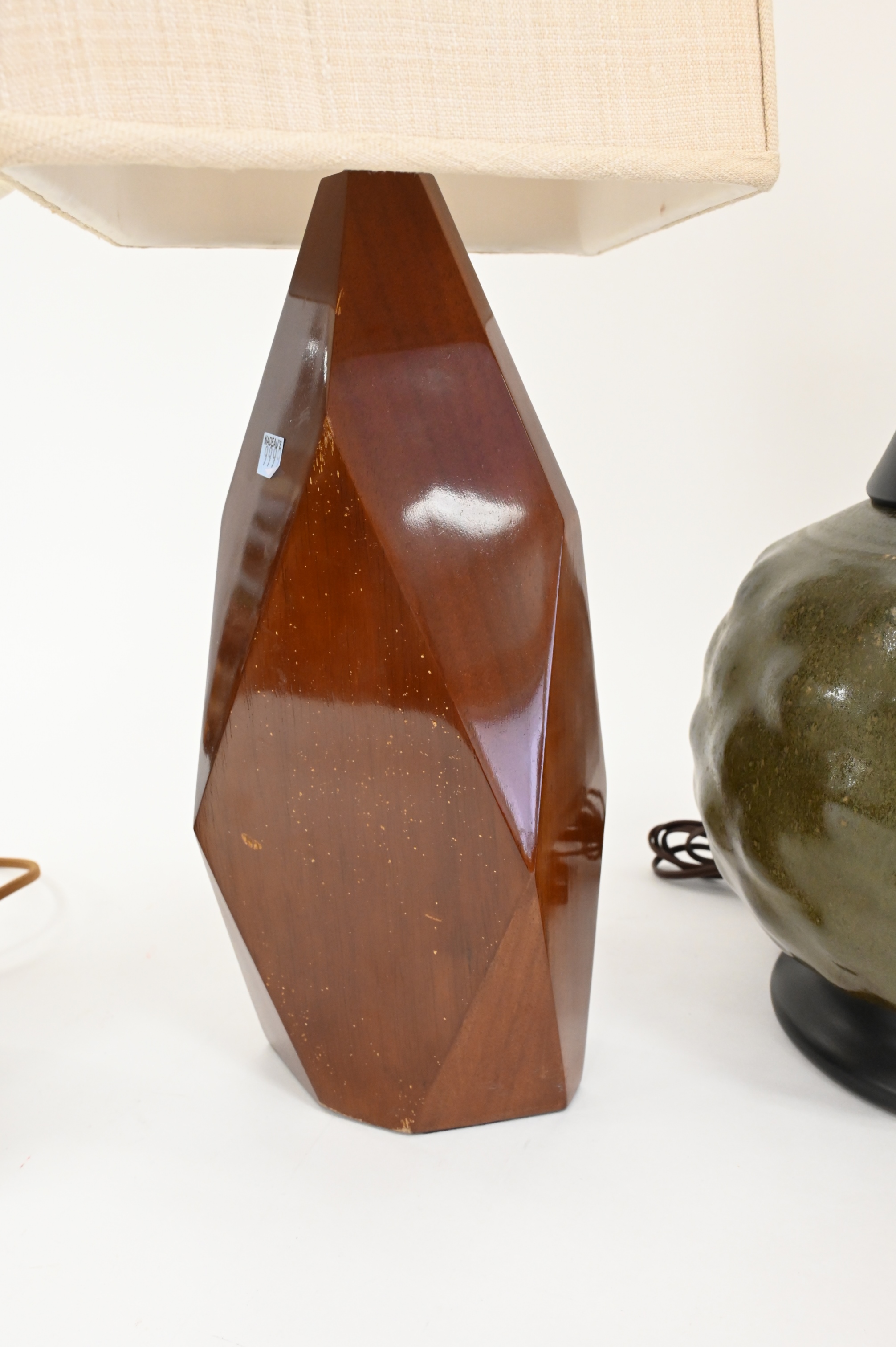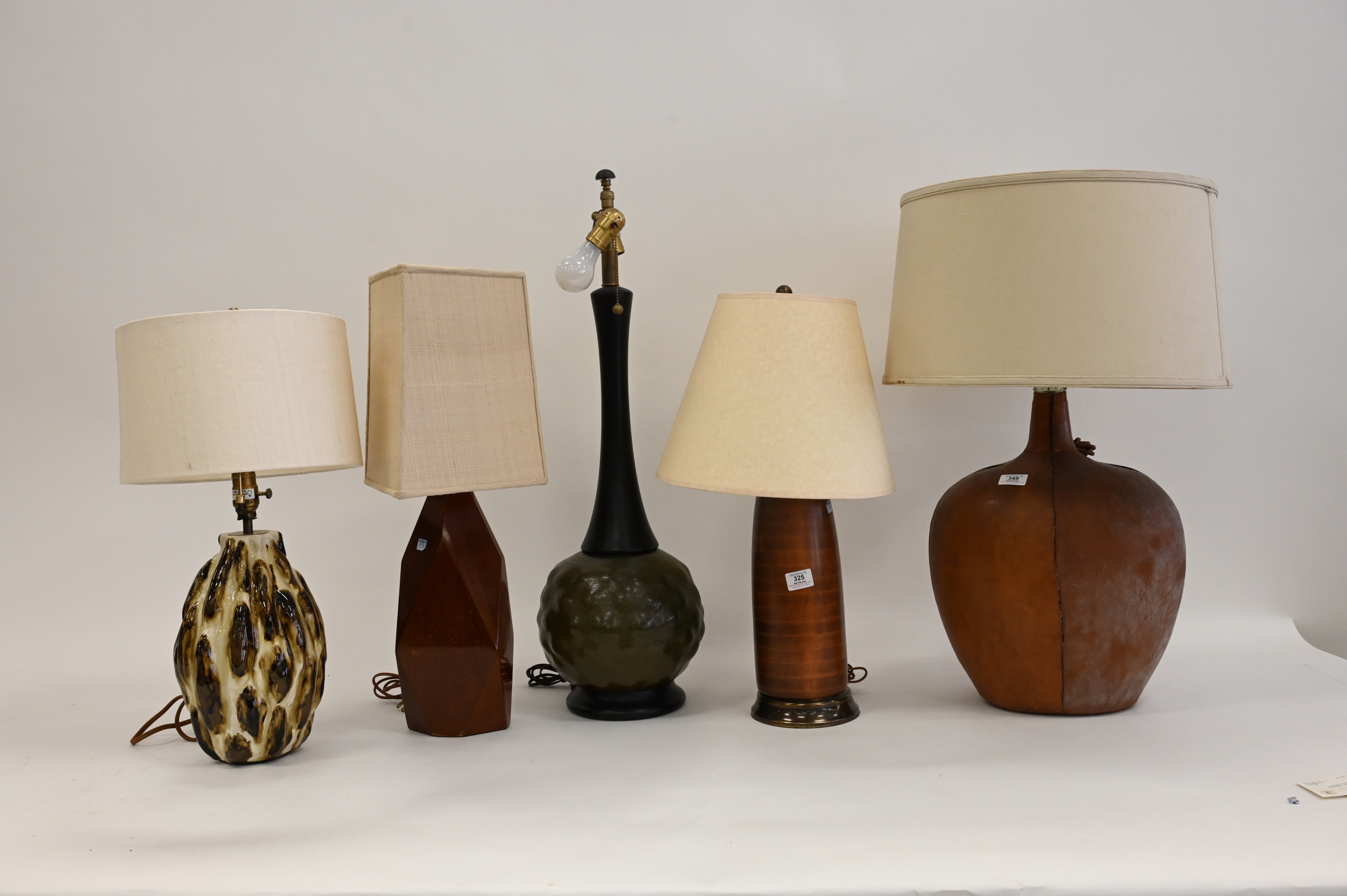Five Table Lamps, to include a Vaughan Design table lamp having pottery vase body, along with two mid century modern wood lamps, height 26 inches, etc..