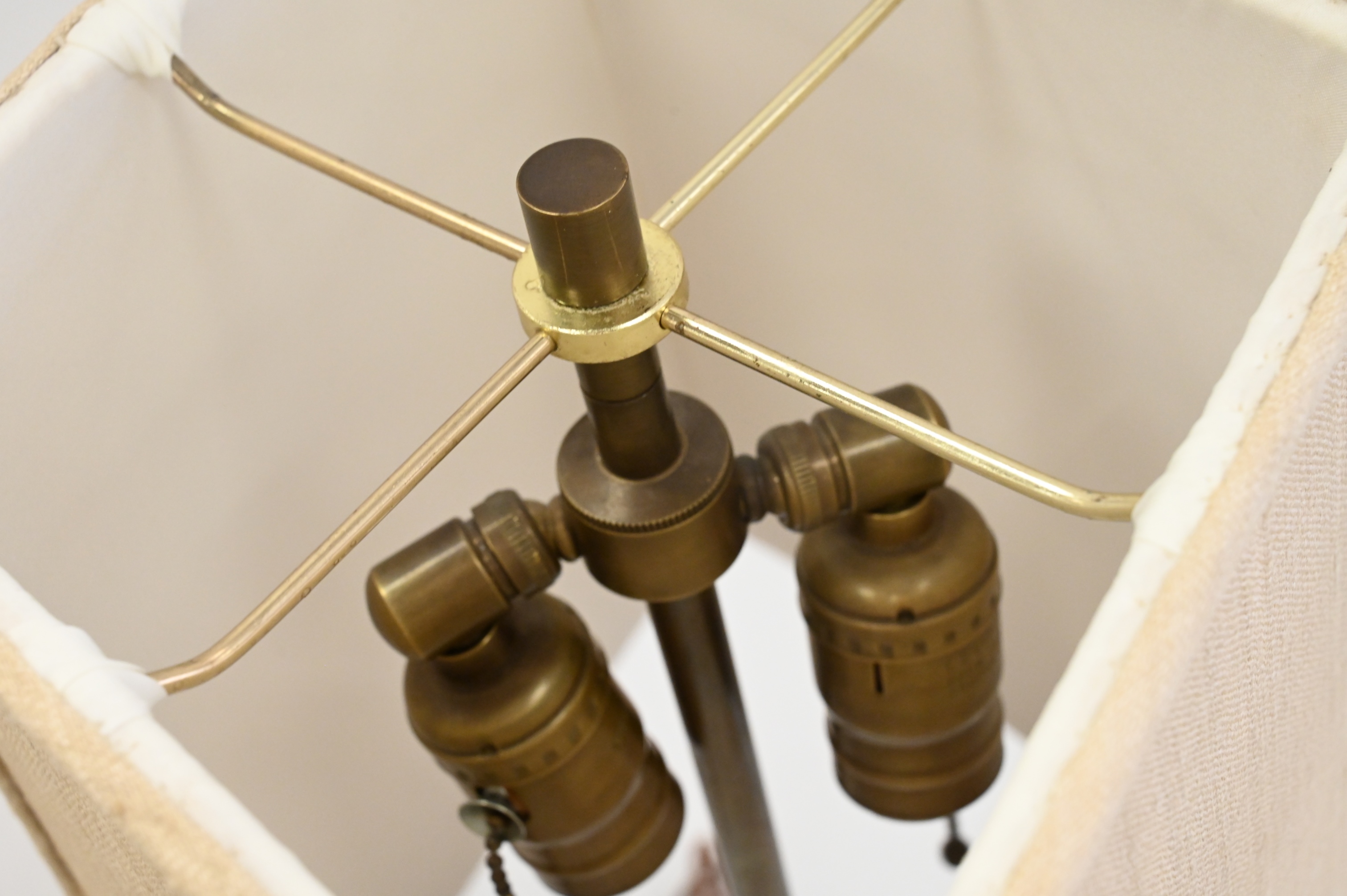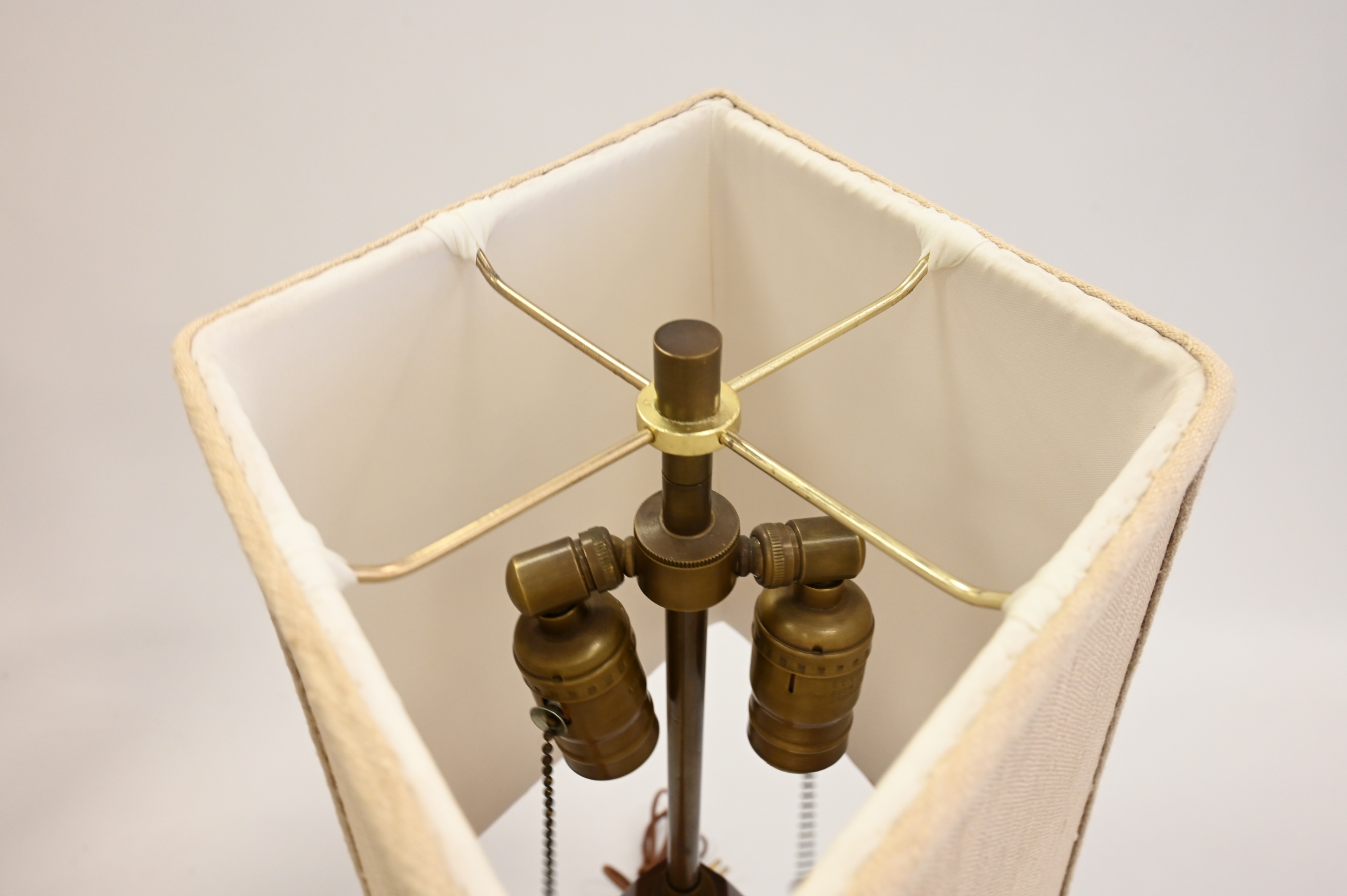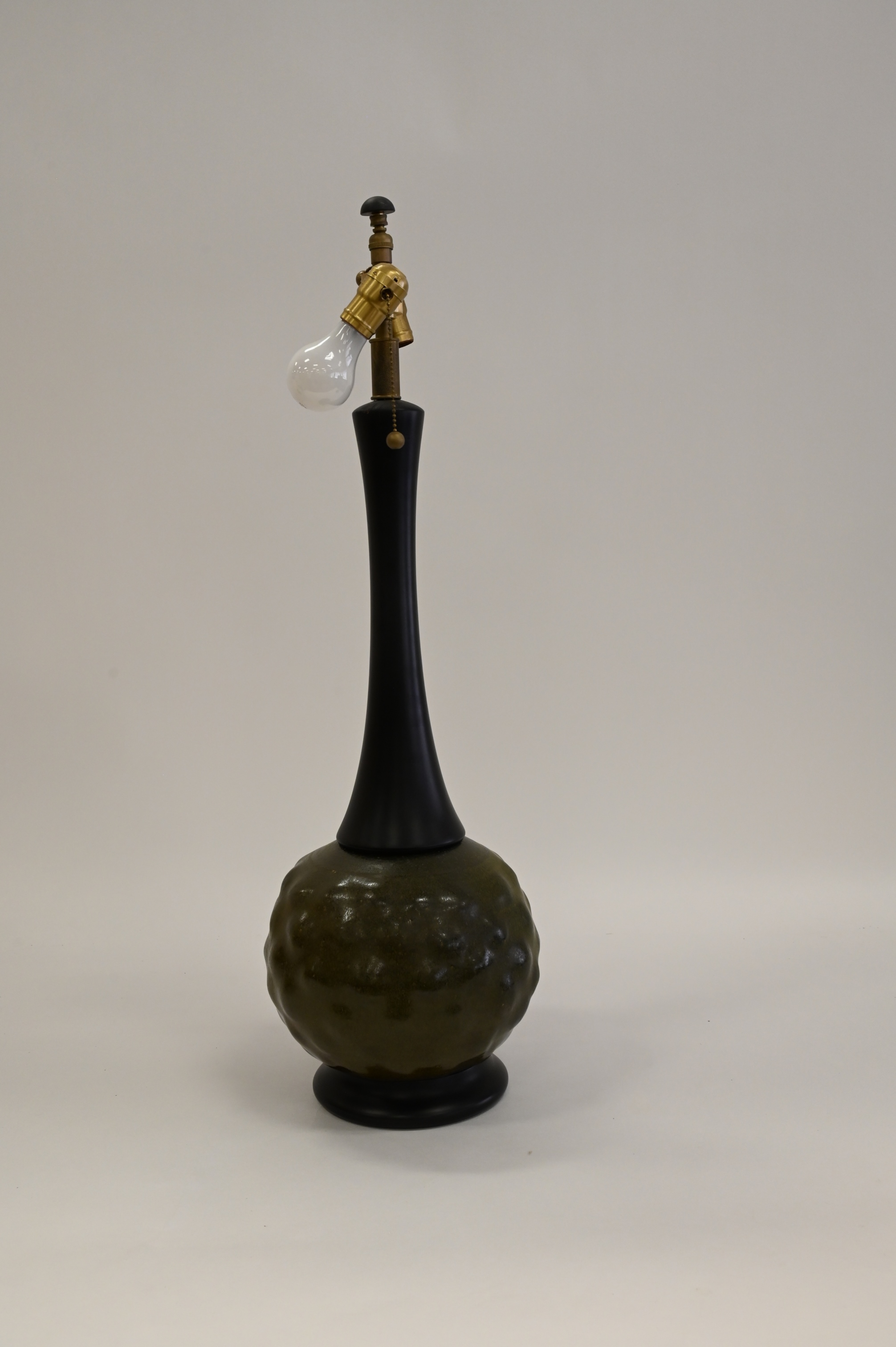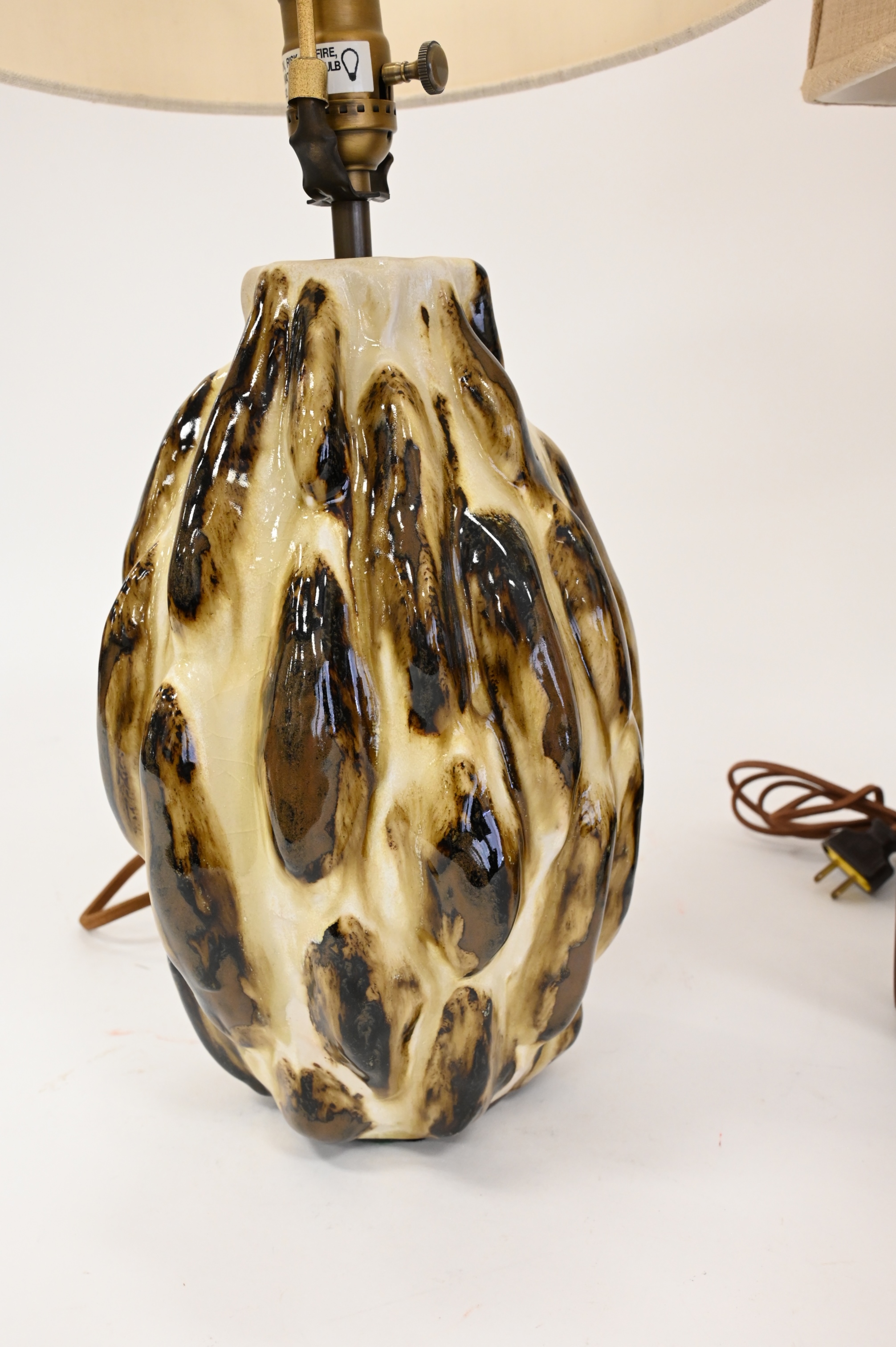 Five Table Lamps, to include a Vaughan Design table lamp having pottery vase body, along with two mid century modern wood lamps, height 26 inches, etc..
