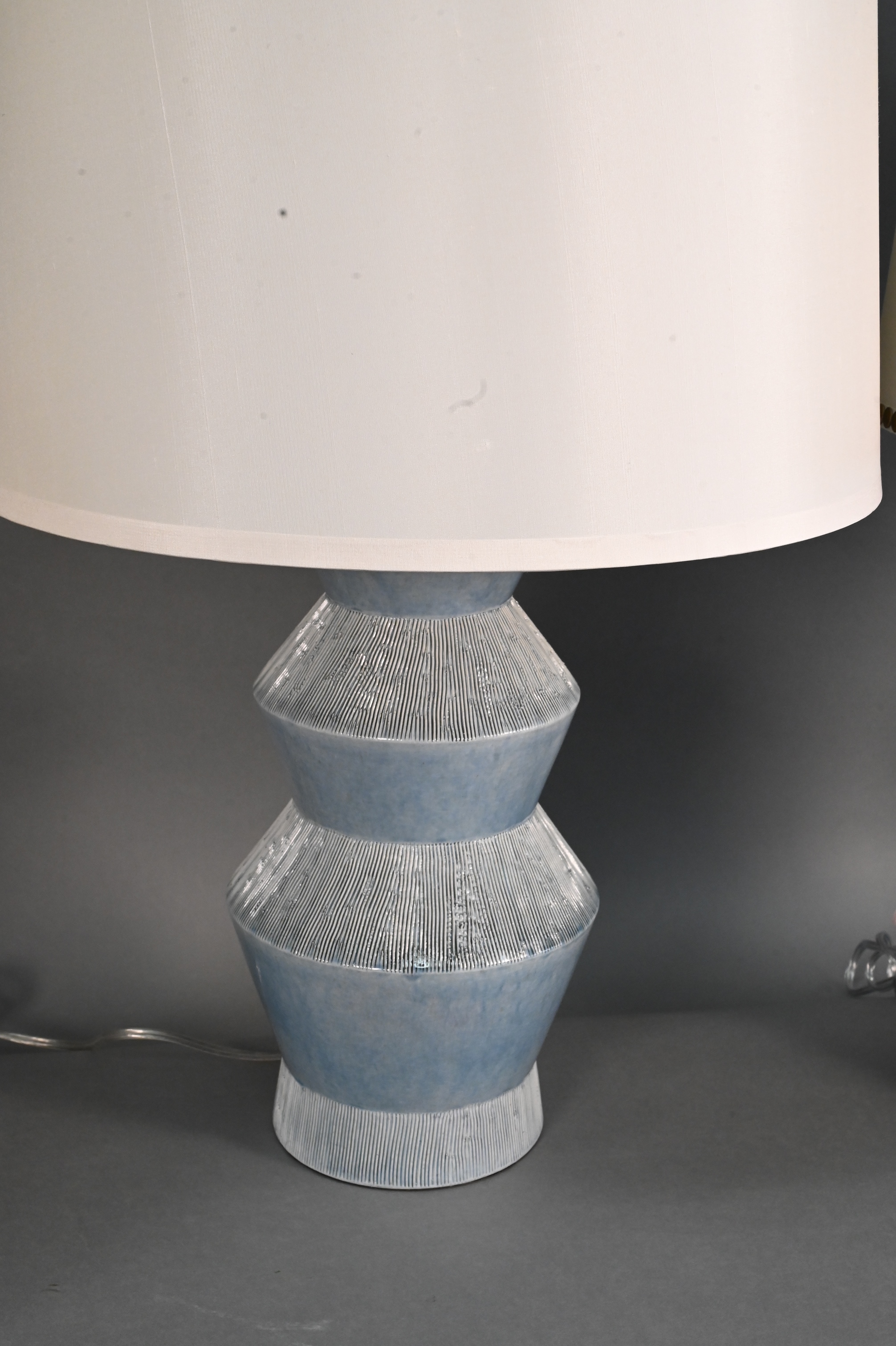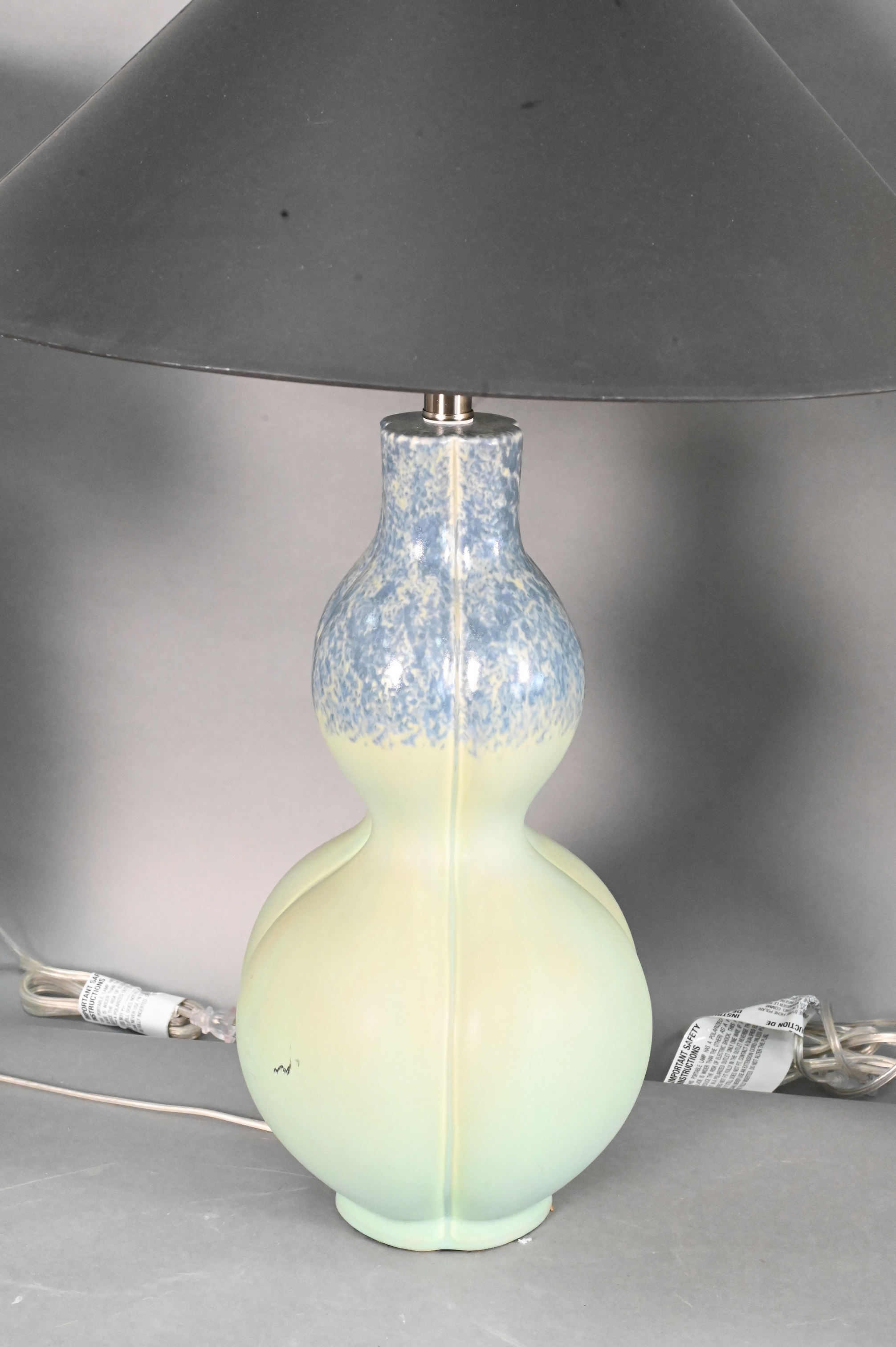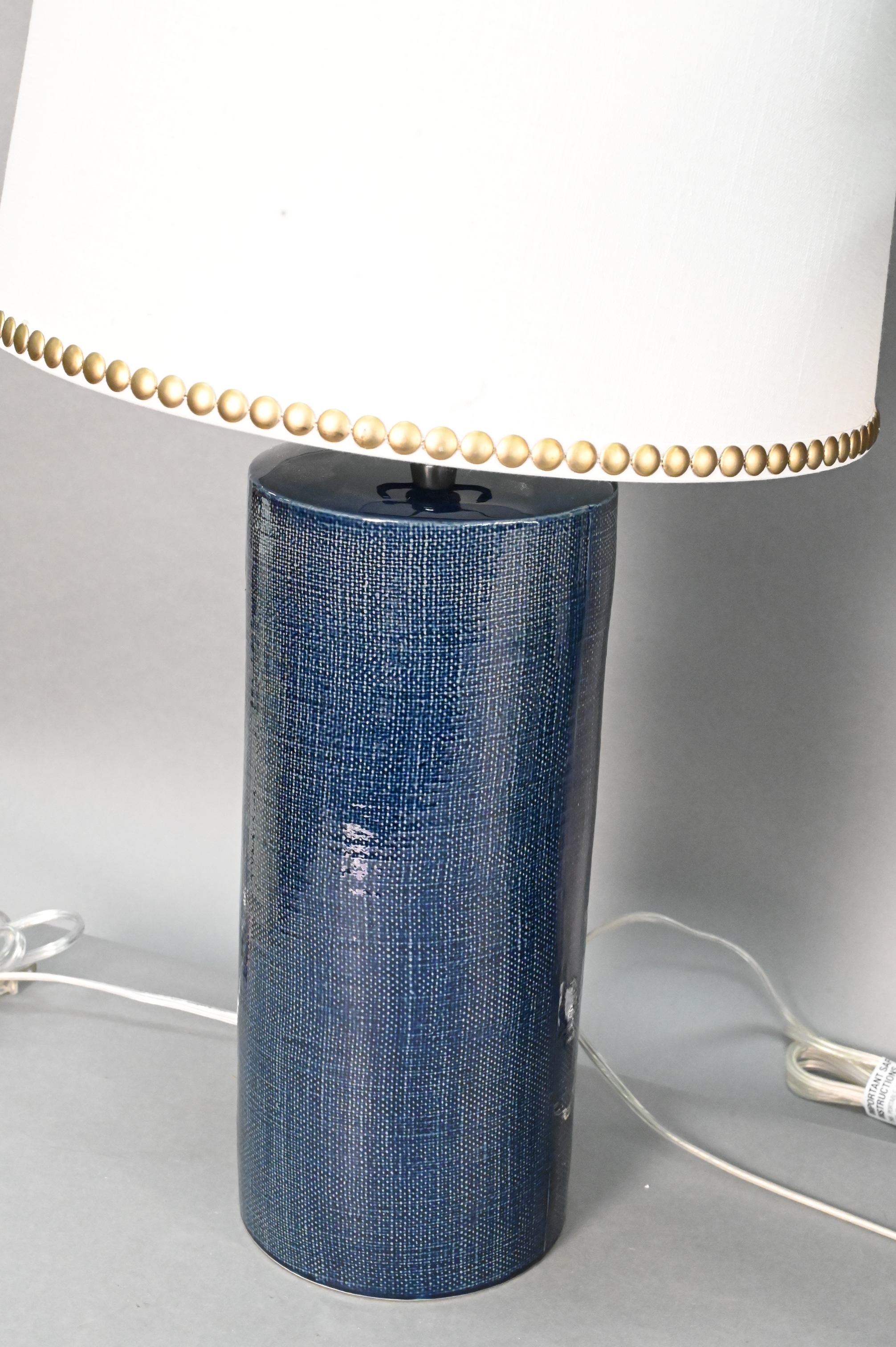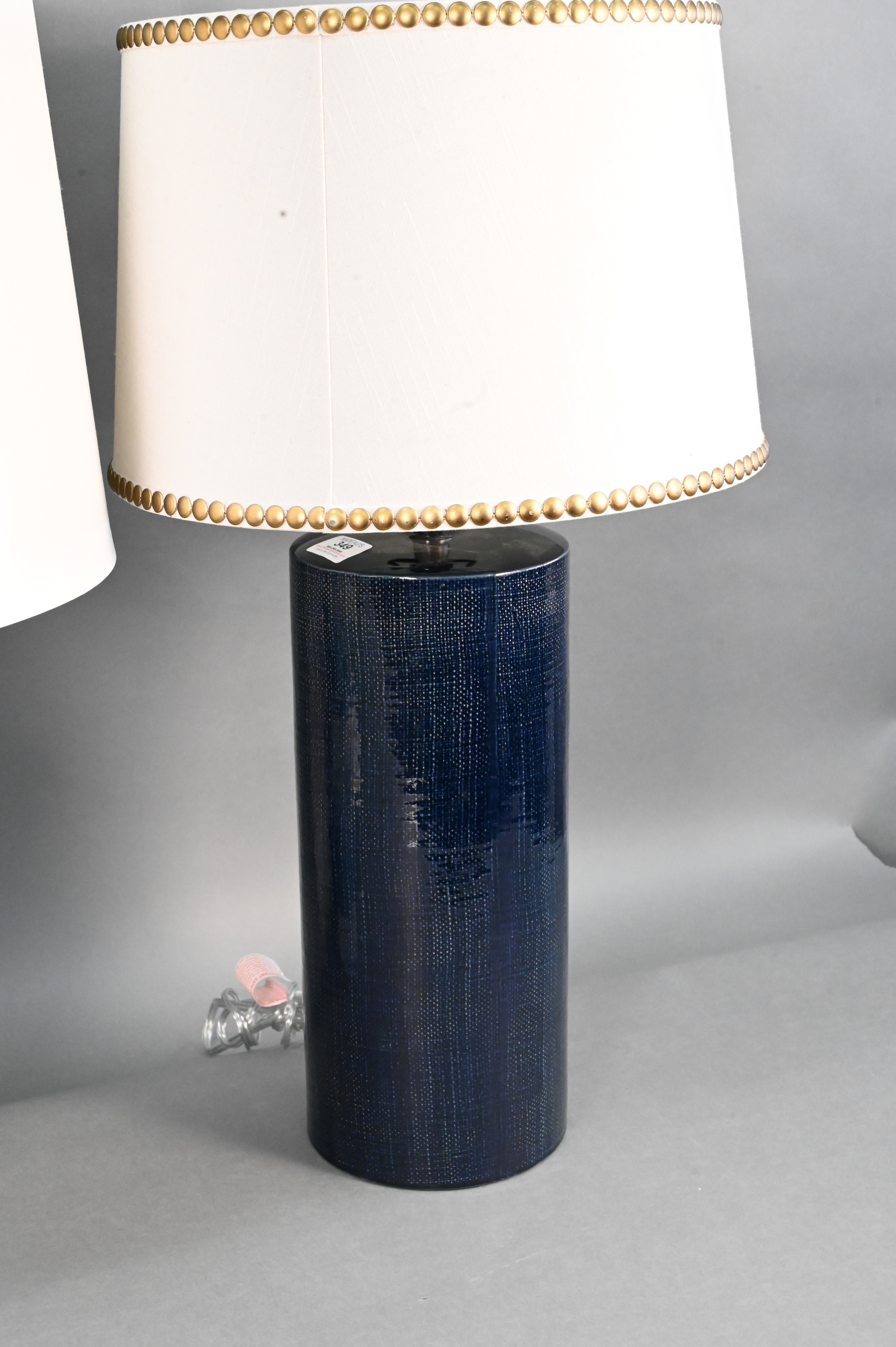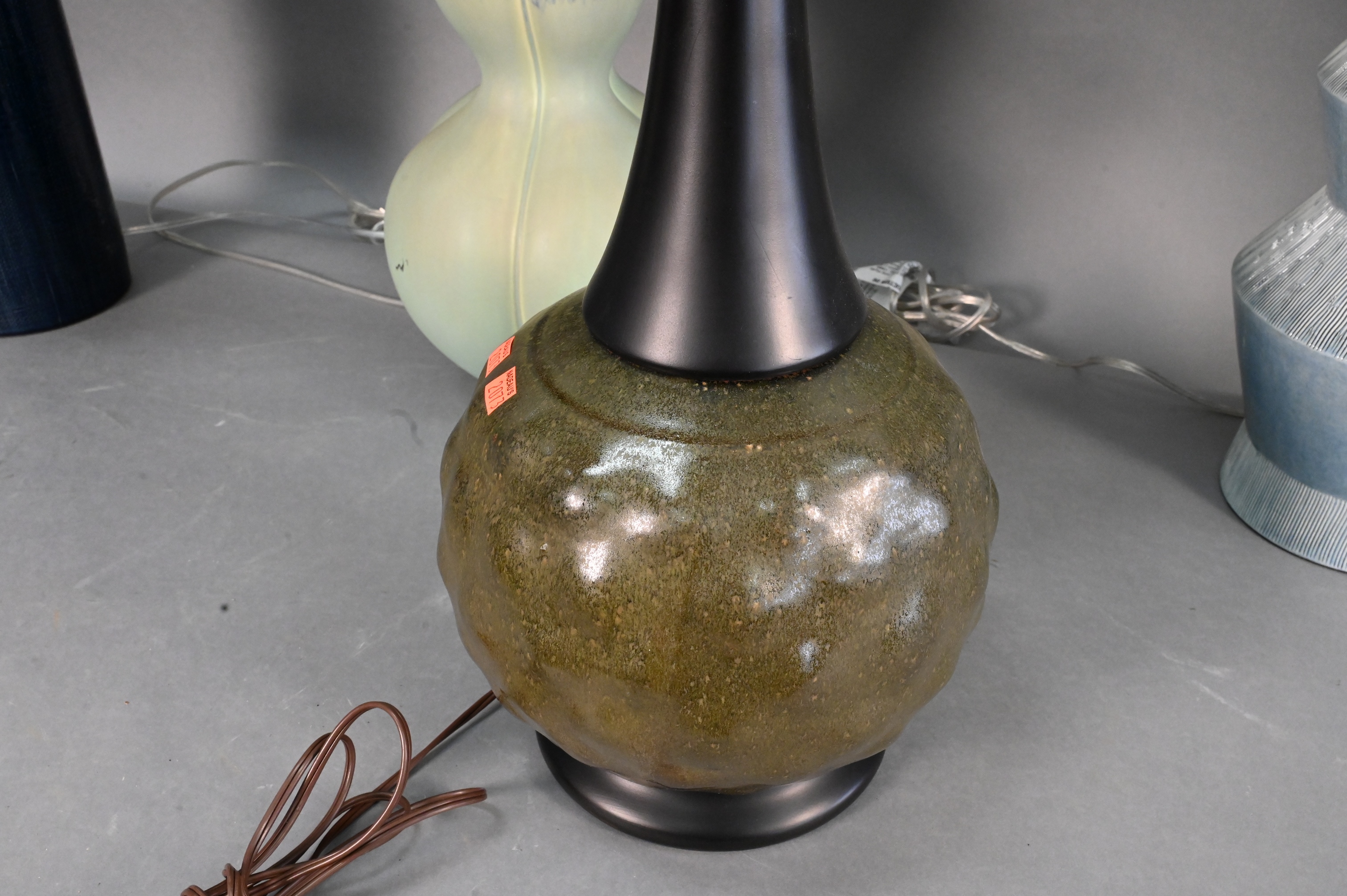 Group of Five Contemporary Table Lamps, to include a pair of dark blue ceramic, green pottery, along with two porcelain lamps, tallest 32 inches.