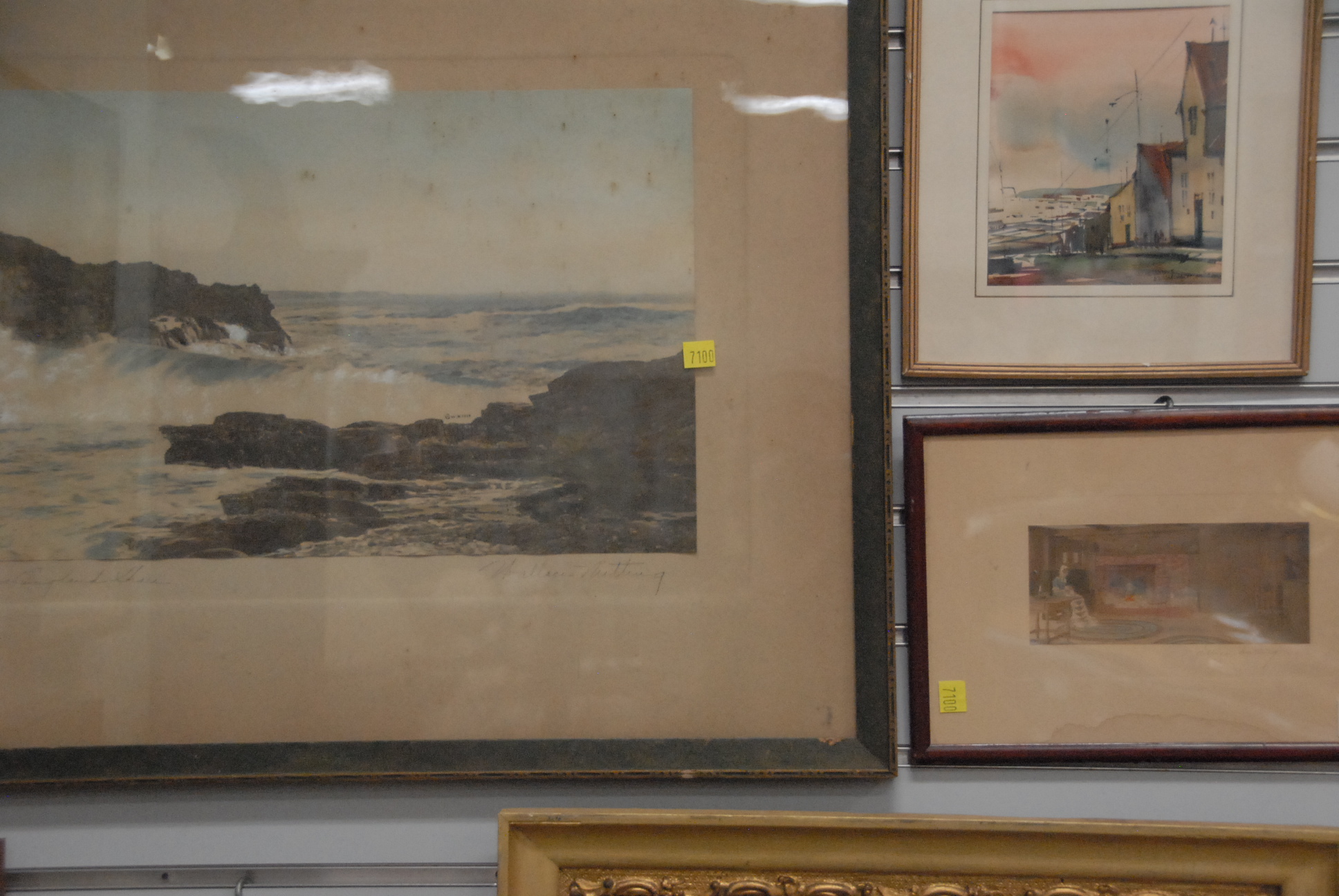 Lot 349: Group of nine prints and paintings to include two Wallace Nutting prints, three watercolors signed Beach, woodblock, stevengraph, an…