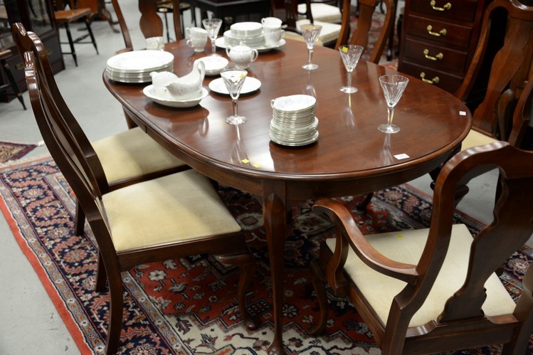 Lot 349: Hitchcock cherry nine piece dining set, Queen style chairs and oval table with two 15 leaves and pads. table: ht. 30 in. top: 44 …