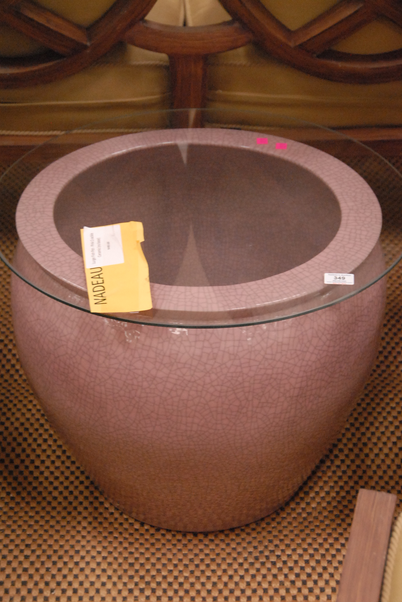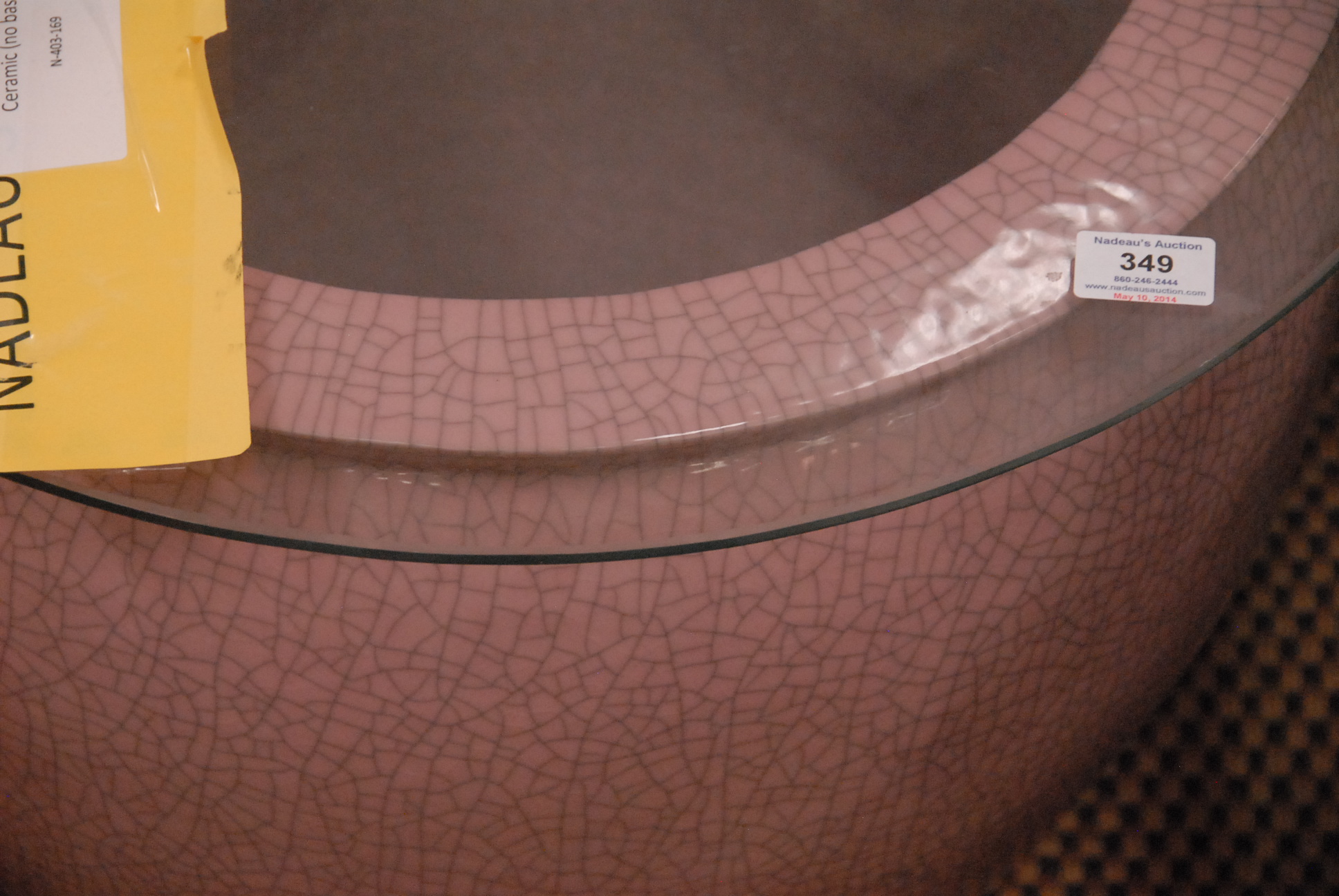 Large crackle pink glazed planter side table with glass top, ht. 18in. dia. 24in.