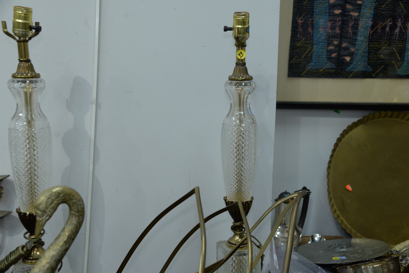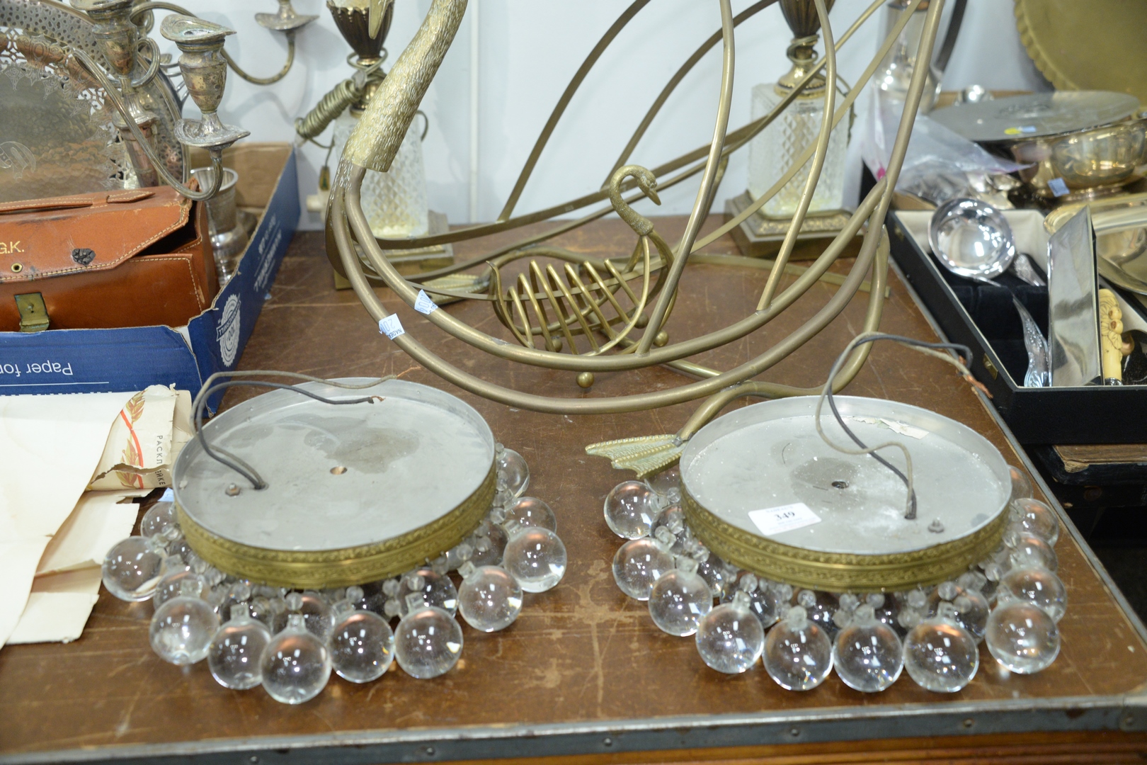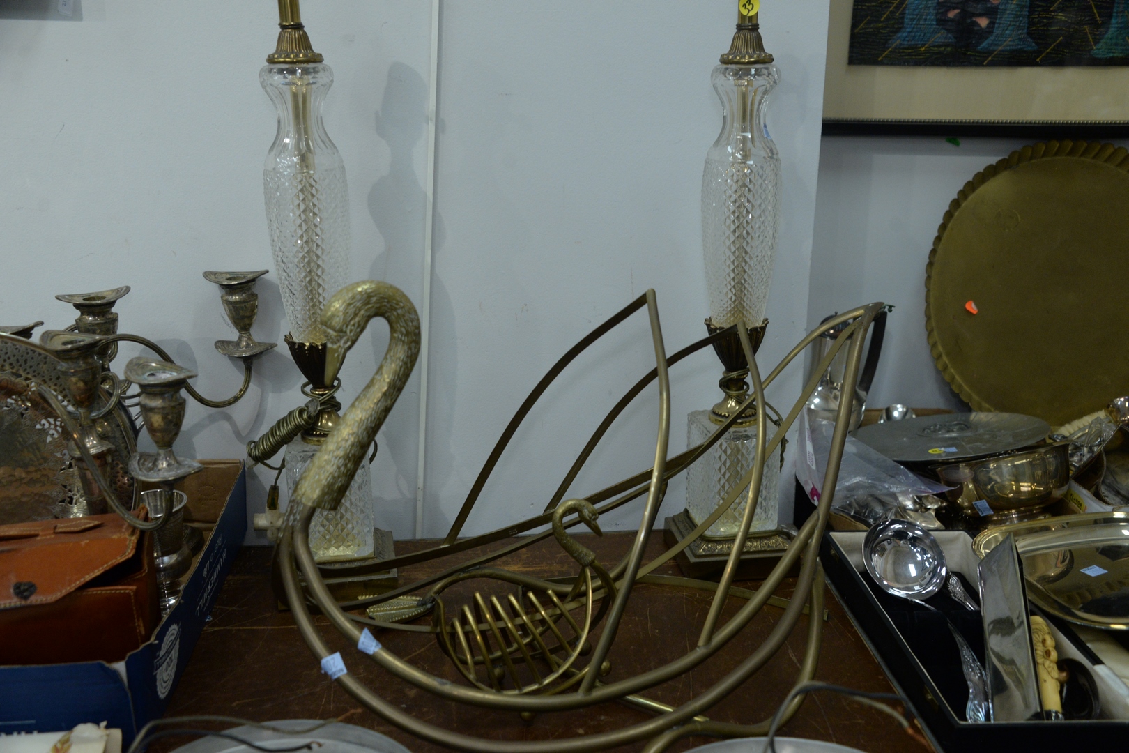 Lot 349: Pair of Mid-Century Ceiling Lights, with glass ball shades, diameter 8 1/2 inches; along with a pair of table lamps, height 26 inches; brass swan magazine rack, length 23 inches. Provenance: The Estate of Alina Roisen, Park Avenue, New York.