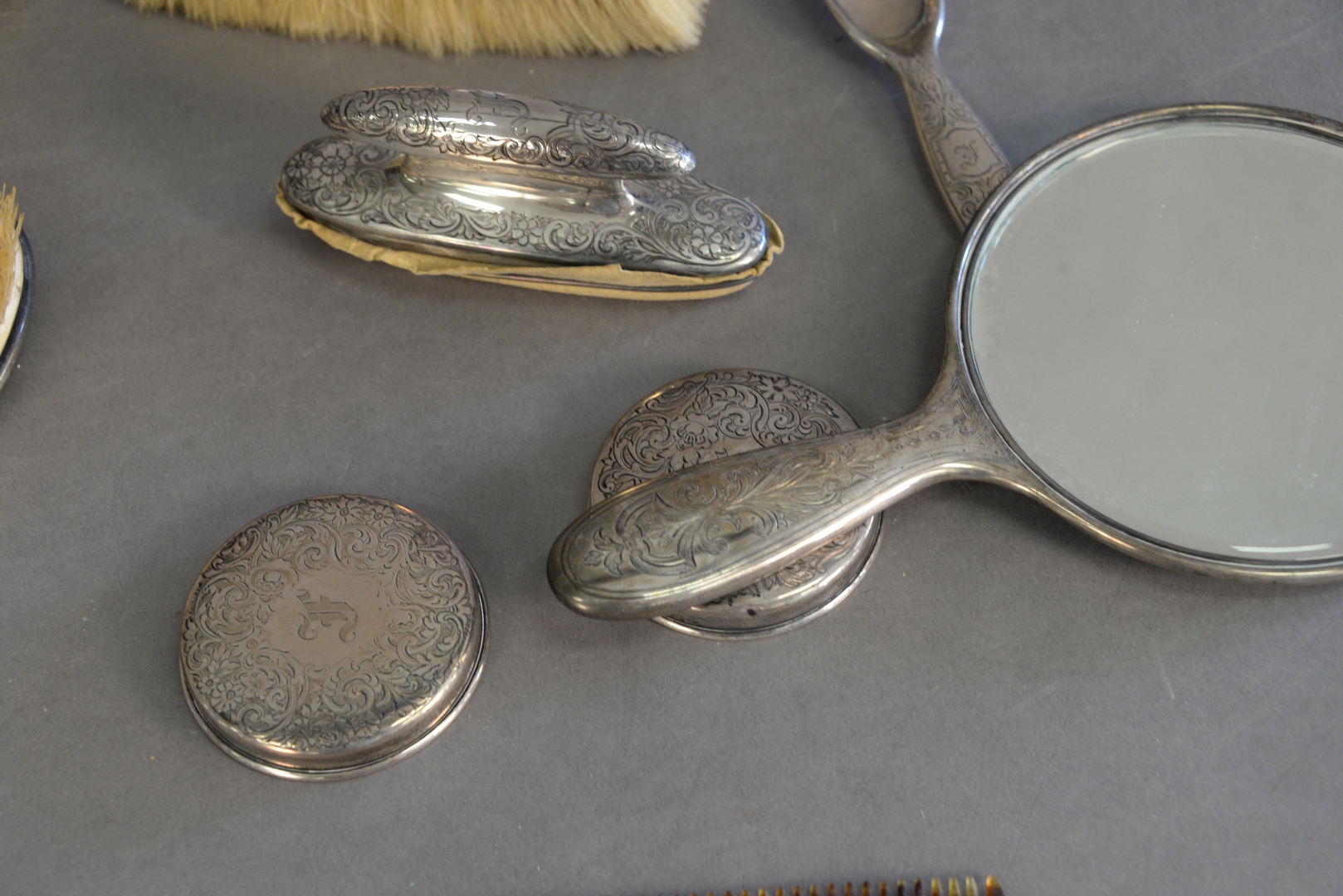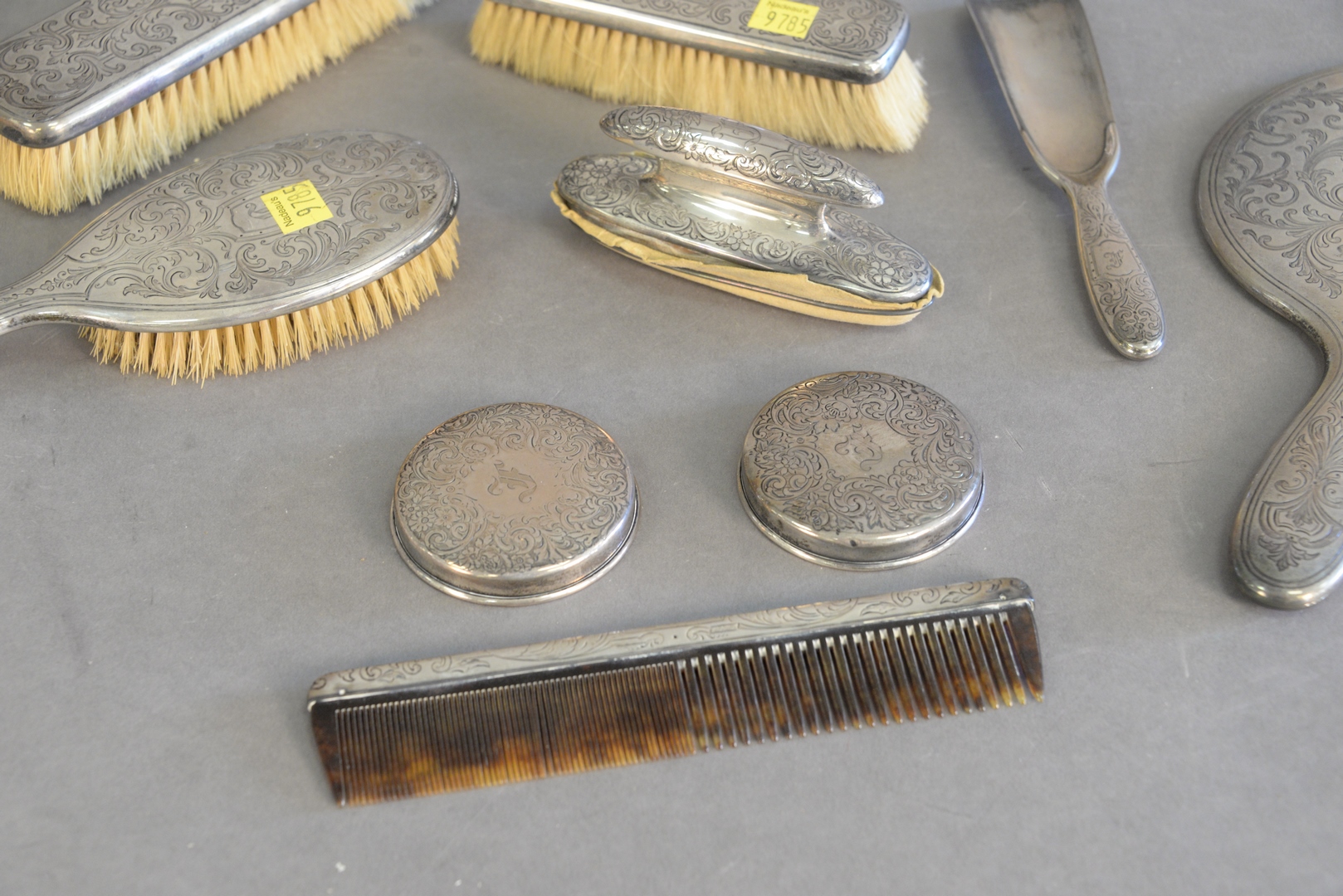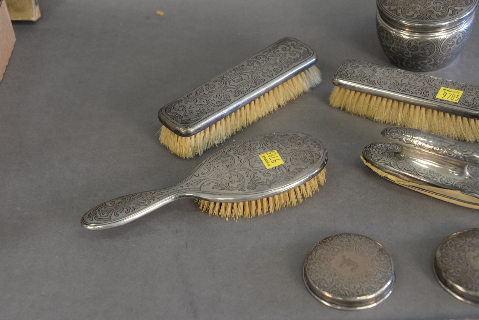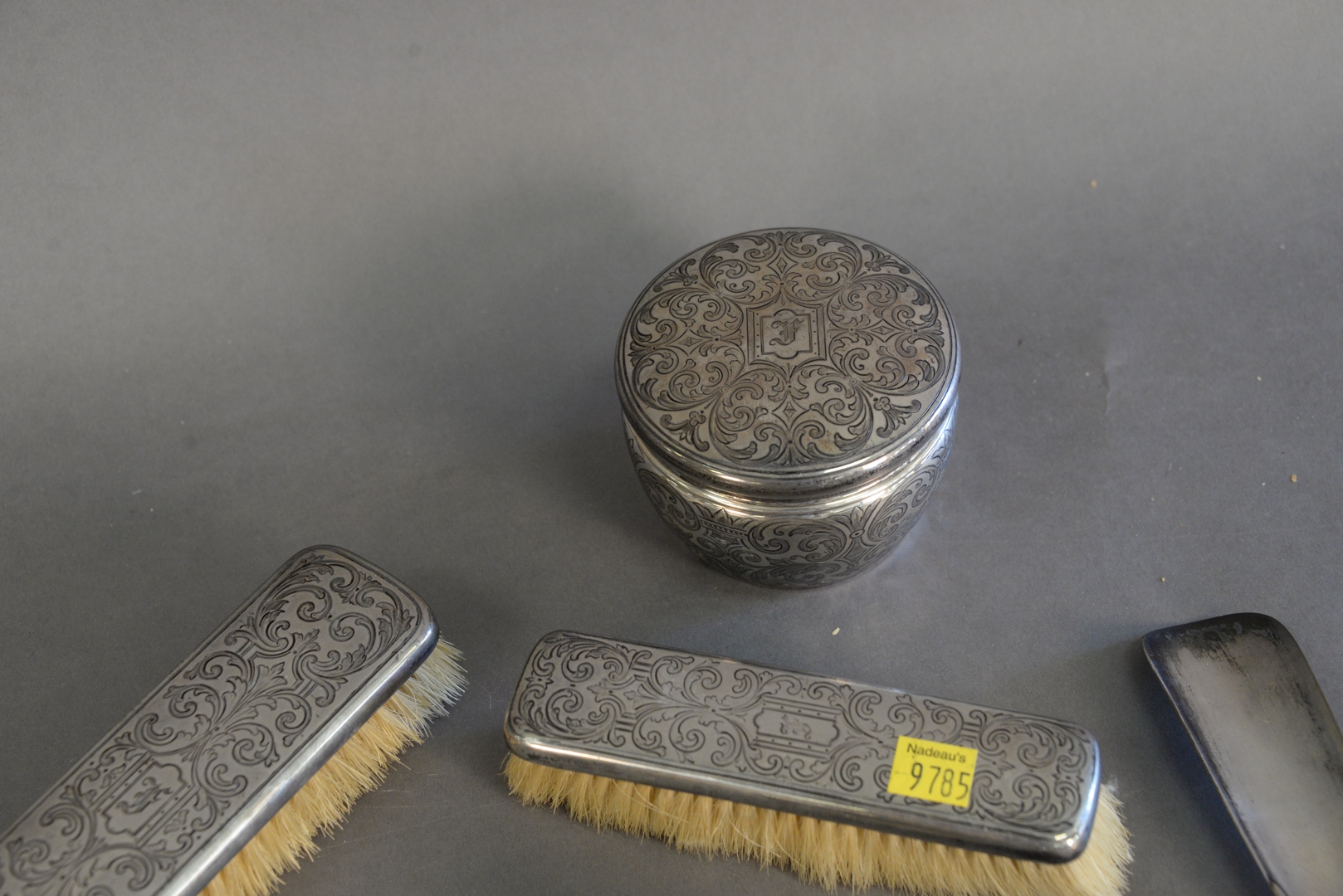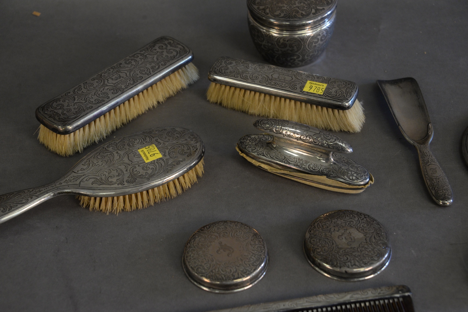 Lot 349: Ten Piece Tiffany & Company Sterling Silver Dresser Set, to include two covers with no jars, one shoe horn, one sterling silver covered jar, 11.3 t.oz. (weighable).