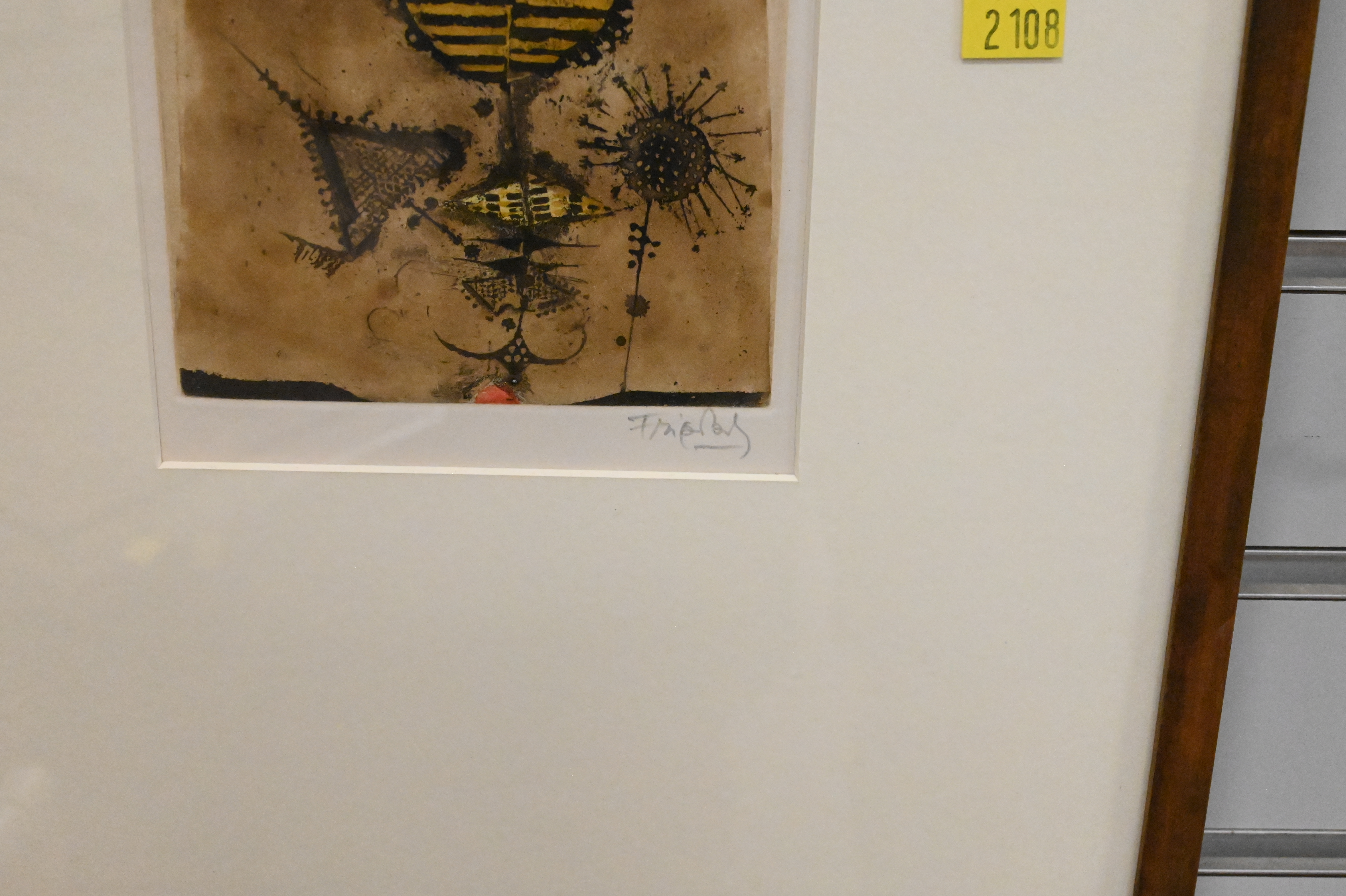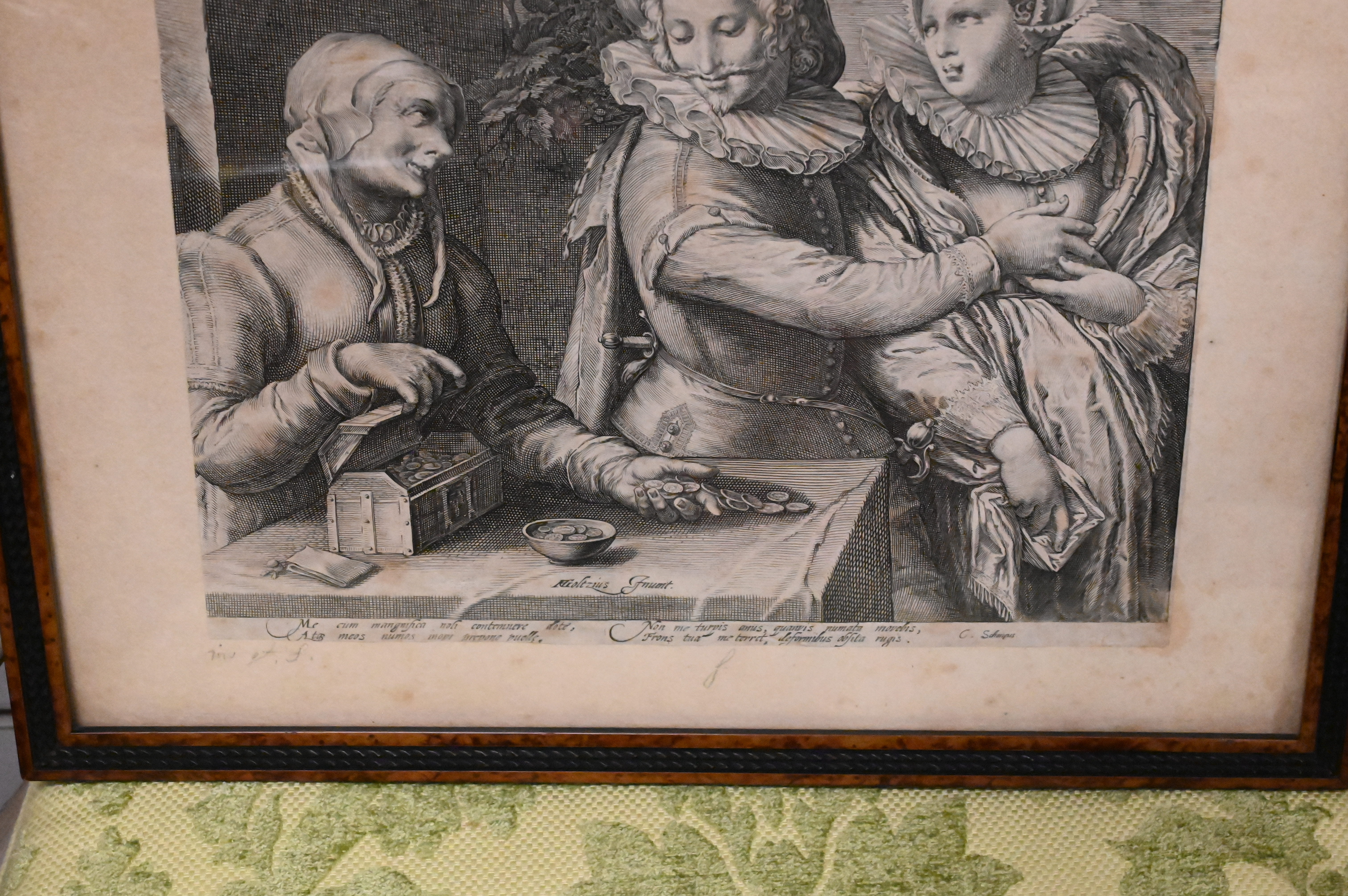 engraving on paper, of an old woman offering coins to a young couple (from the Unequal Love series)