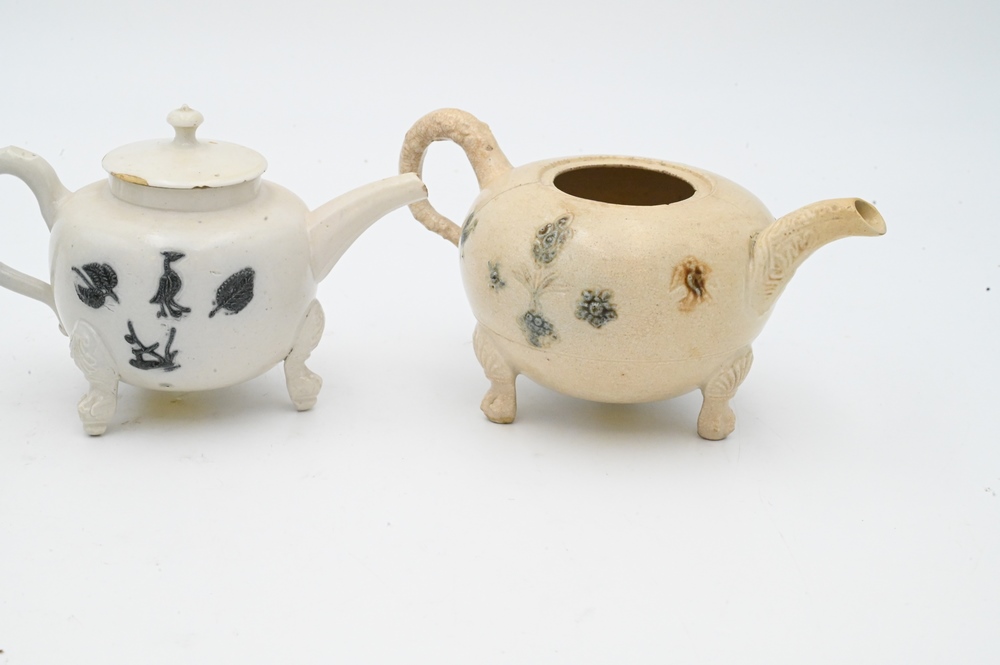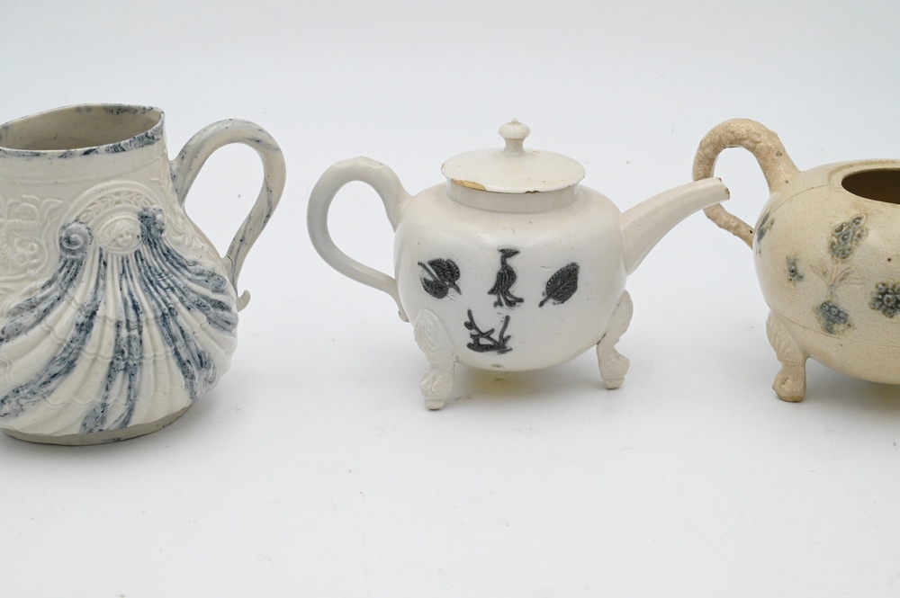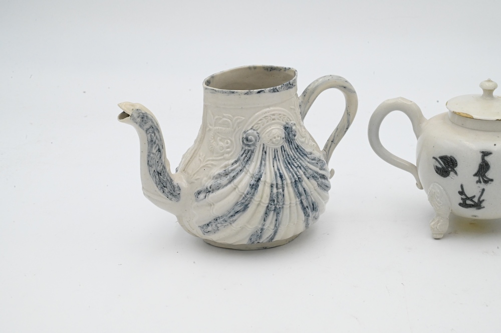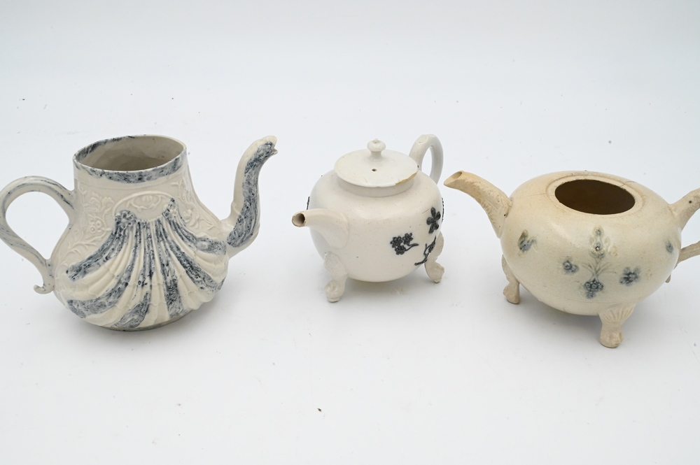 Three Salt Glazed Teapots, one with cover, (minor wear cover chips), along with one blue shell decorated. Provenance: Anthony Belton, 1983, London, with copy of bill of sale; Levy Inc.; heights 4 inches. Provenance: Estate of Wallace Bradway, New Haven, CT.