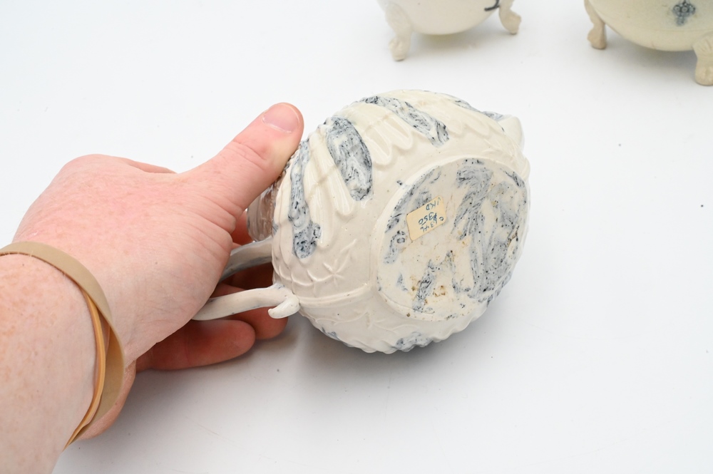 Lot 349: Three Salt Glazed Teapots, one with cover, (minor wear cover chips), along with one blue shell decorated. Provenance: Anthony Belton, 1983, London, with copy of bill of sale; Levy Inc.; heights 4 inches. Provenance: Estate of Wallace Bradway, New Haven, CT.