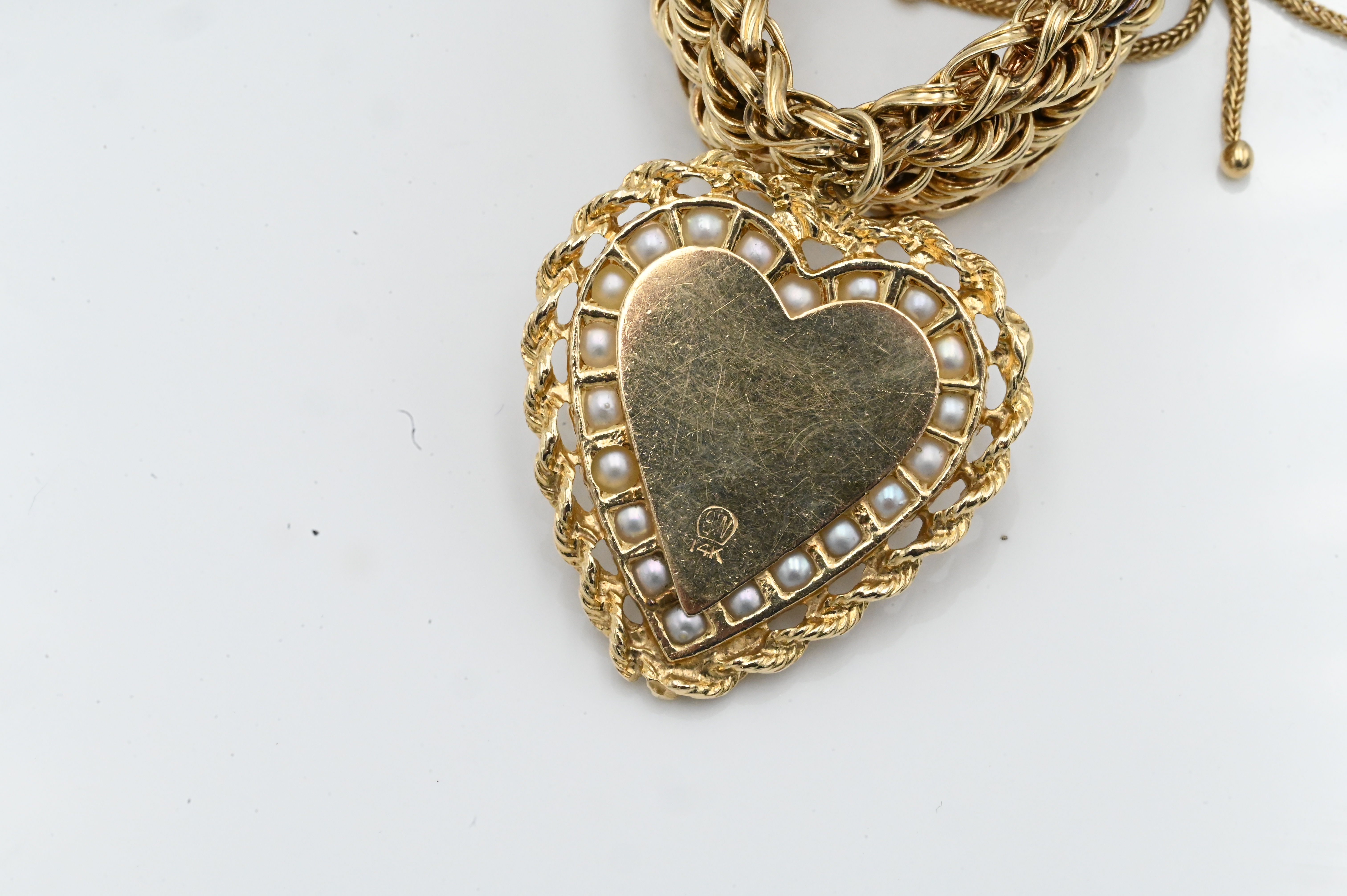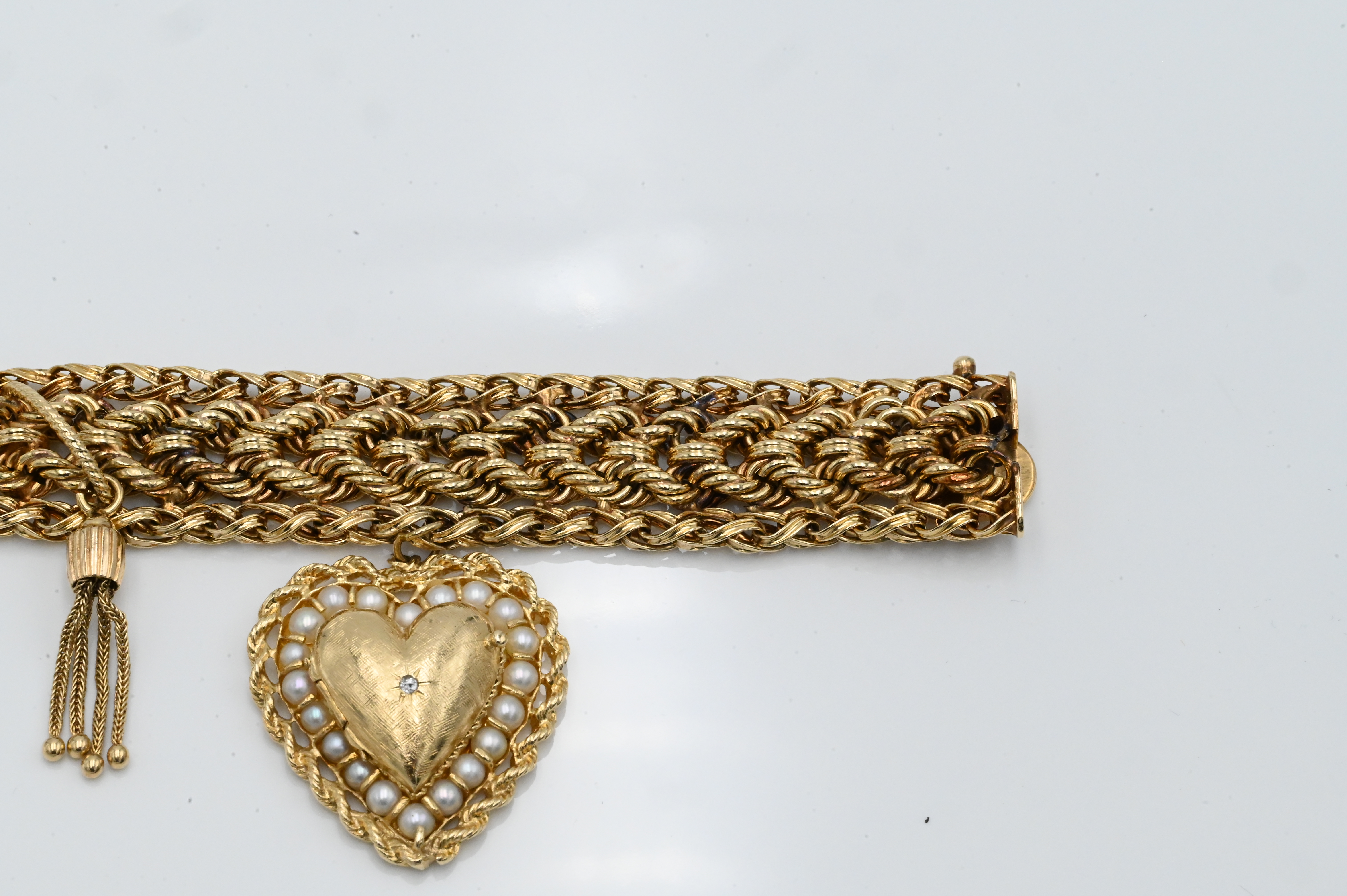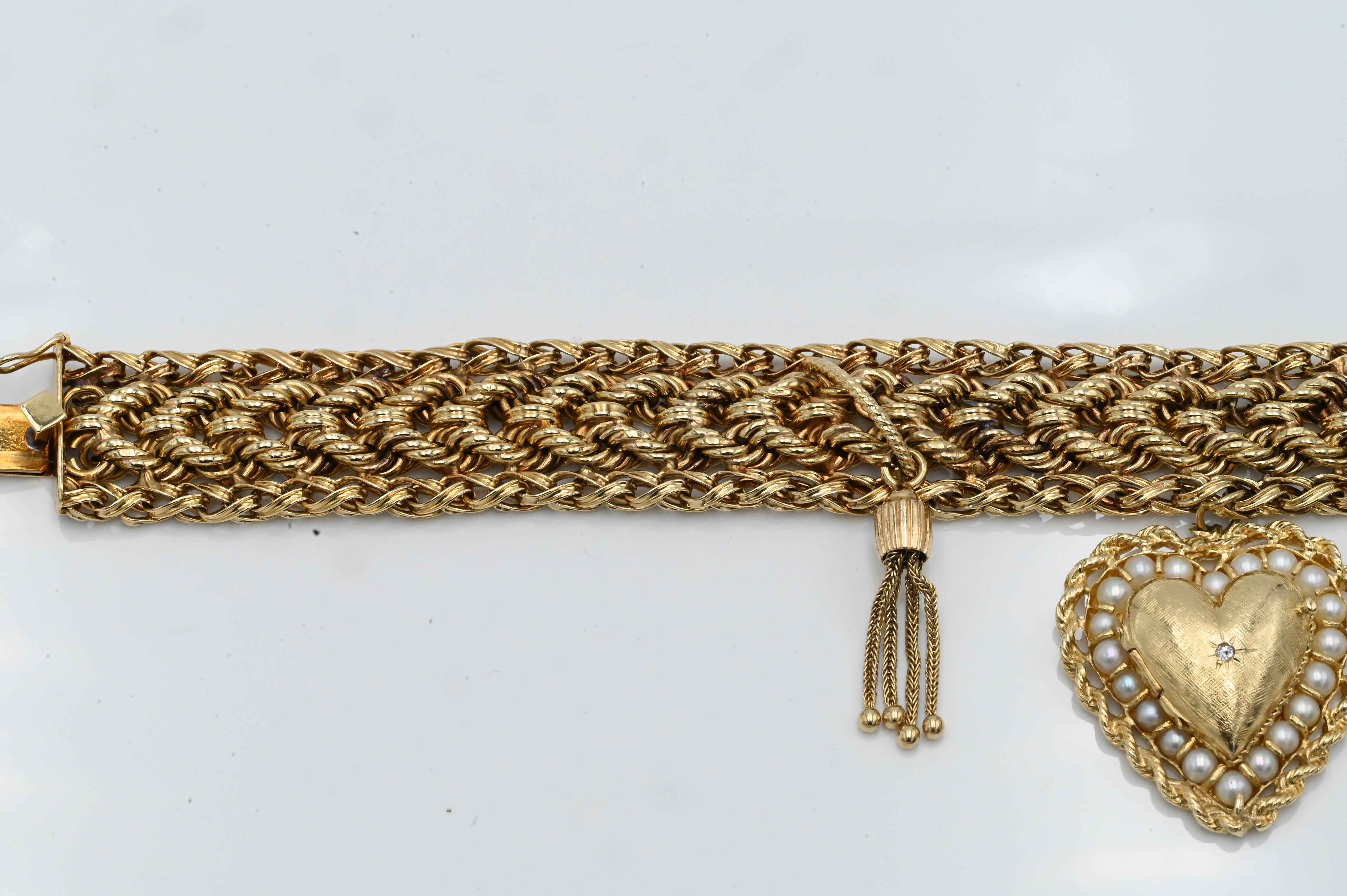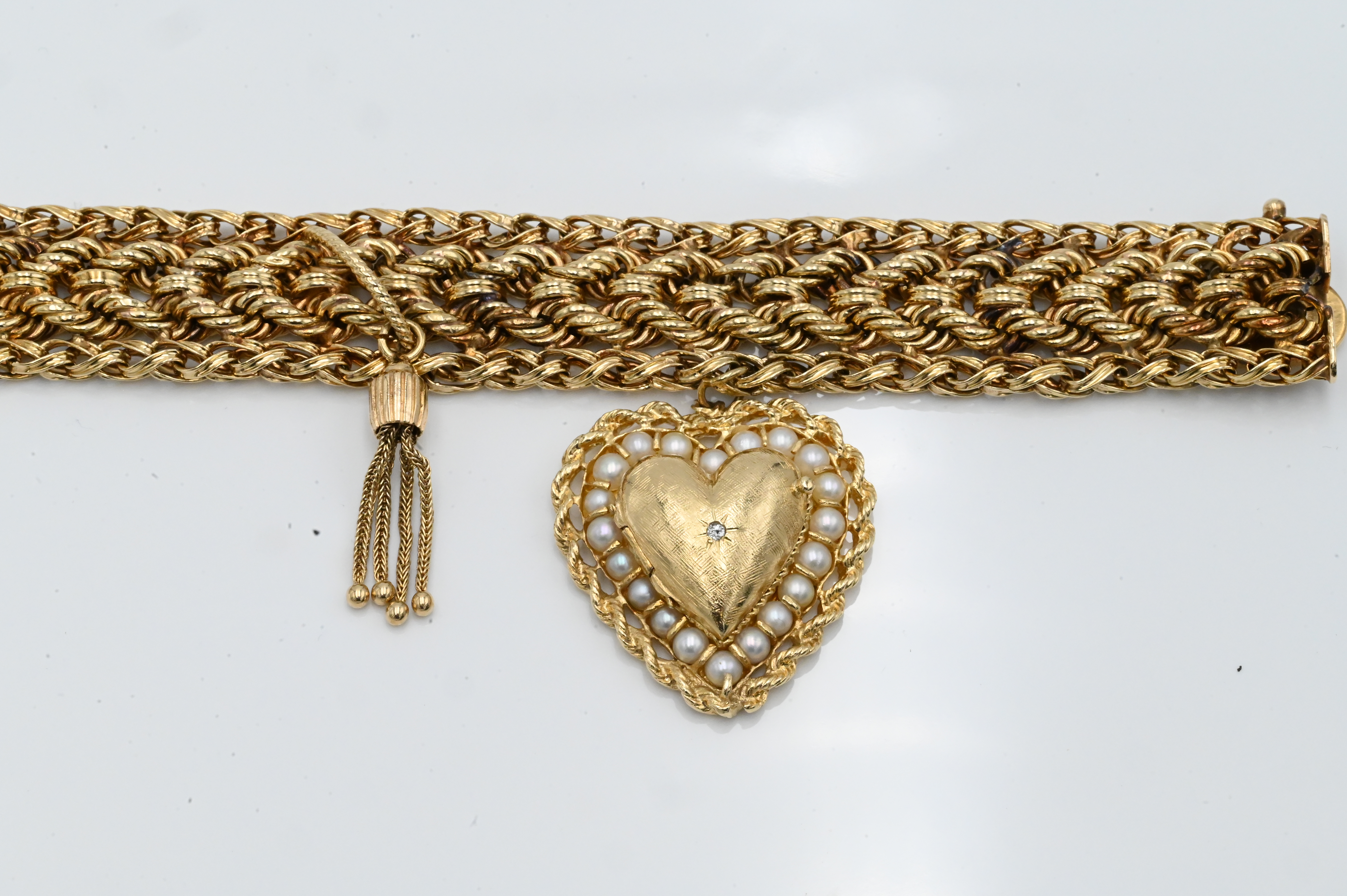 14 Karat Yellow Gold Wide Mesh Link Bracelet with Slide Clasp, the bracelet has a large 14 Karat yellow gold heart pearl and imitation diamond dangle charm/locket, in the center of the bracelet has a tassel, the bracelet measures 19.5mm wide approximately, the length of the bracelet is approximately 7.25″, the total weight of the bracelet is 64.83 grams.