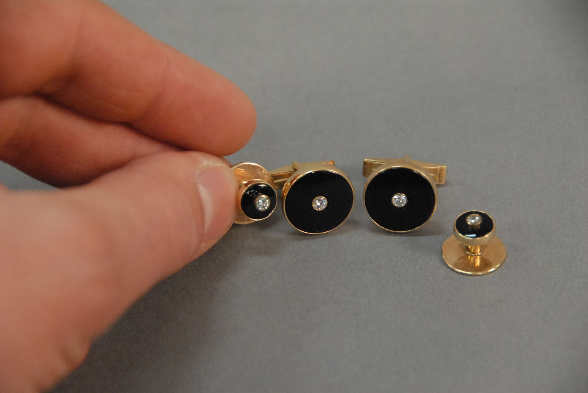 Lot 35: 14K four piece lot including pair of cufflinks and two buttons, each mounted with onyx and diamond. 12.4 grams total weight