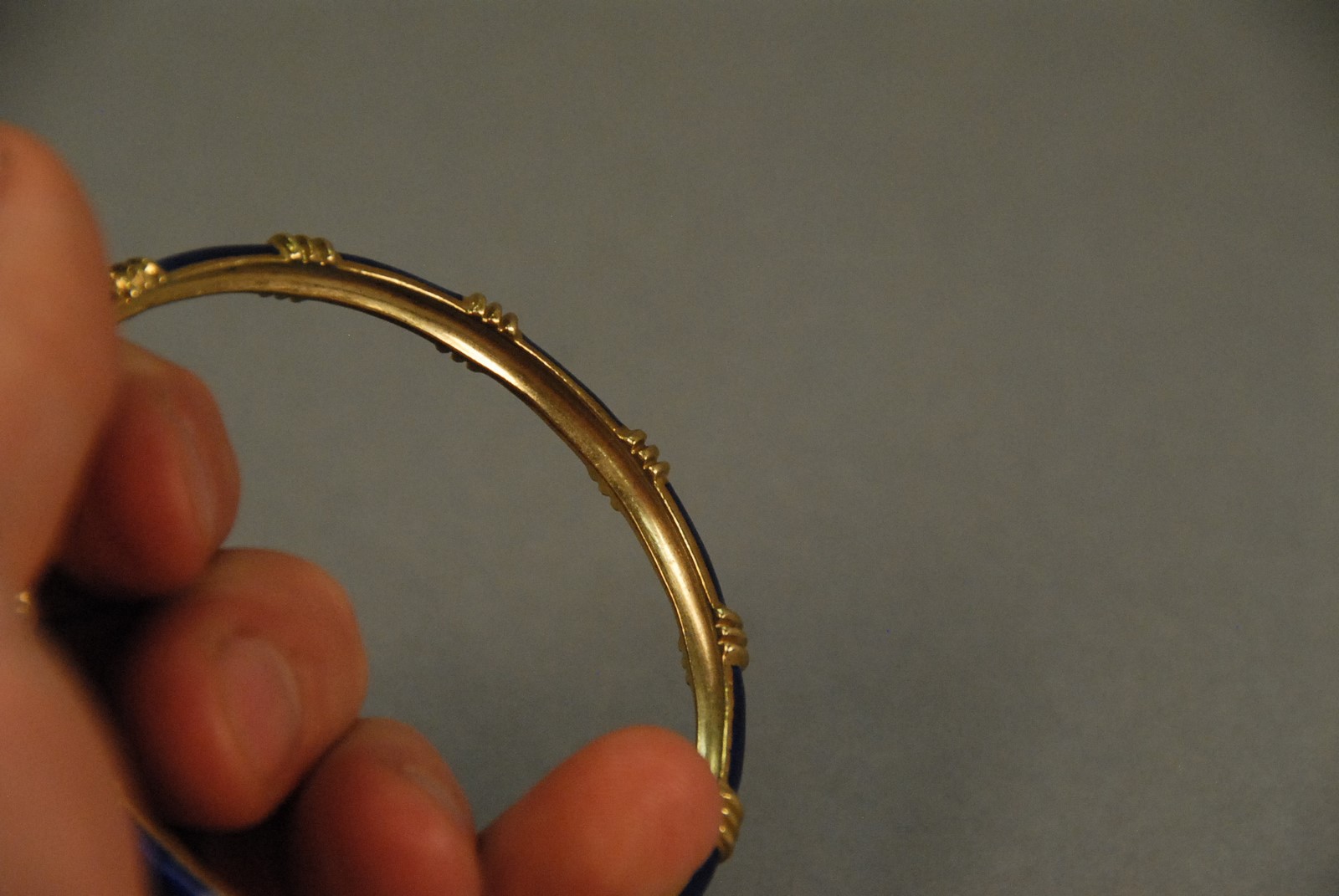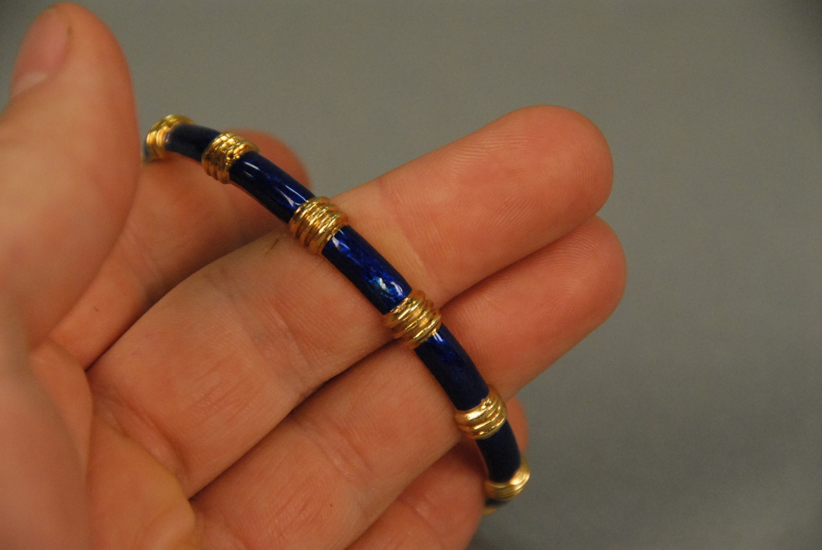 Lot 35: Cartier 18K yellow gold and blue enameled bangle bracelet, 30.5 grams. Provenance: Property from The Estate of Margaret Reventlow of Litchfield, CT minor chip in one panel
