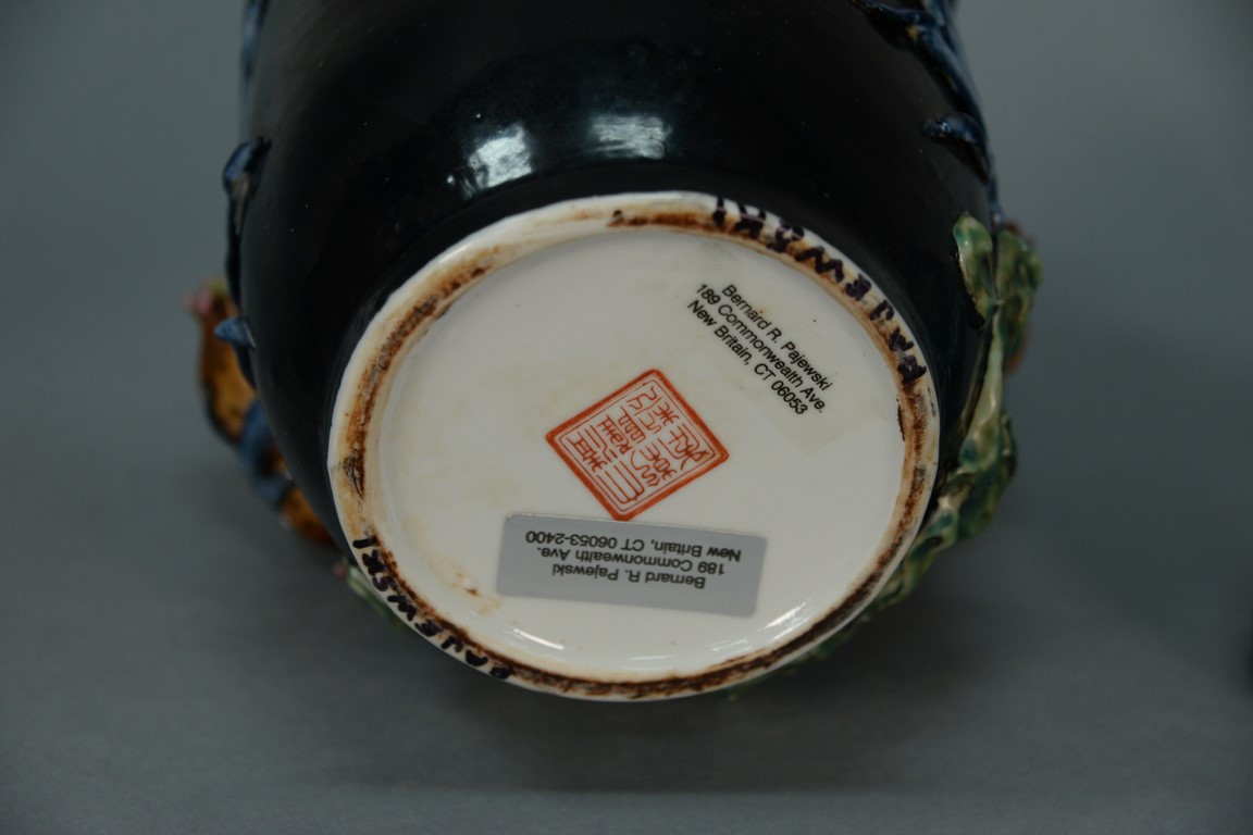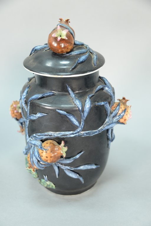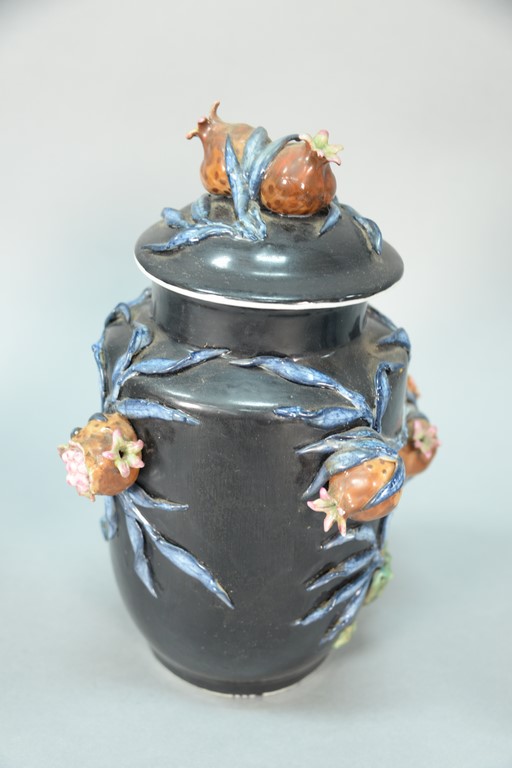 Lot 35: Chinese famille noire porcelain covered jar having high relief plants and pomegranate. height 12 inches
