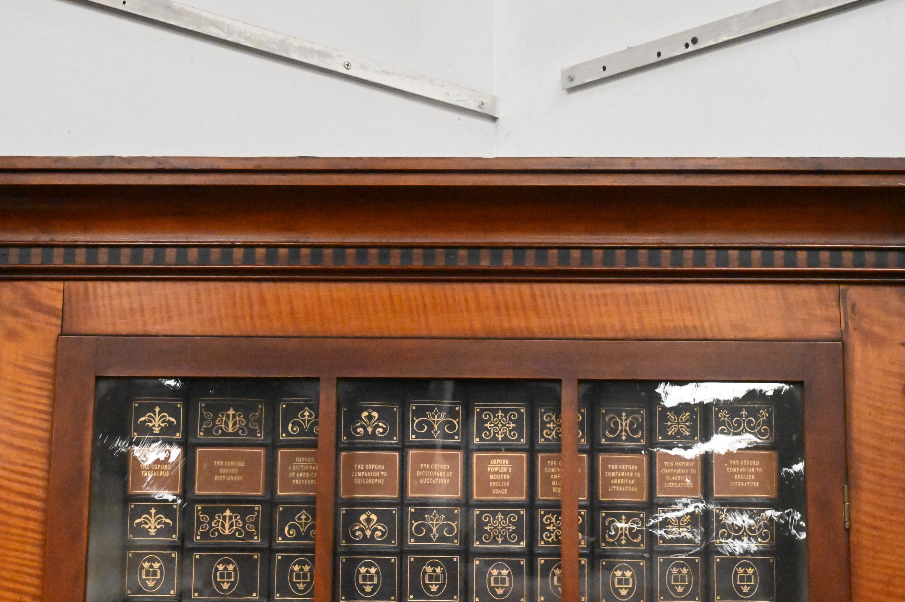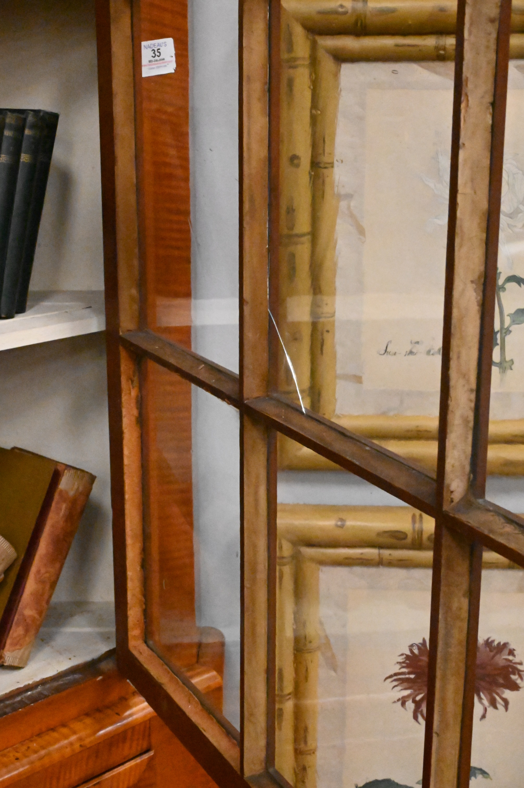 In two parts, upper section having cornice molding over inlaid ebonized molding over glazed twelve panel glass door on lower section, having one drawer over two panel door all on carved base with bracket feet