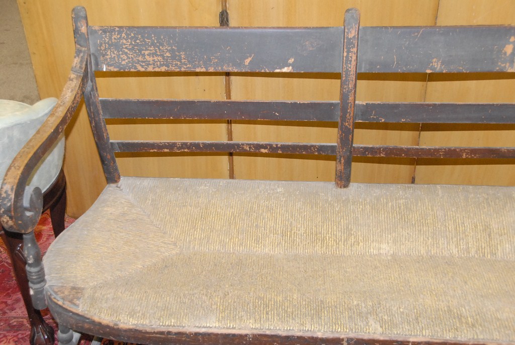 Early three seat thumb back bench with rush seat low.