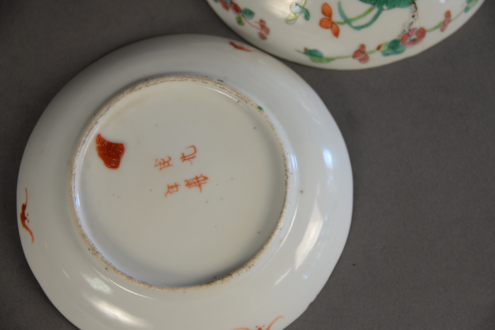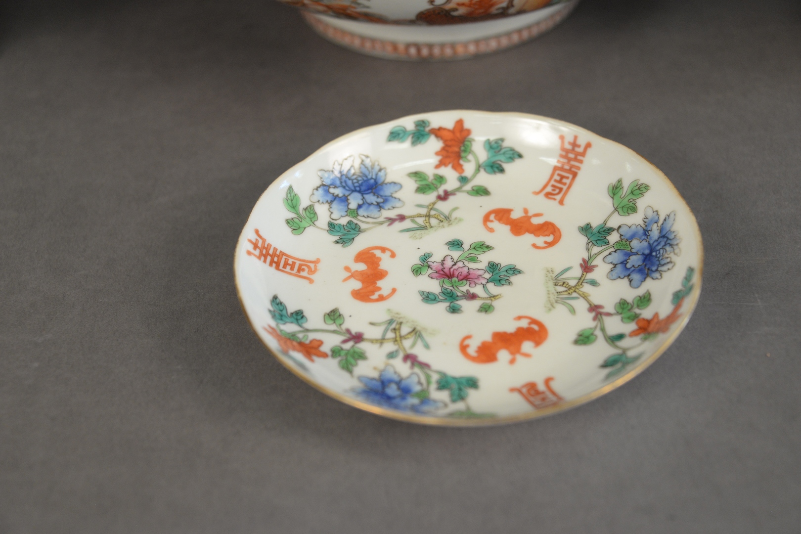 Four Piece Chinese Porcelain Group, to include Chinese Export bowl (as is), pair of Famille Rose compotes, along with a bat dish, 10 3/8 inches diameter bowl.
