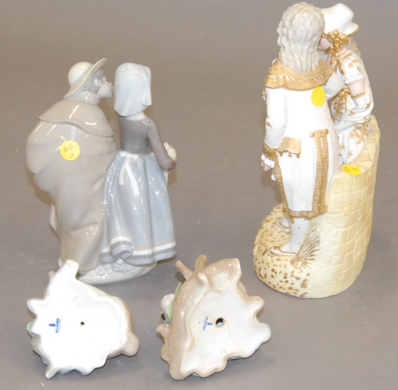 Four piece lot three Lladro ht. 9, 3 & 3 and Bisque double figure ht. 11.