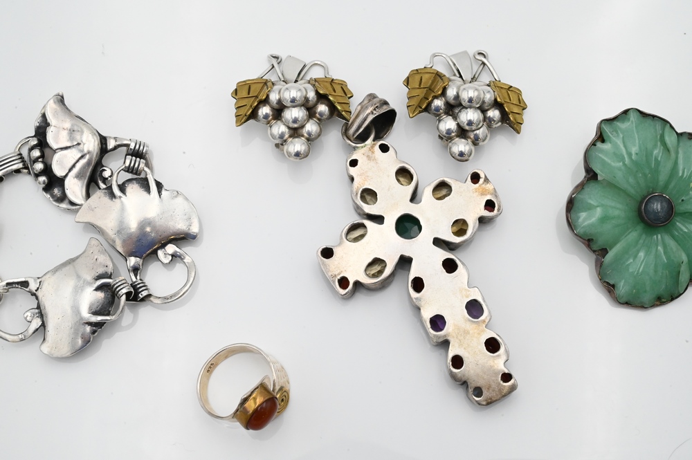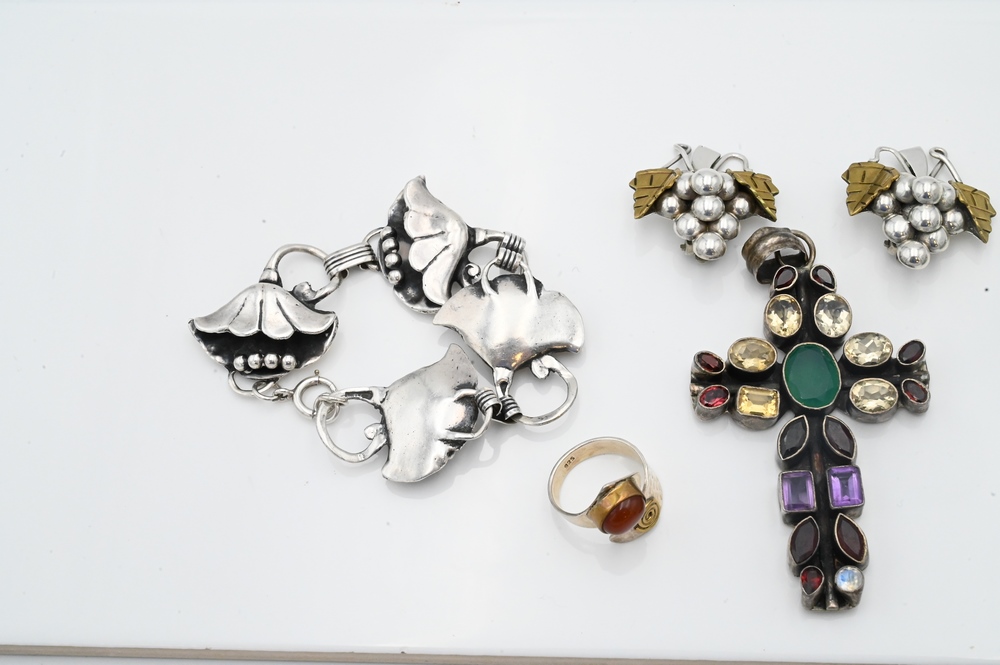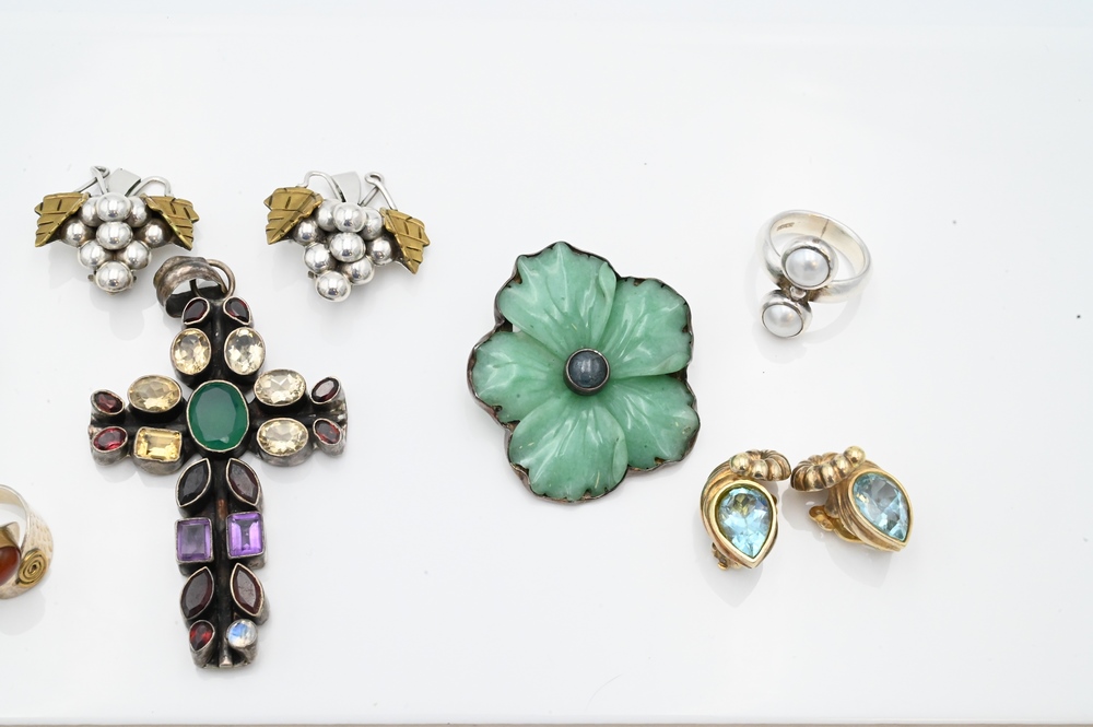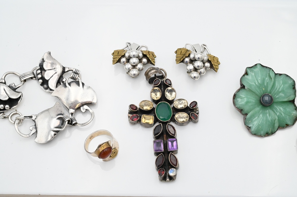 Group of Sterling Jewelry, to include a flower brooch with carved hardstone, earrings depicting grapes, bell flower bracelet, rings, etc.