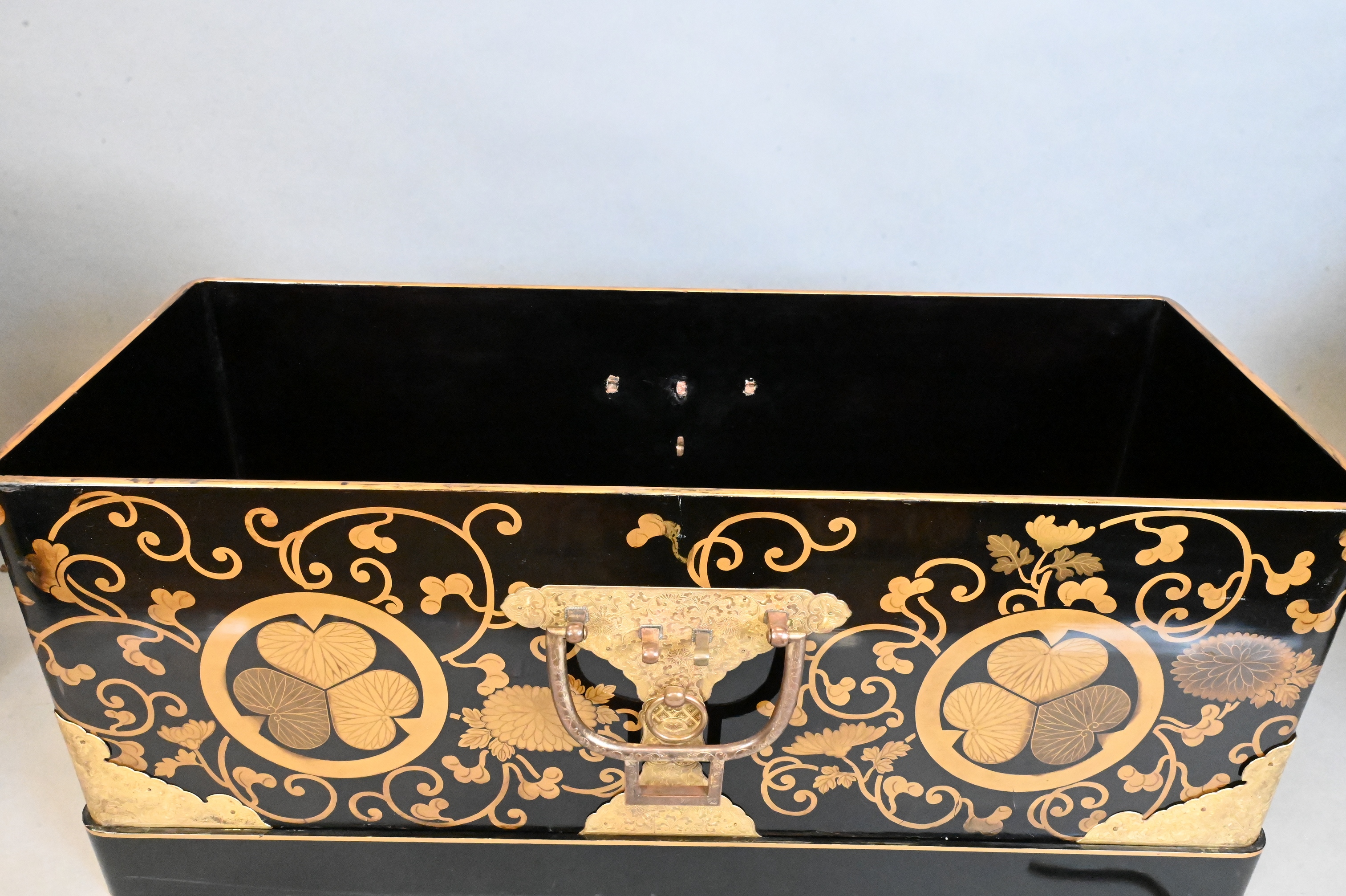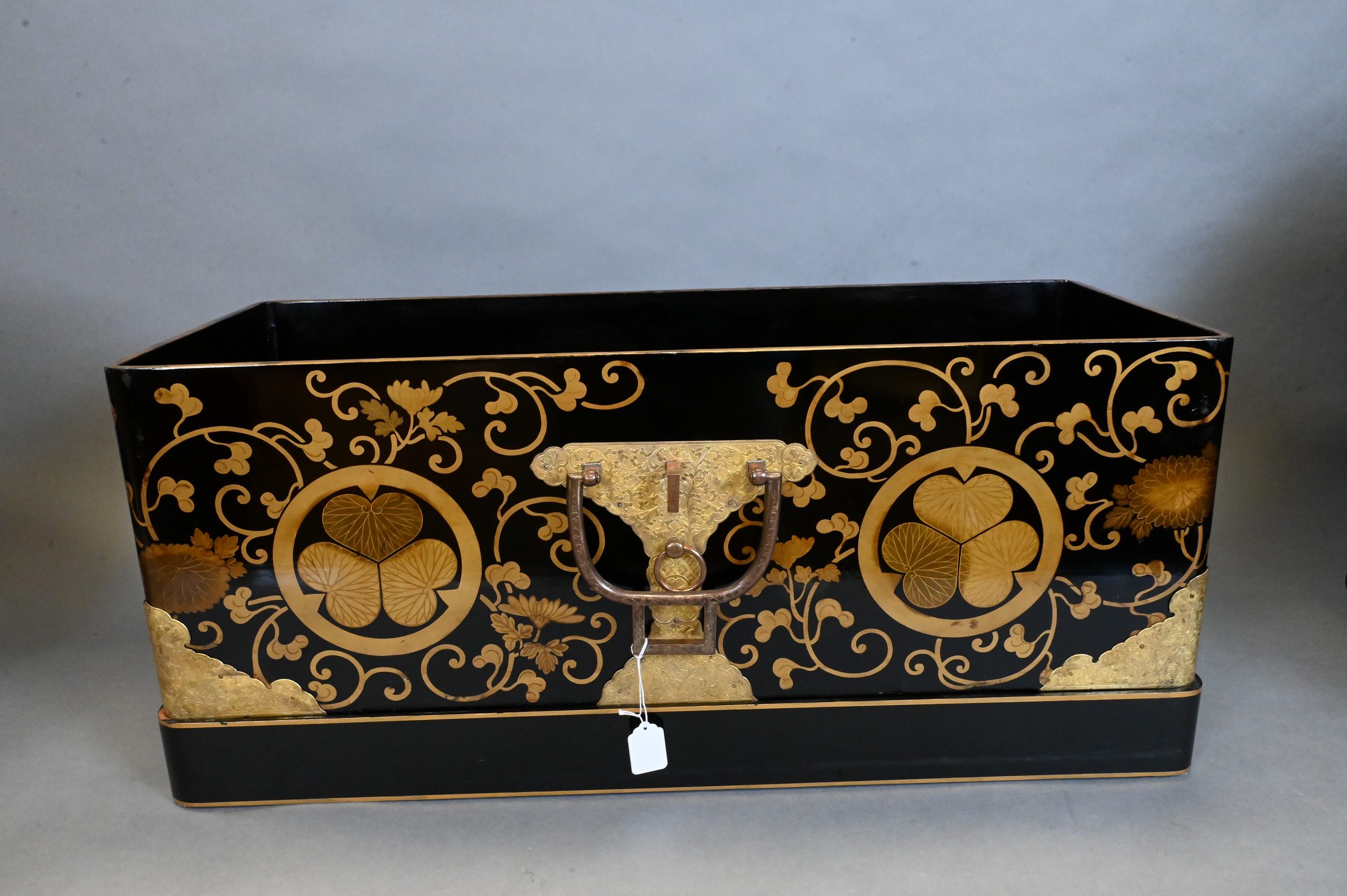 rectangular chest with black lacquer ground intricately decorated in gold hiramaki-e and takamaki-e with scrolling vines and stylized mon (family crests), fitted with finely cast bronze corner mounts, lock plate, and carrying handles, and raised on a conforming lacquered base, interior lacquered black, Meiji period, late 19th century