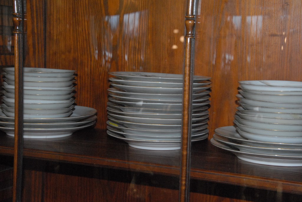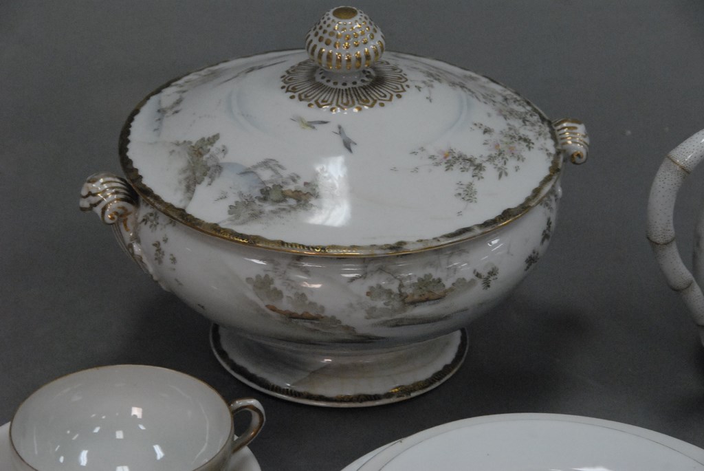 Japanese china dinnerware set, 119 pieces to include 25 dinner plates, 26 saucers, 19 dessert plates, 12 salad plates, 28 cups, 2 platters, 2 covered vegetable dishes, coffee pot, hot water pot, sugar dish, and 2 small cups.
