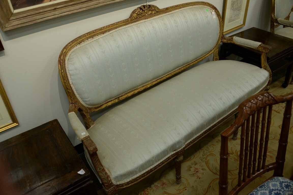 Lot 35: Louis XVI three piece suite to include canape with gilt frame and pair of fauteuil. ht. 40in., wd. 64in. Provenance: Collection of A…