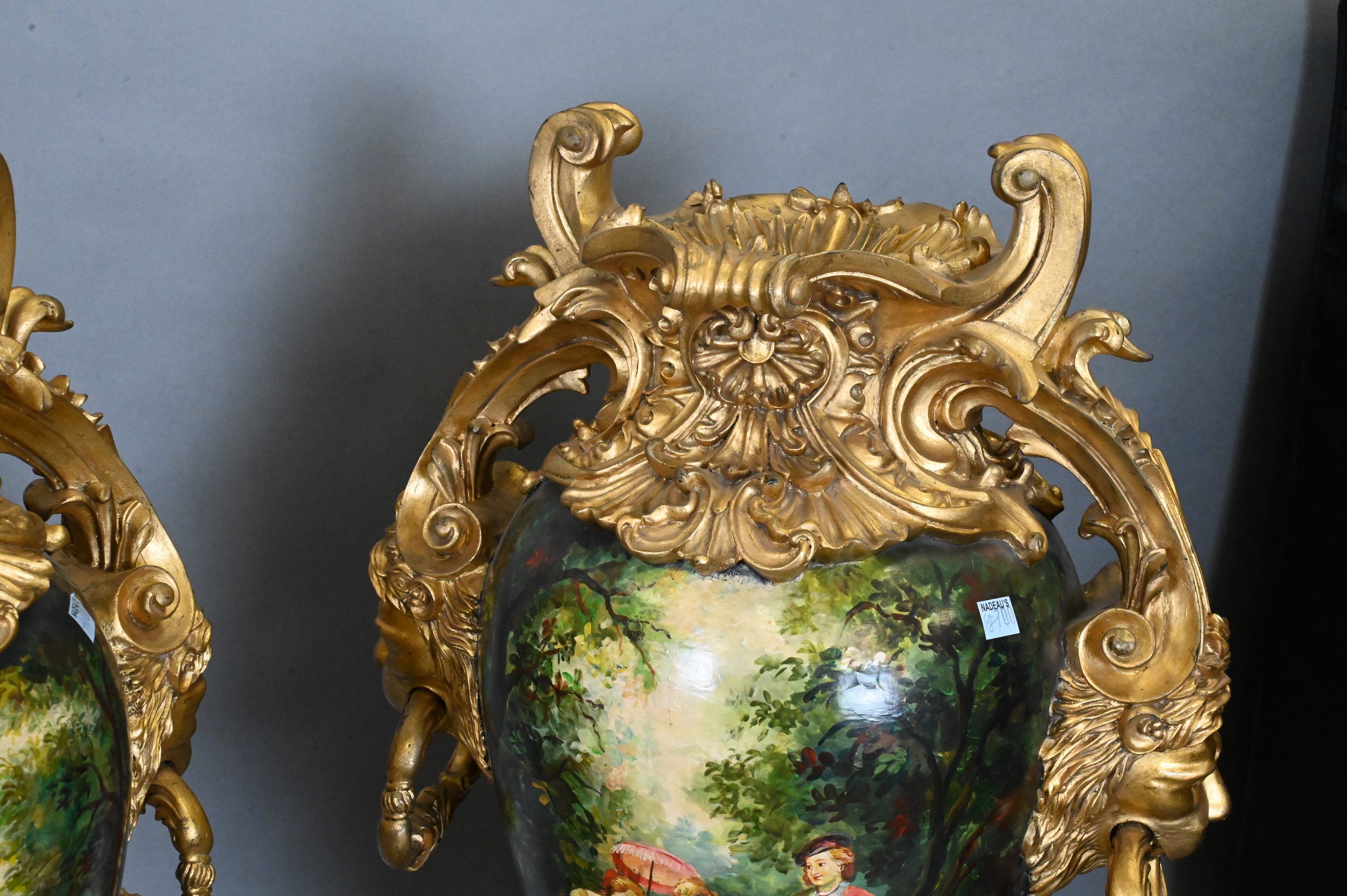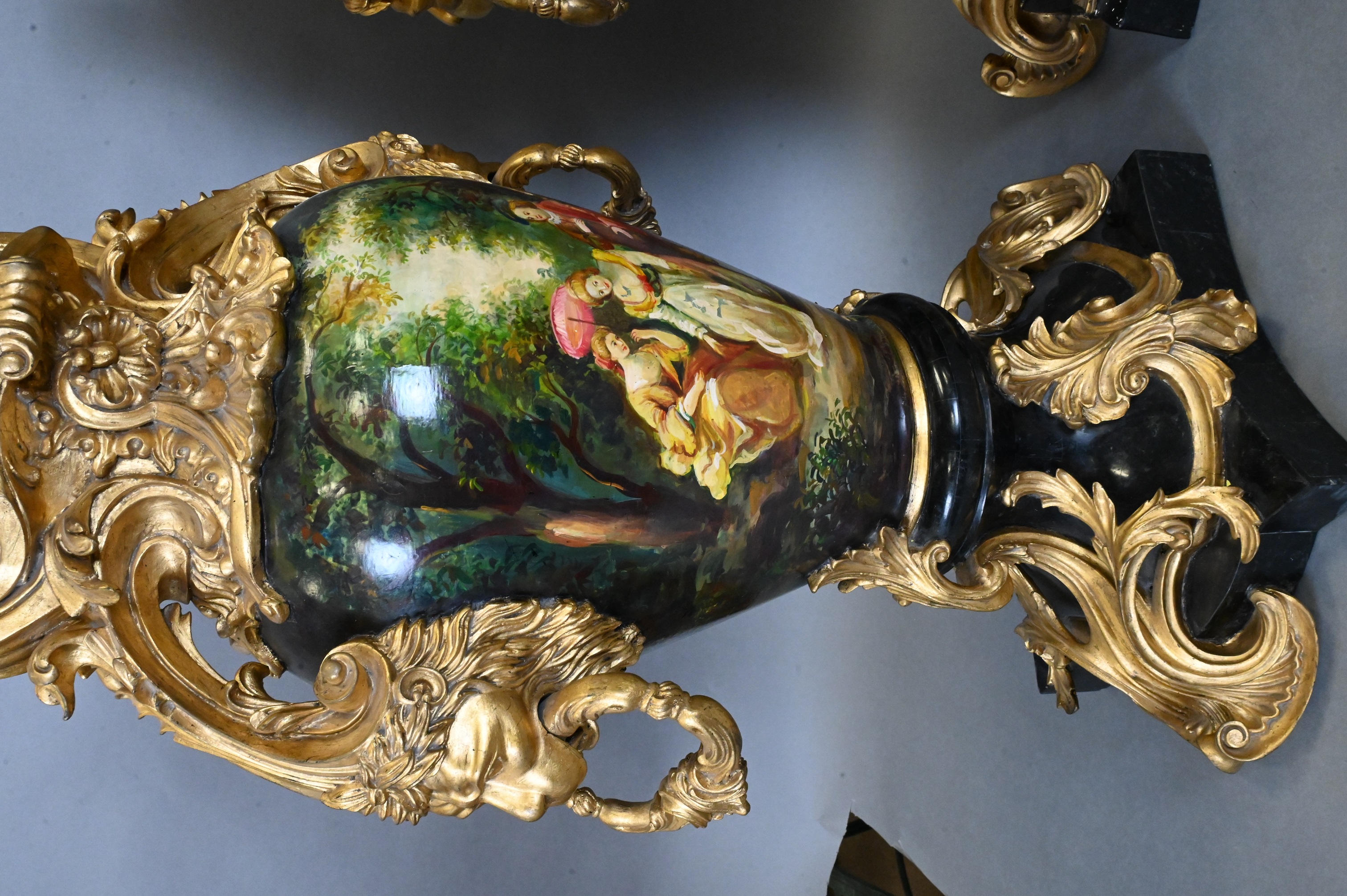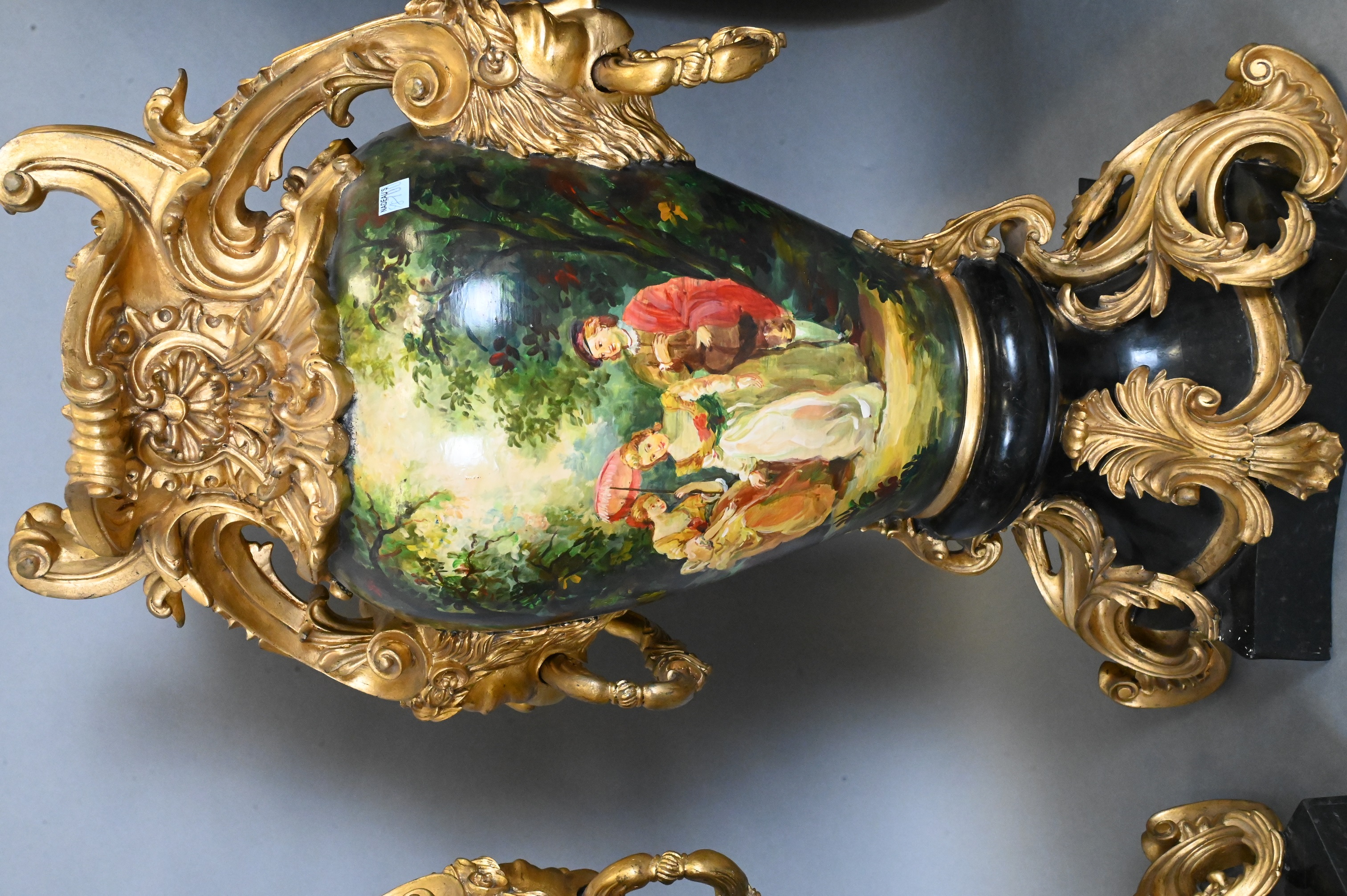 having cast composition baluster form body with ornate Rococo giltwood mounts and lion head door knocker handles, painted garden motif with 18th century French courtesans, set on lacquered base surrounded by giltwood acanthus leaves