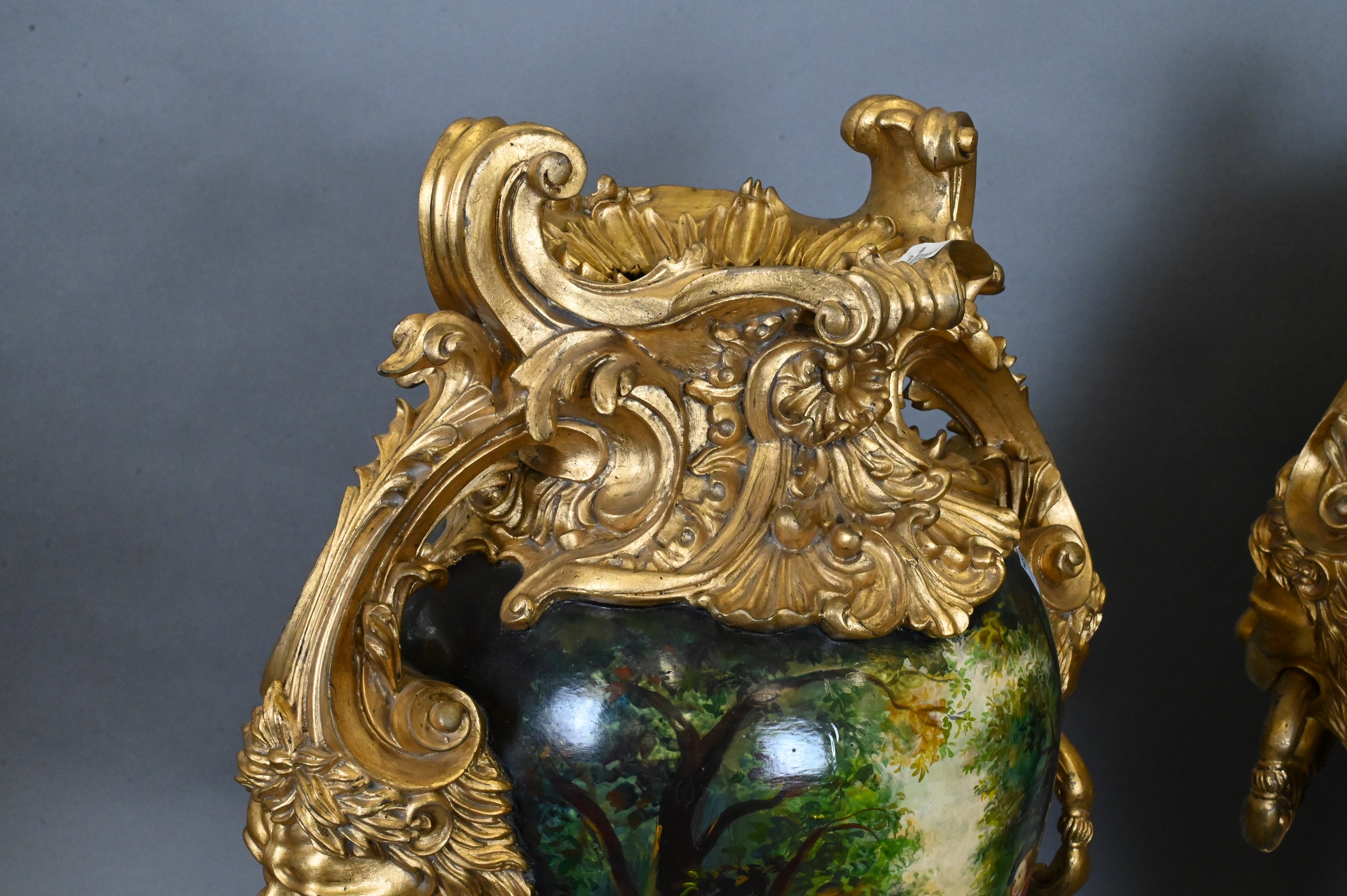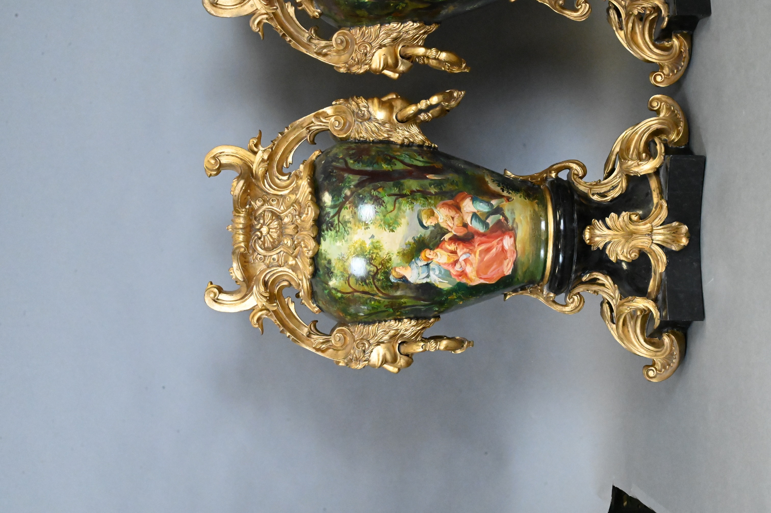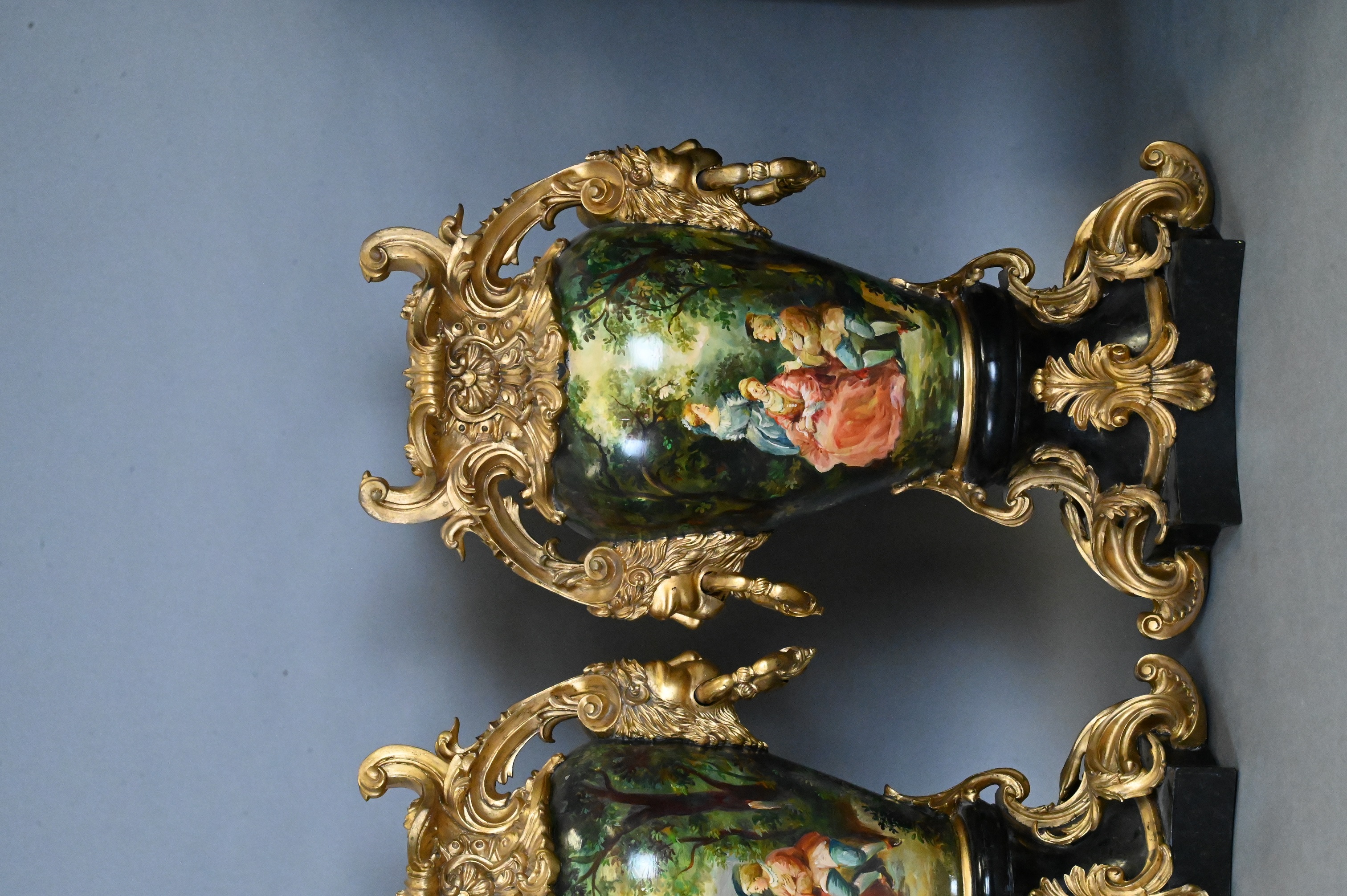 having cast composition baluster form body with ornate Rococo giltwood mounts and lion head door knocker handles, painted garden motif with 18th century French courtesans, set on lacquered base surrounded by giltwood acanthus leaves