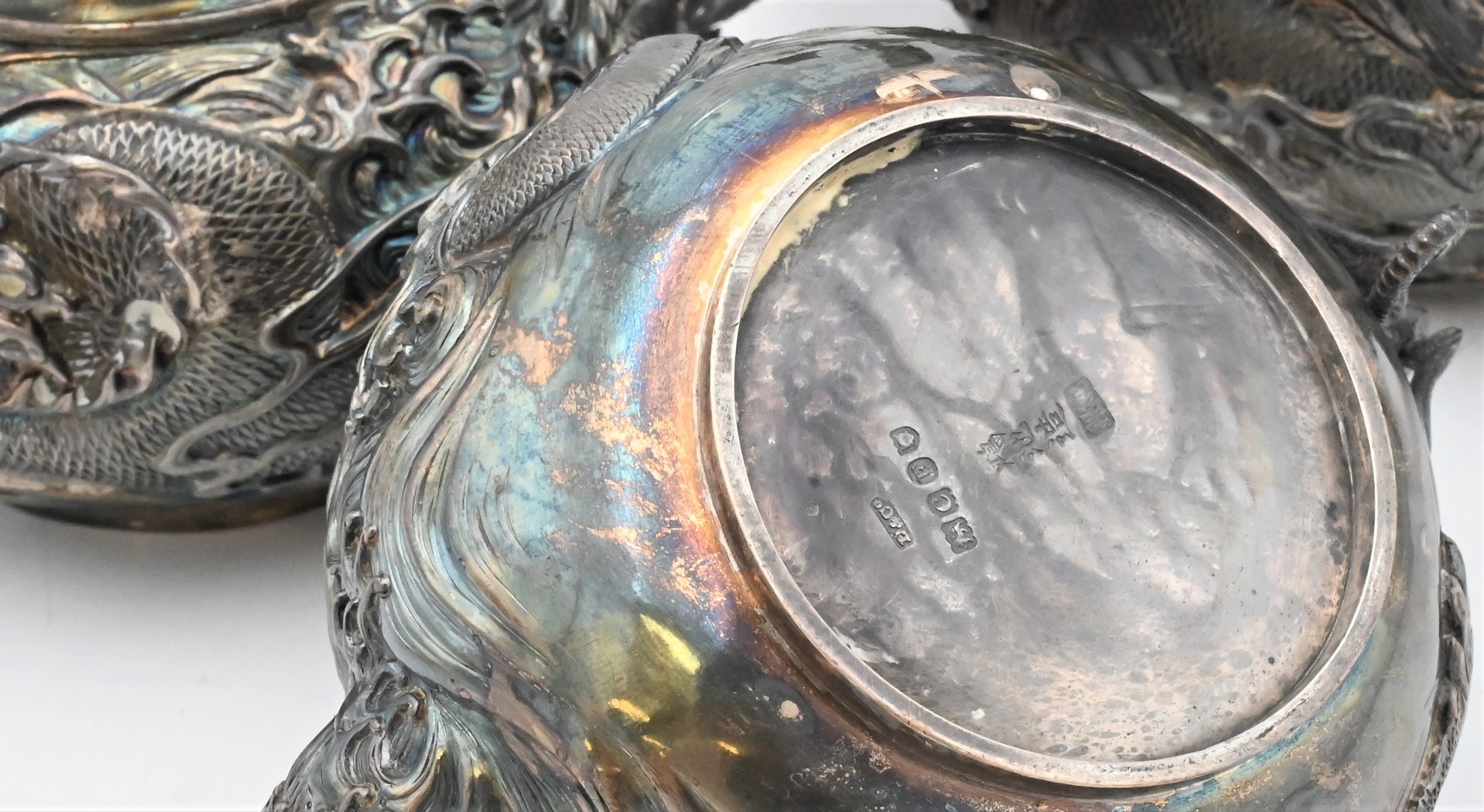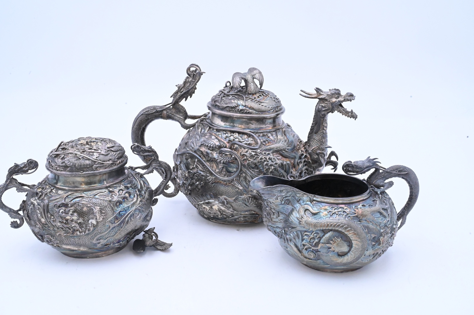 Silver Tea Set, in Chinese dragon form, to include teapot having dragon handle and spout, with bird finial; creamer with dragon handle; covered sugar having dragon handles and bird finial (finial off); height of teapot 6 inches; 50.8 t.oz, Provenance: From Collection in Irvington, New York.