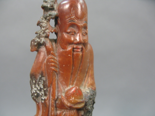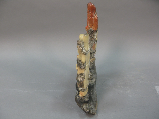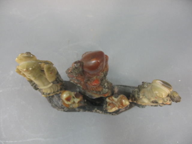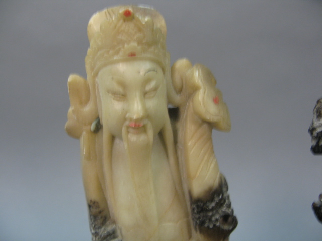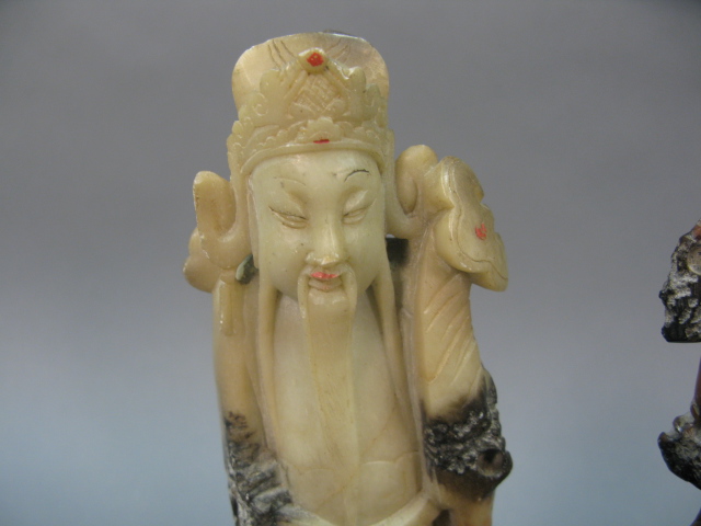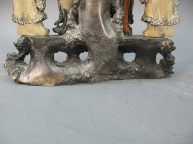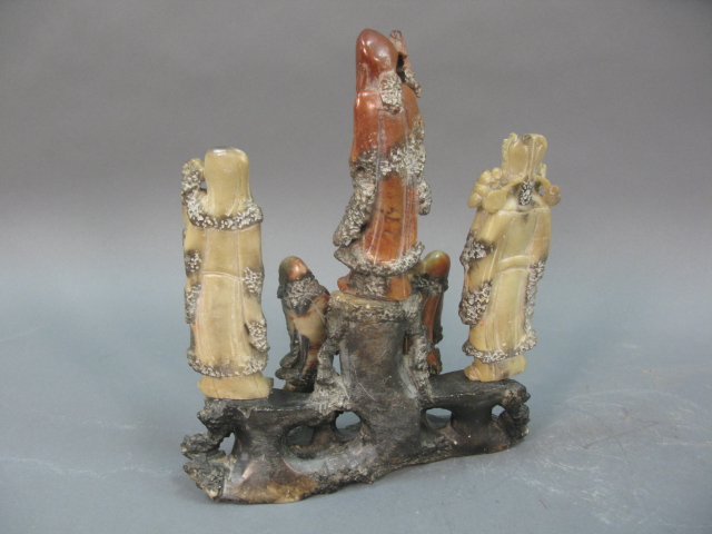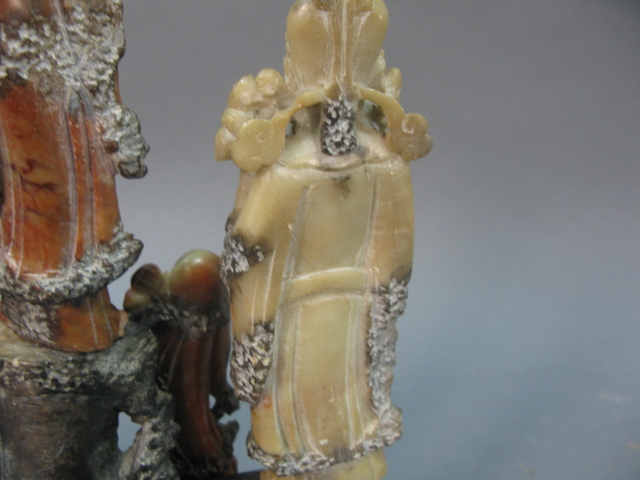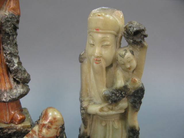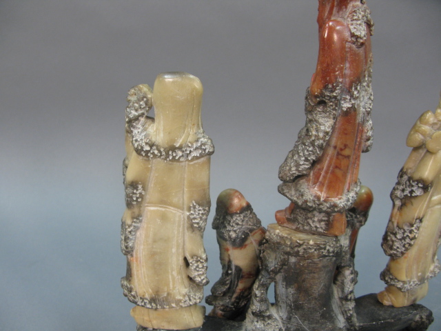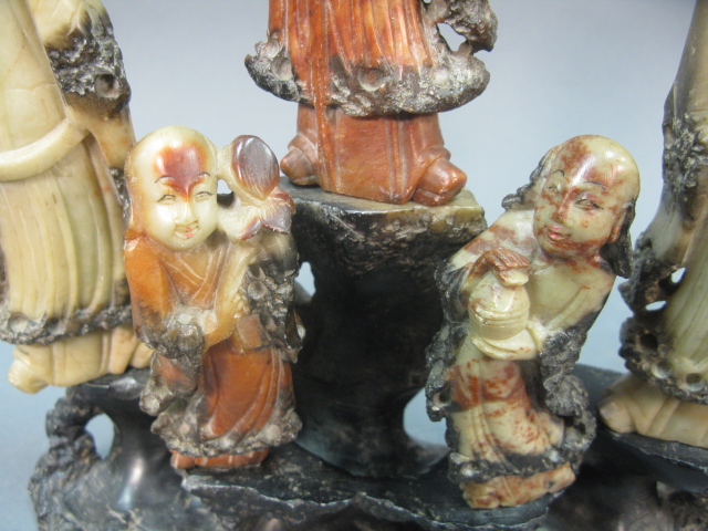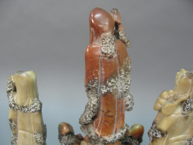 Six piece soapstone set having five carved Deity figures standing on stone ledge.
