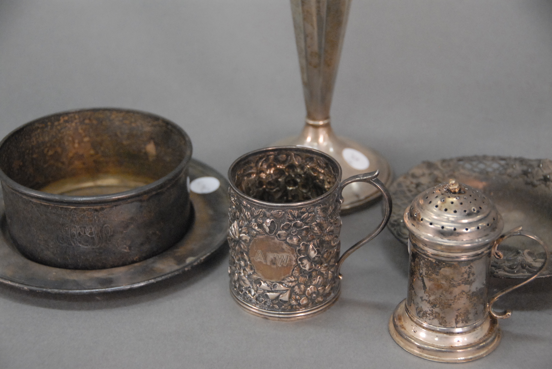 Six piece sterling silver lot with repousse cup and weighted vase.