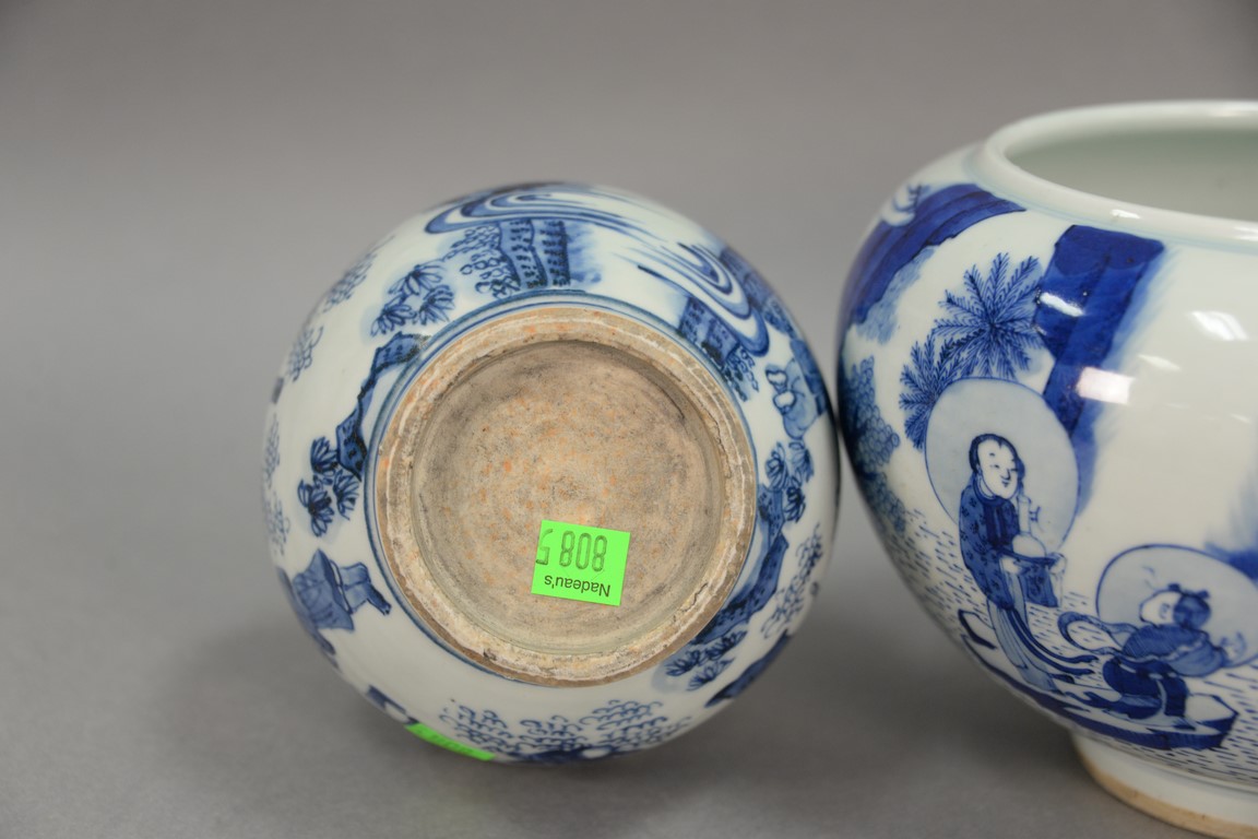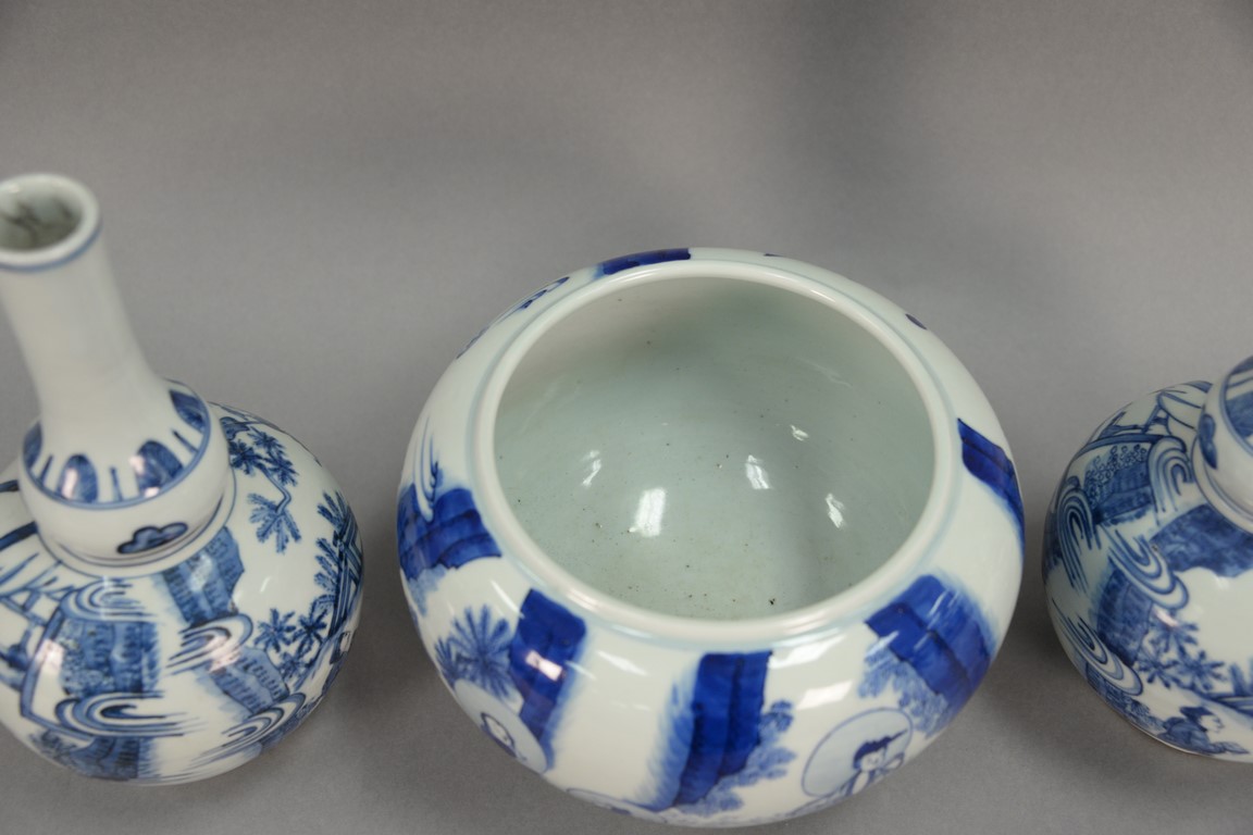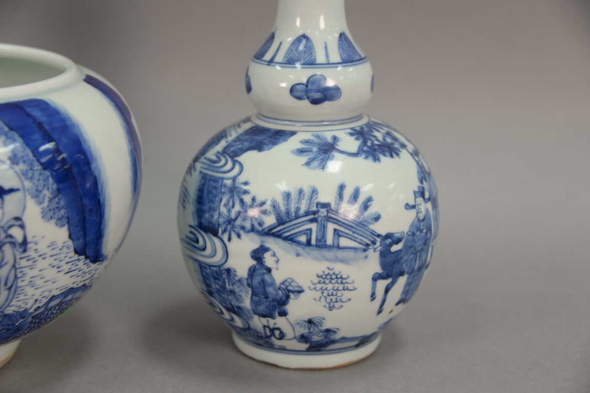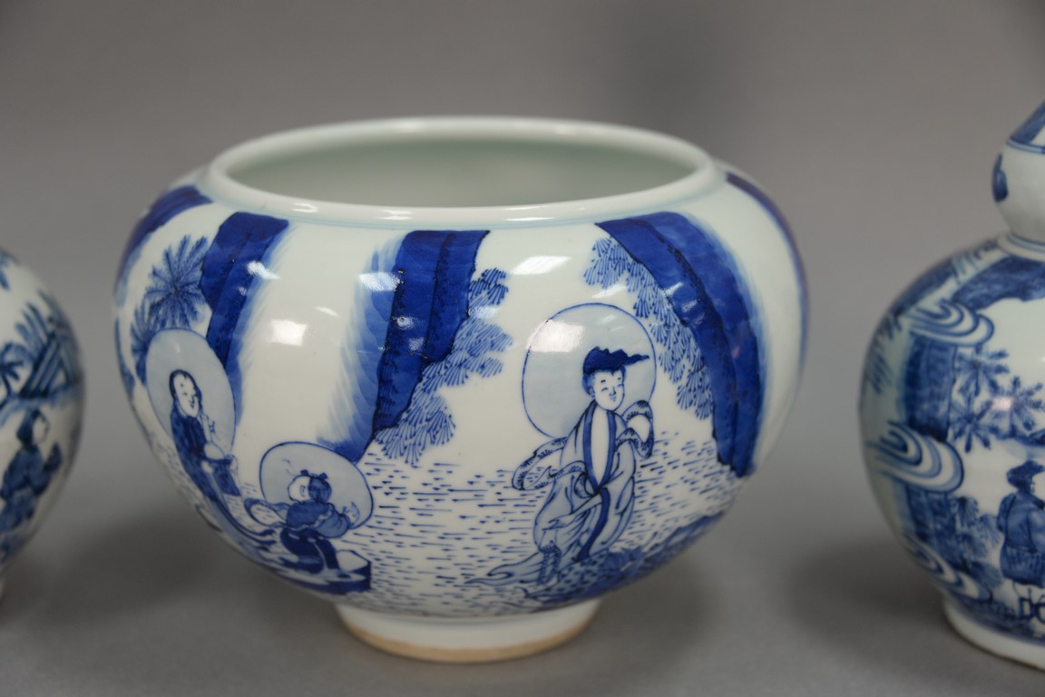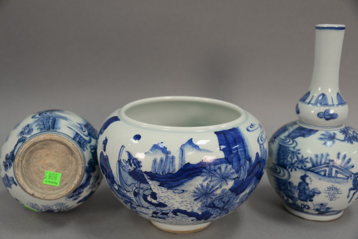Three blue and white Oriental porcelain pieces to include a pair of double gourd globular vases and a blue and white pot. hts. 6 1/2in. to 10in.
