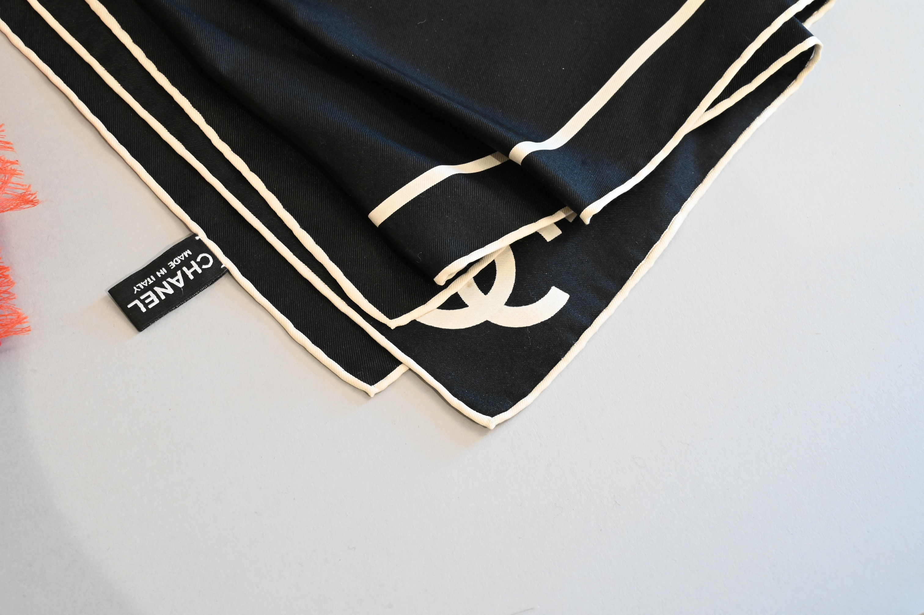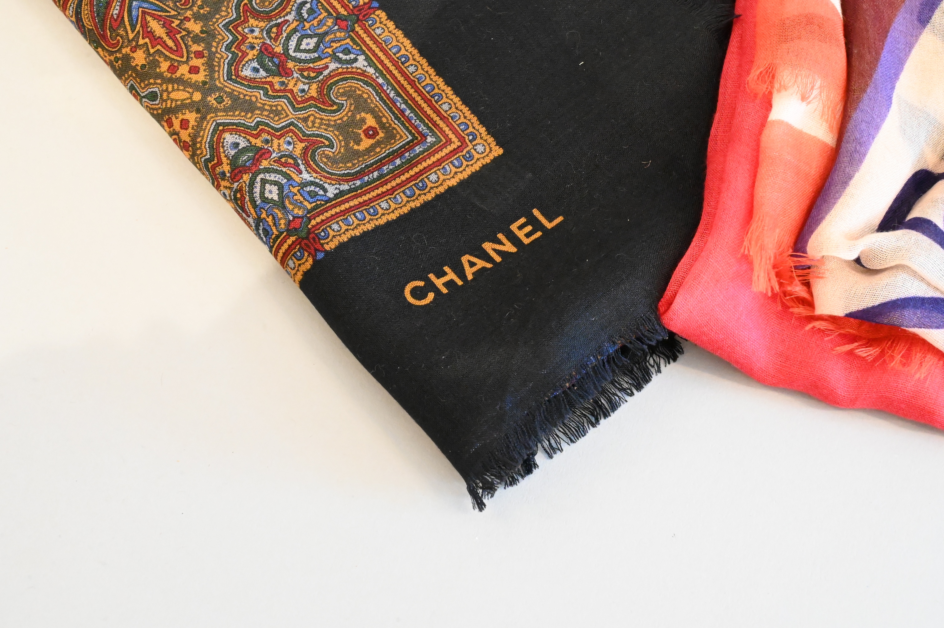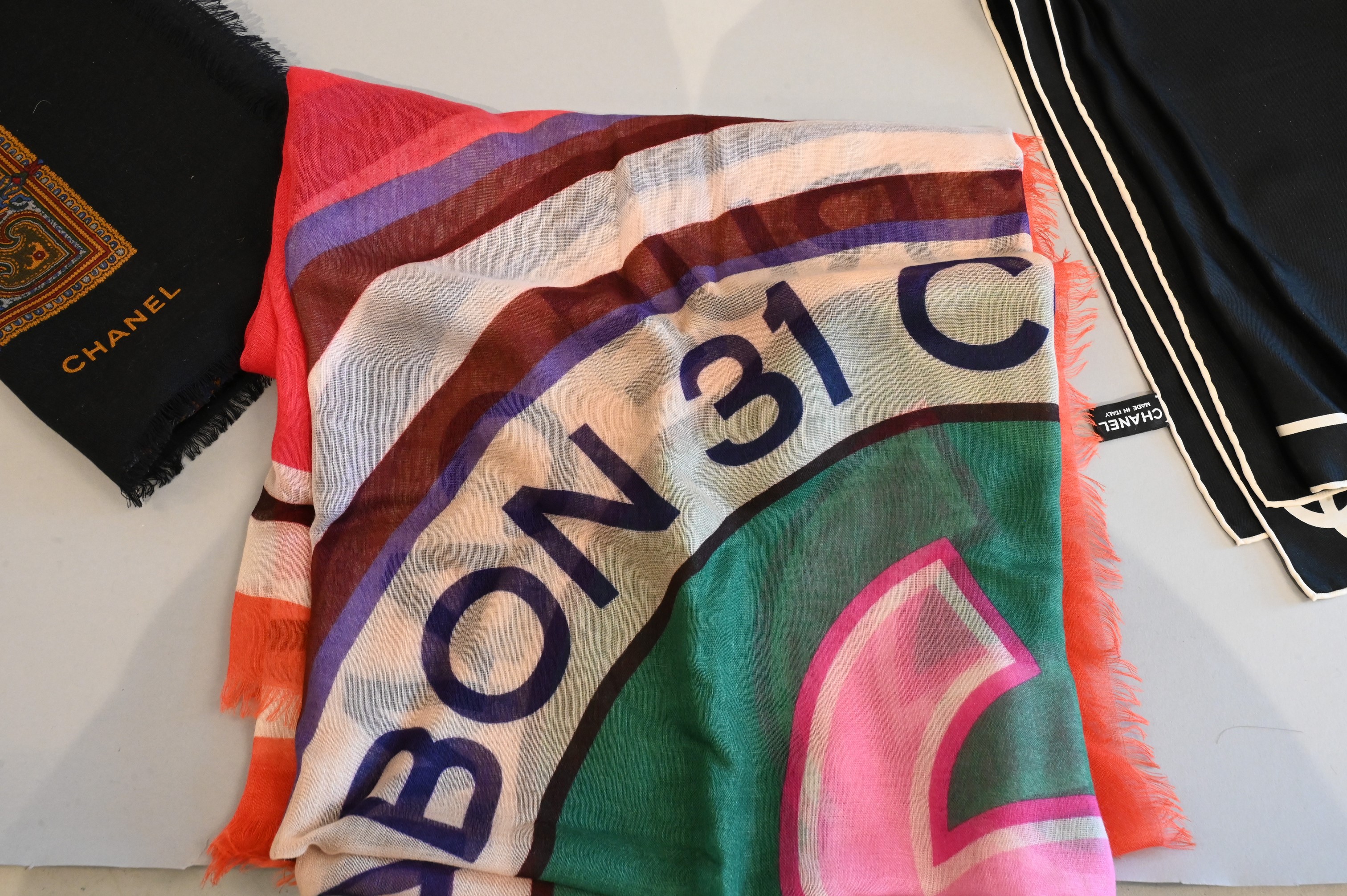to include Coco Chanel Paris Rue Cambon 31 multi colored cotton shawl in pink, green, and orange