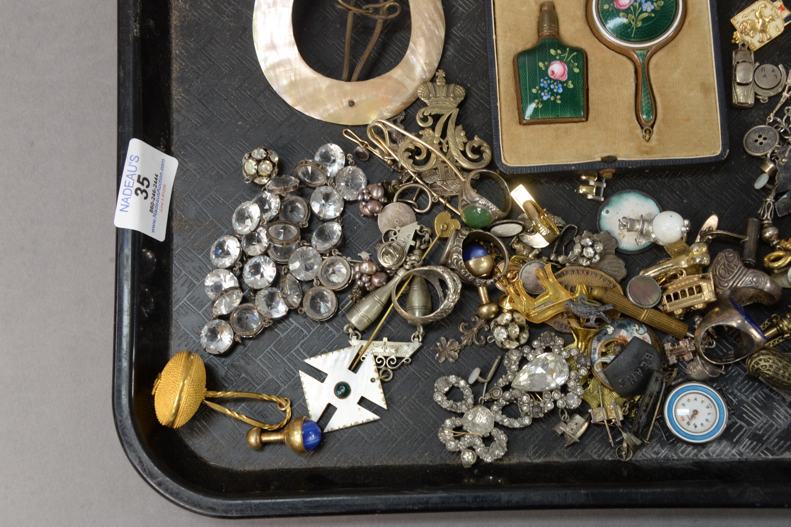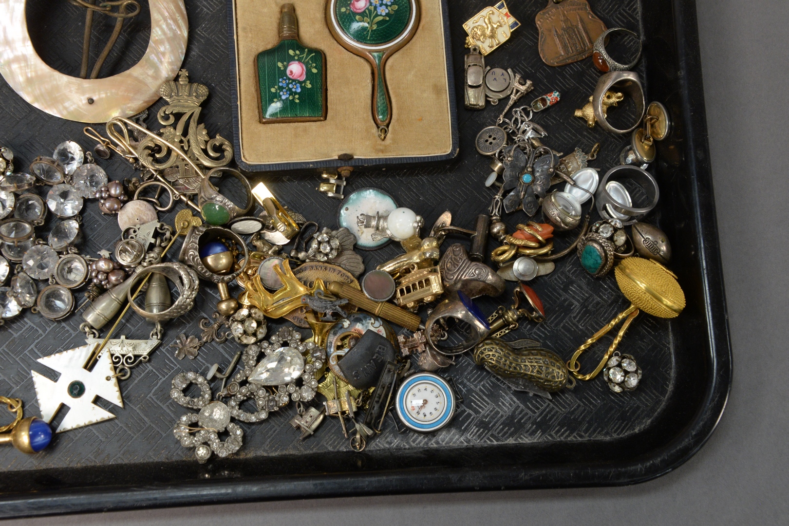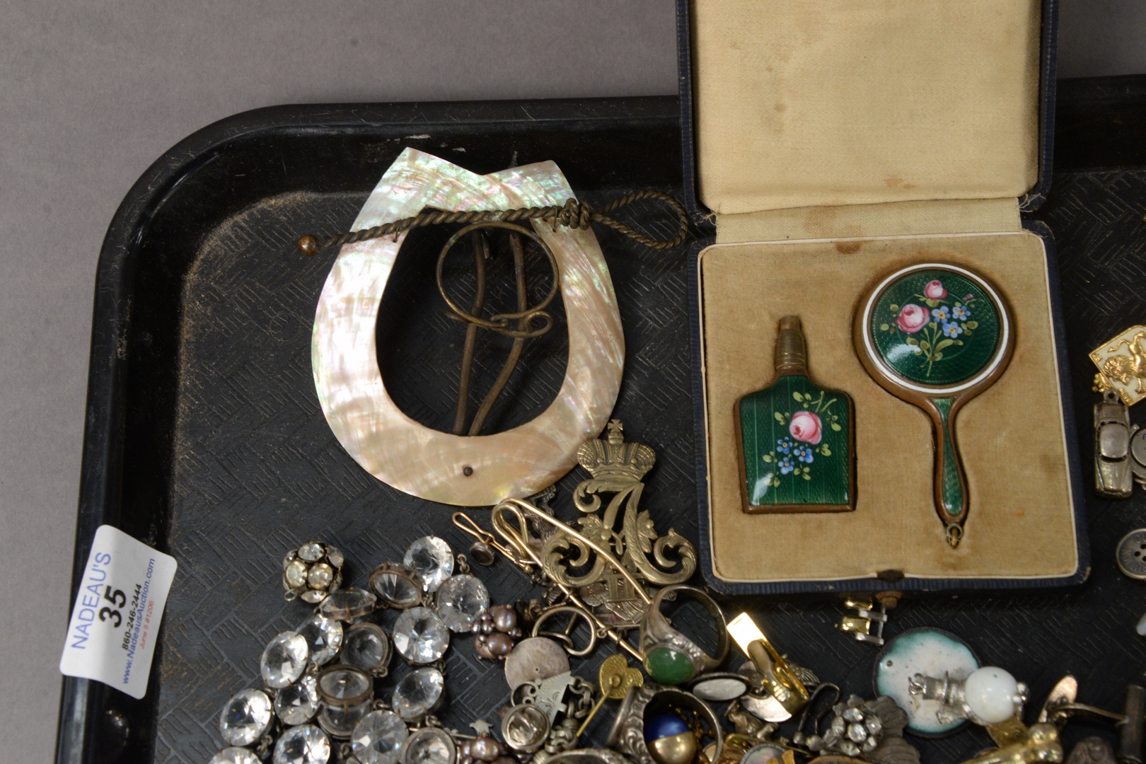 Lot 35: Tray Lot of Custom Jewelry and Assorted Items, to include enameled bottle and miniature mirror in fitted case, sterling rings, enameled clock, rhinestones, etc.