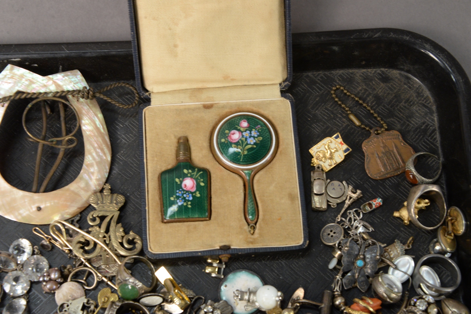 Tray Lot of Custom Jewelry and Assorted Items, to include enameled bottle and miniature mirror in fitted case, sterling rings, enameled clock, rhinestones, etc.