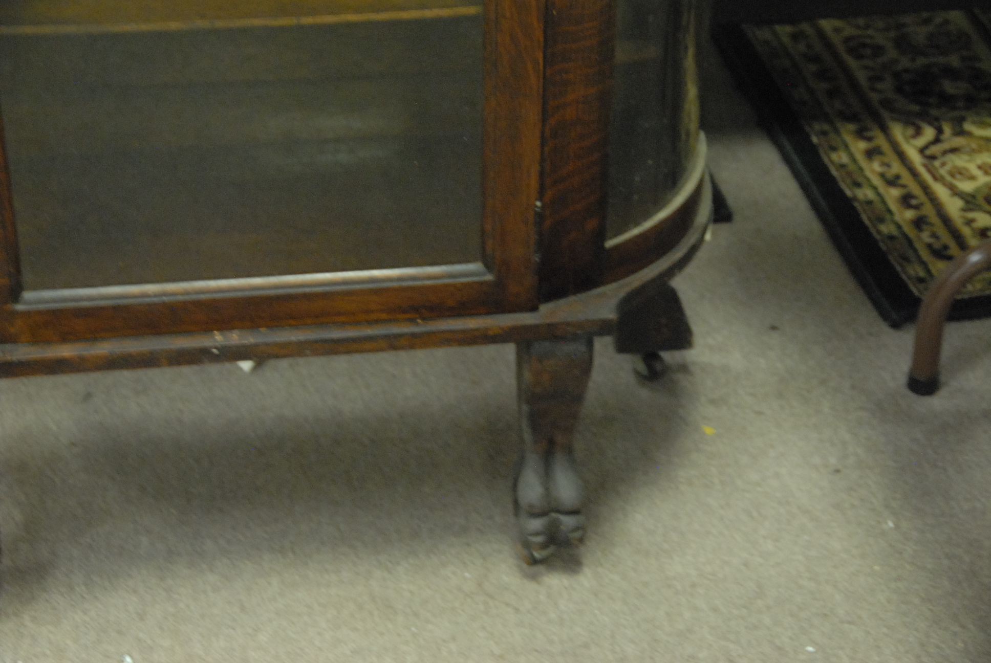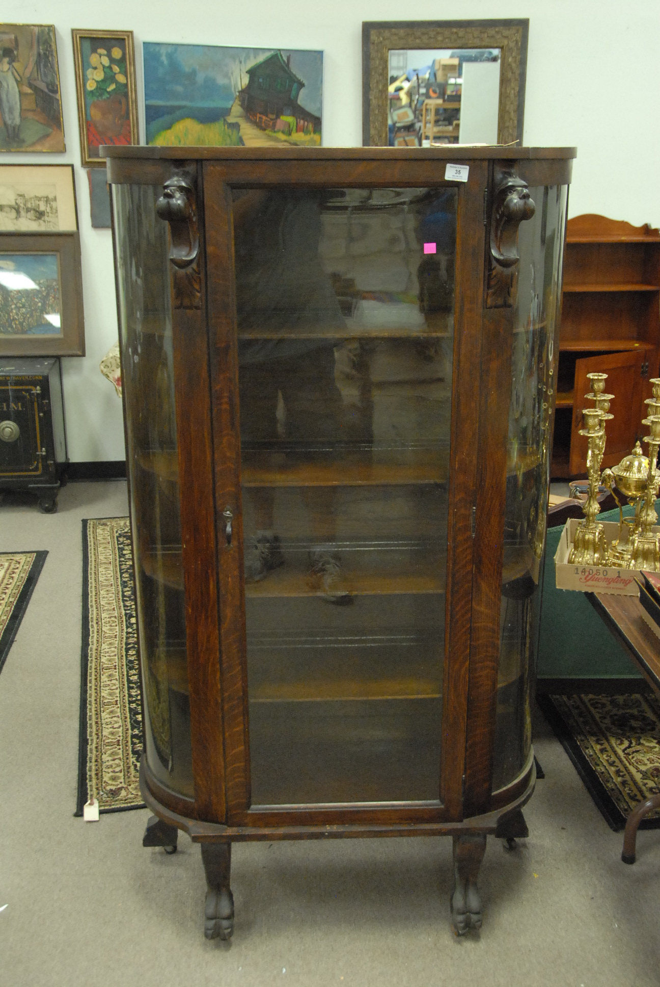 Victorian oak bowed side china cabinet with screaming lions, ht. 63in. wd. 35in.