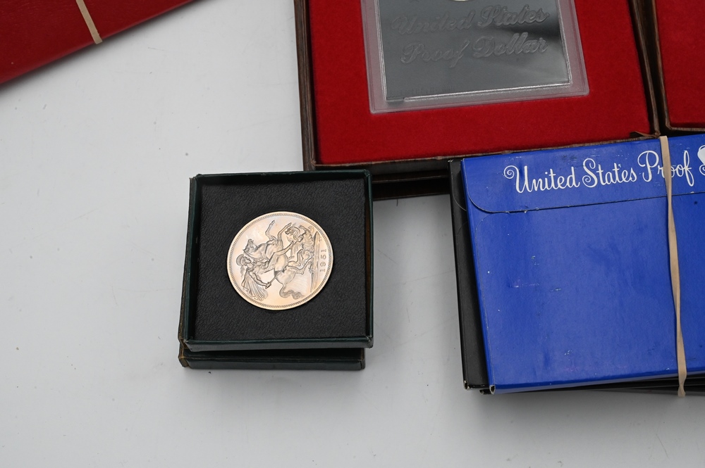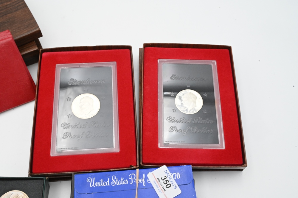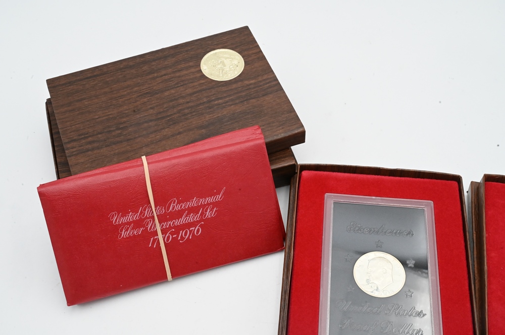Lot 350: 14 Piece Lot, to include 1970, 1976, 1977 proof sets, 3 Bicentennial sets, along with 2 1951 British sterling proof crowns.