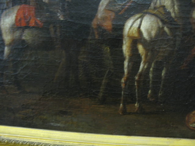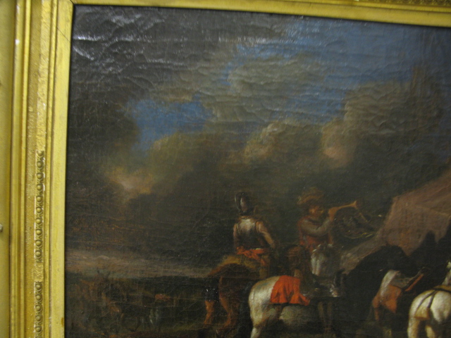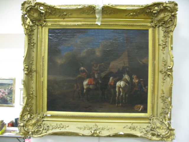 Attribution to Pieter Van Bloemen Flemish School, 1657-1720, early oil on canvas, men on horseback at an encampment. Attribution is marked on reverse.