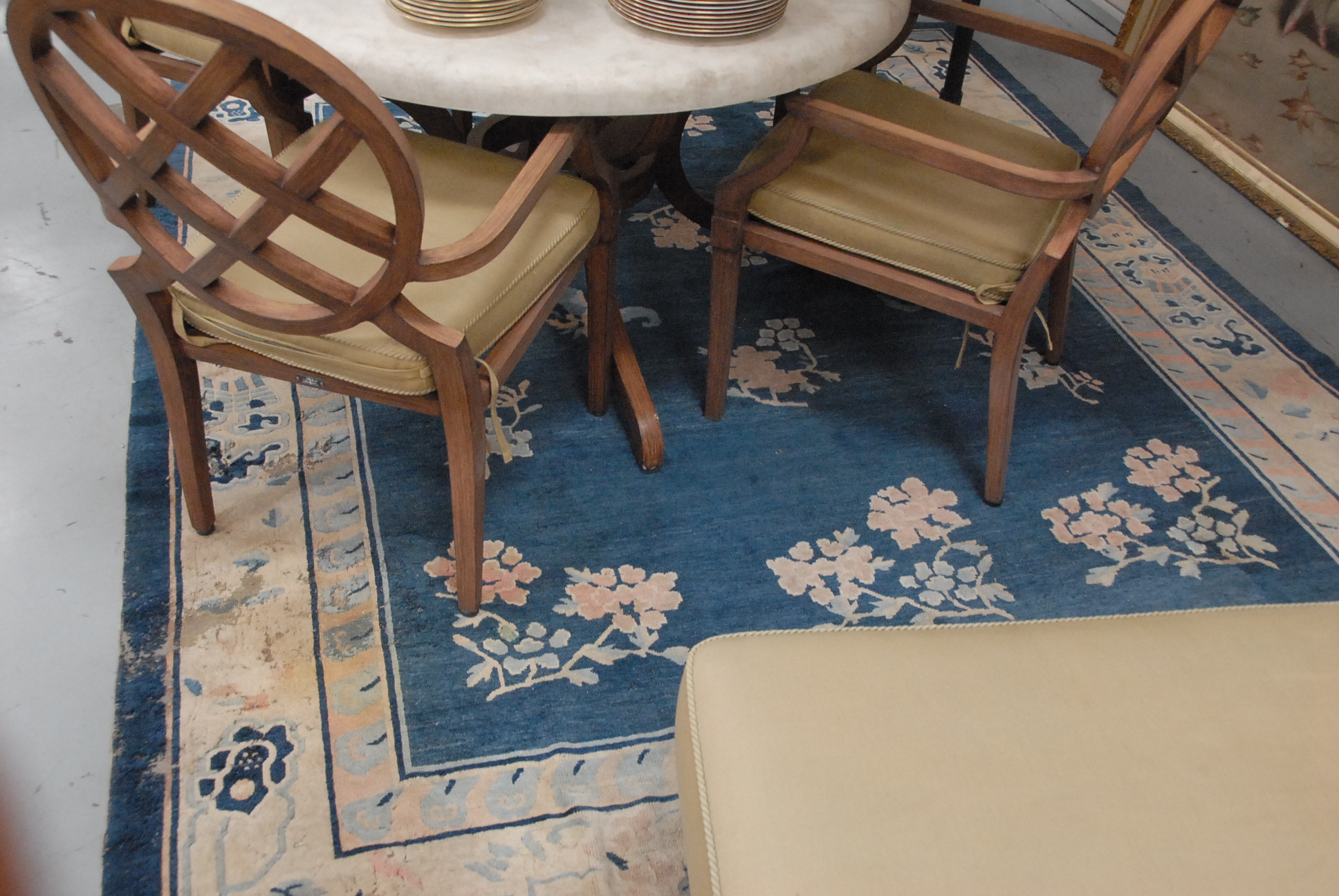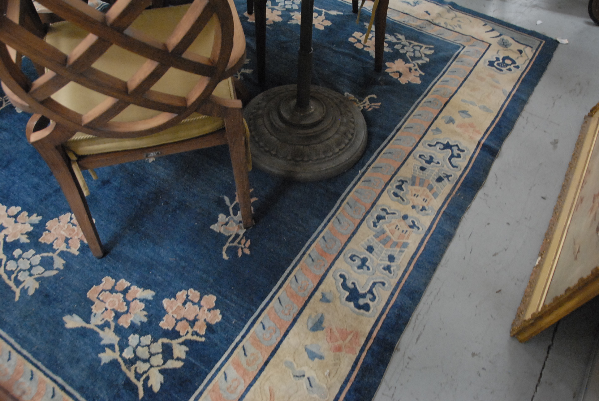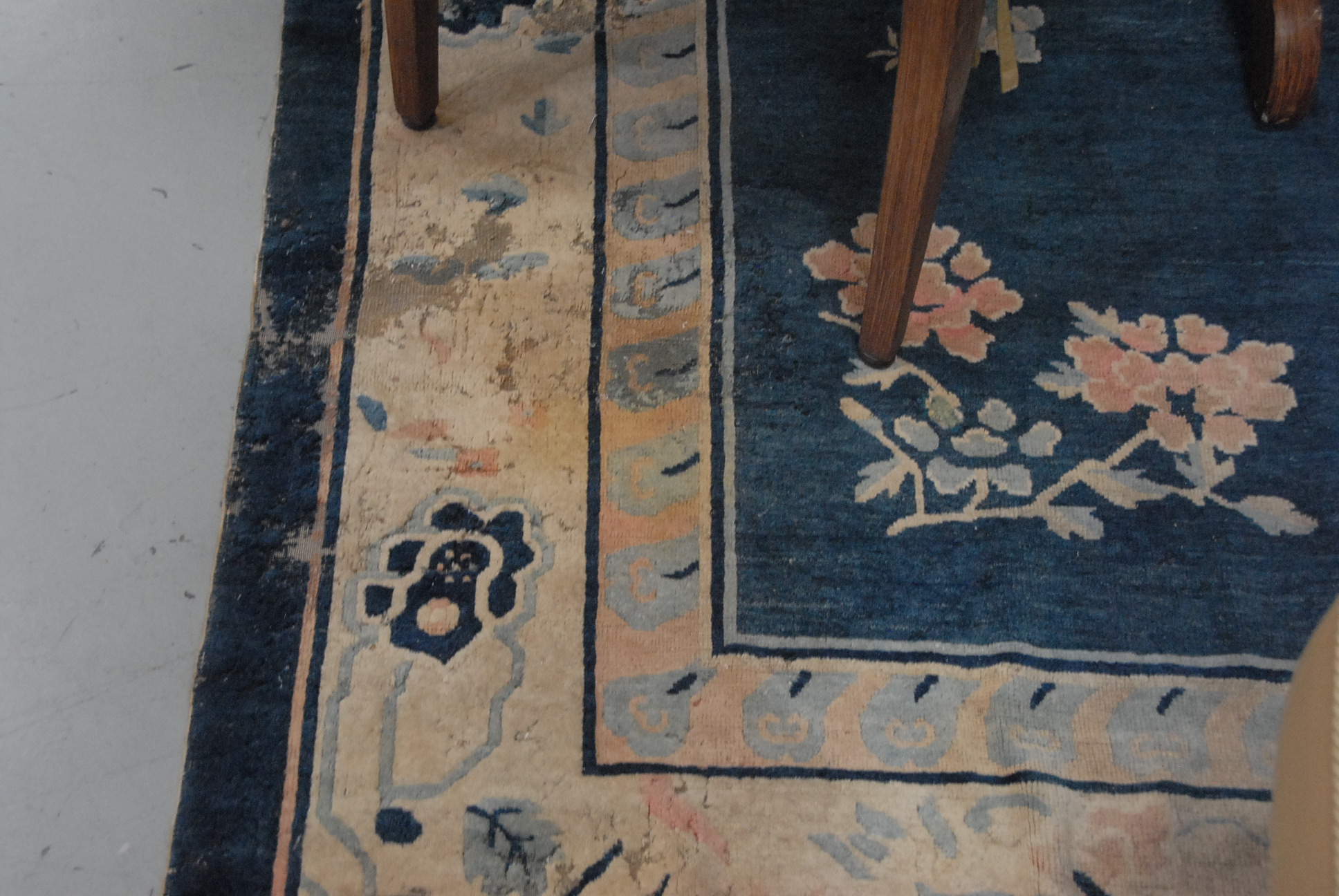 Chinese Oriental blue and white room sized rug moth damage, 8′ x 9’7.